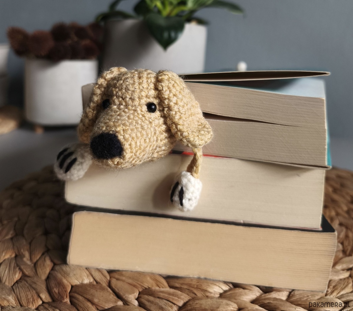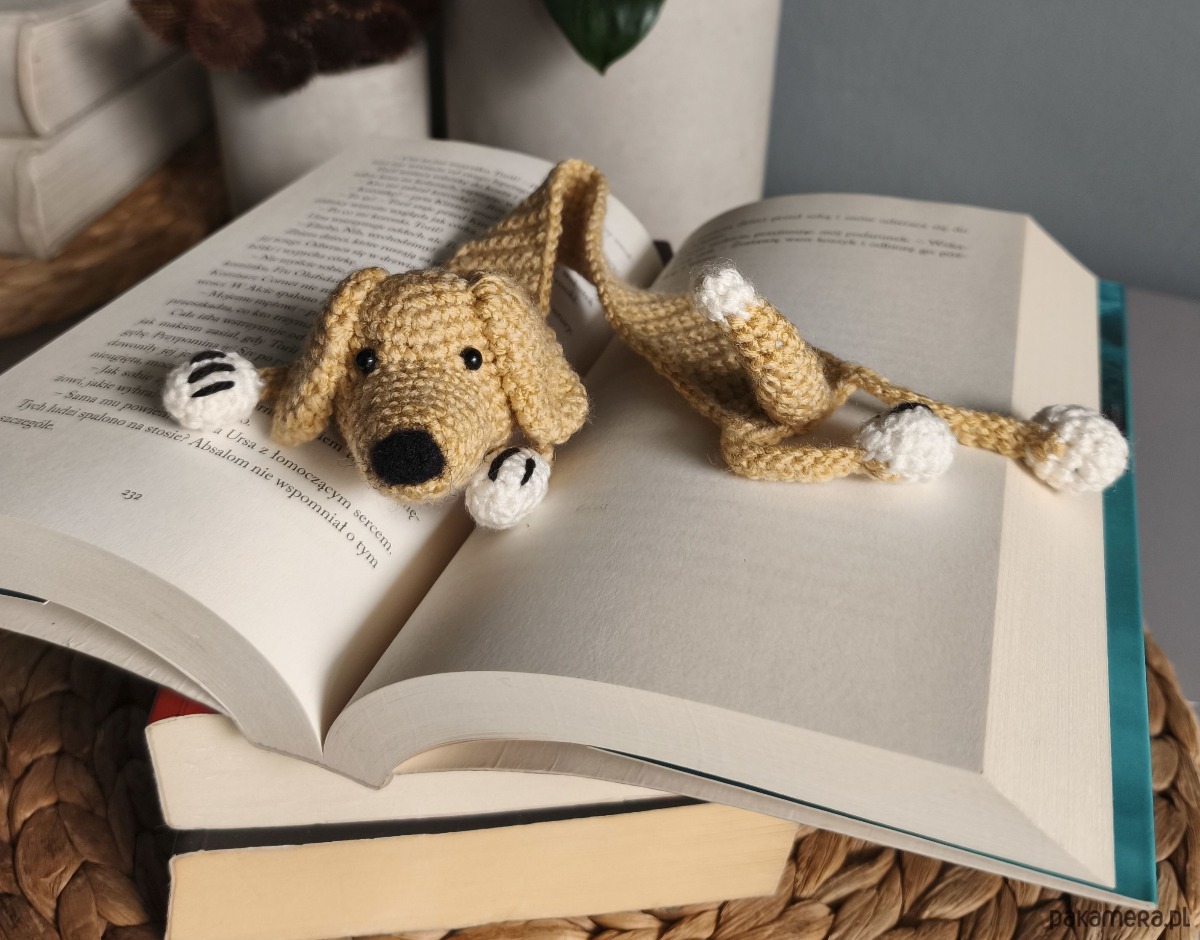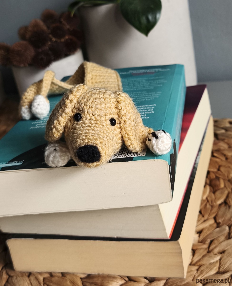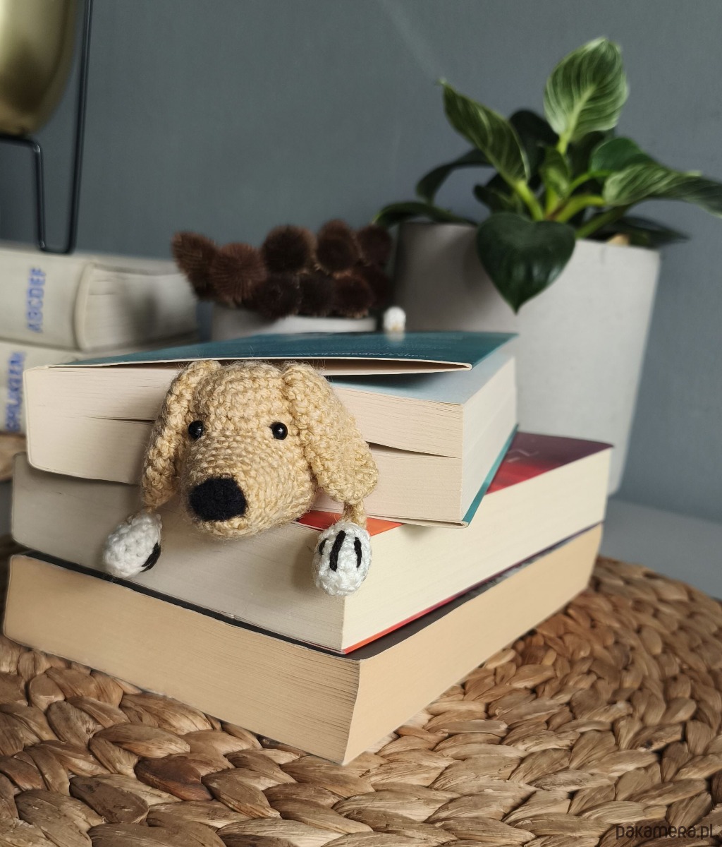 Zakładka do książki z sympatycznym pieskiem wykonana z włóczki na szydełku.