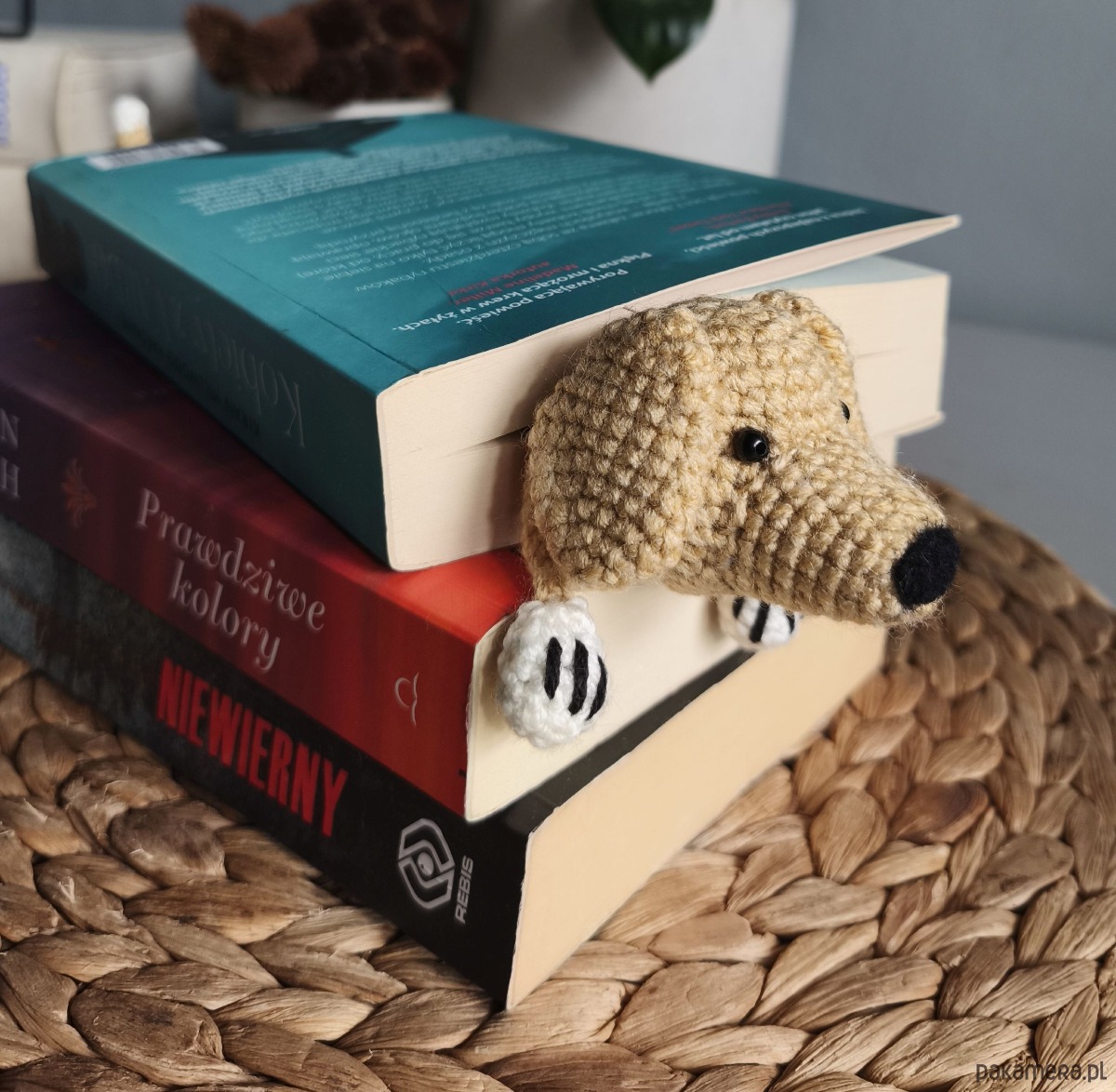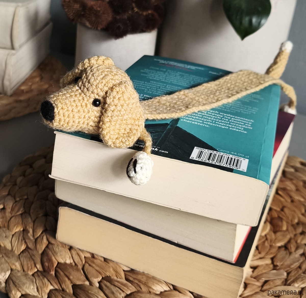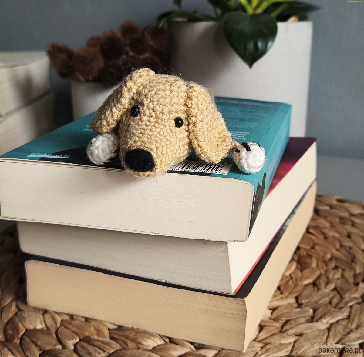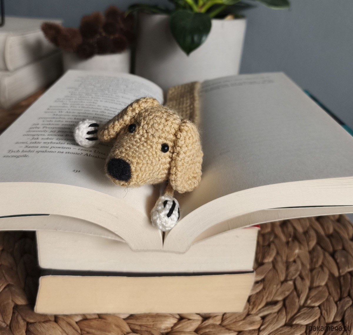 Zakładka do książki z sympatycznym pieskiem wykonana z włóczki na szydełku.