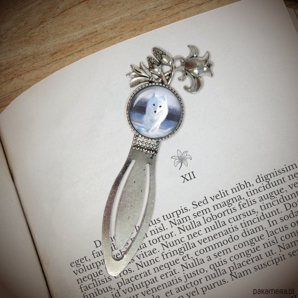 Grafika ukryta w pięknie zdobionej motywem lilii, romantycznej zakładce do książki pod osłoną przeźroczystego półokrągłego szkiełka.