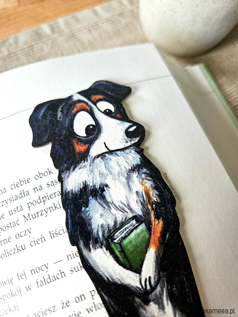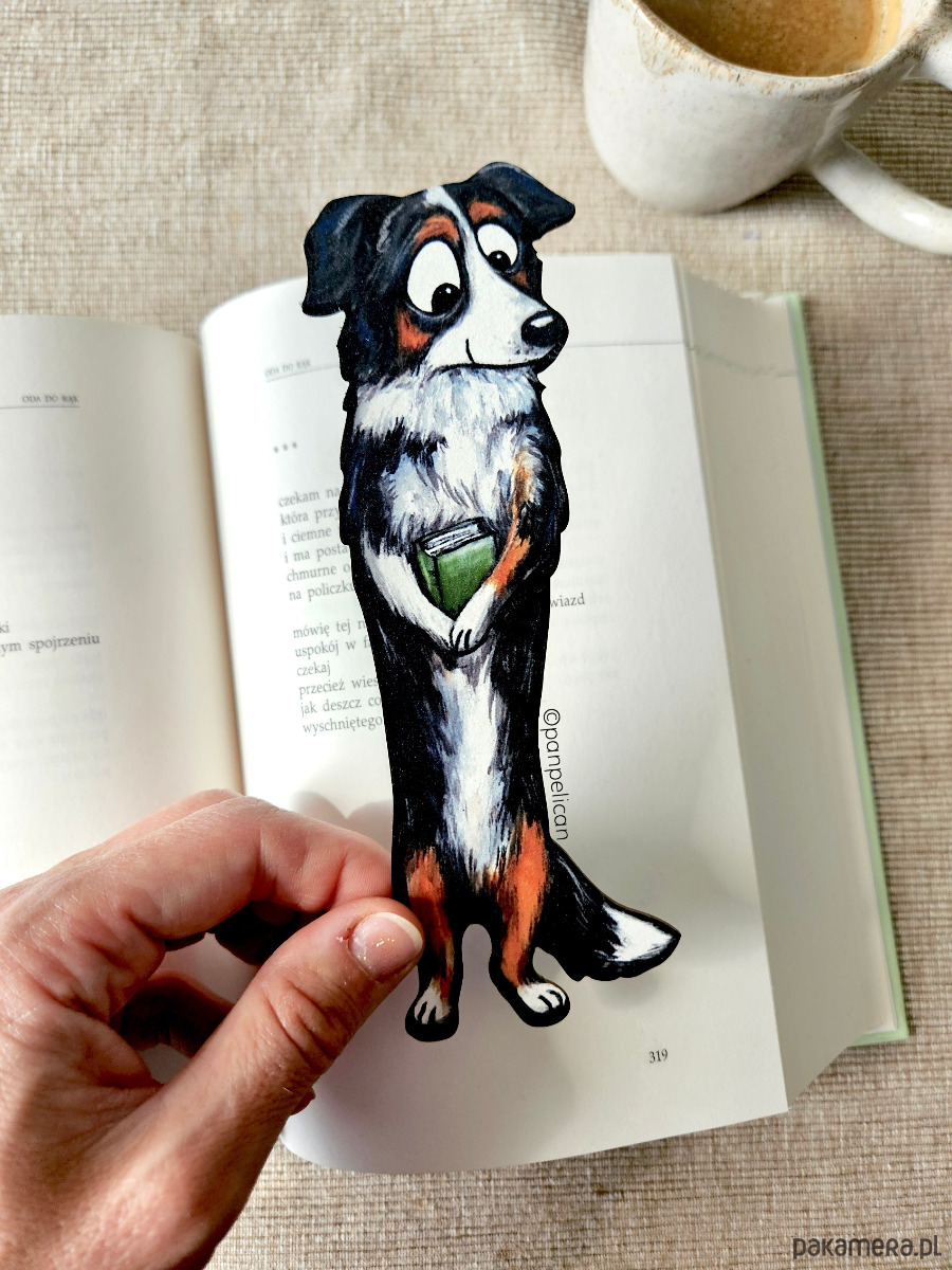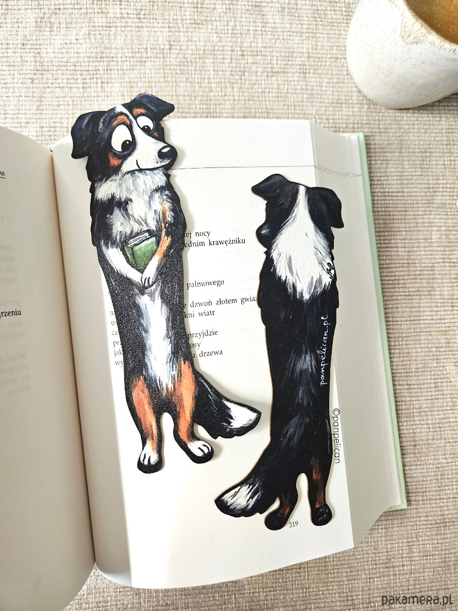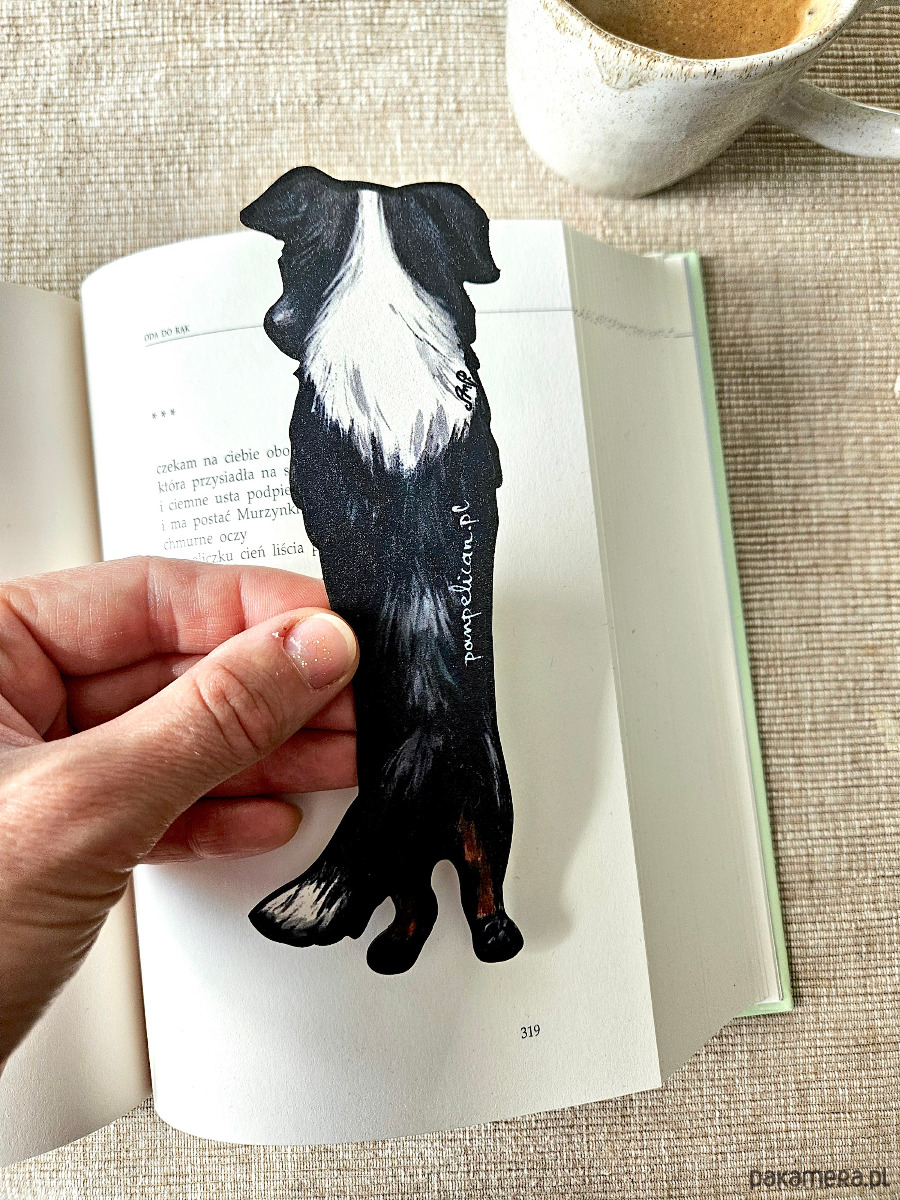 Autorska dwustronna zakładka do książki „Border Collie”*. Druk na ekotekturze premium, reprodukcja malowanego ręcznie wzoru.
