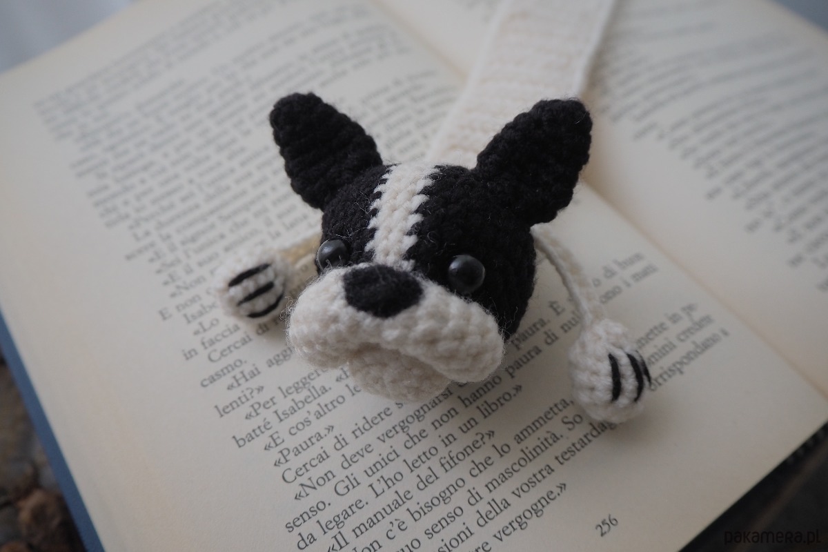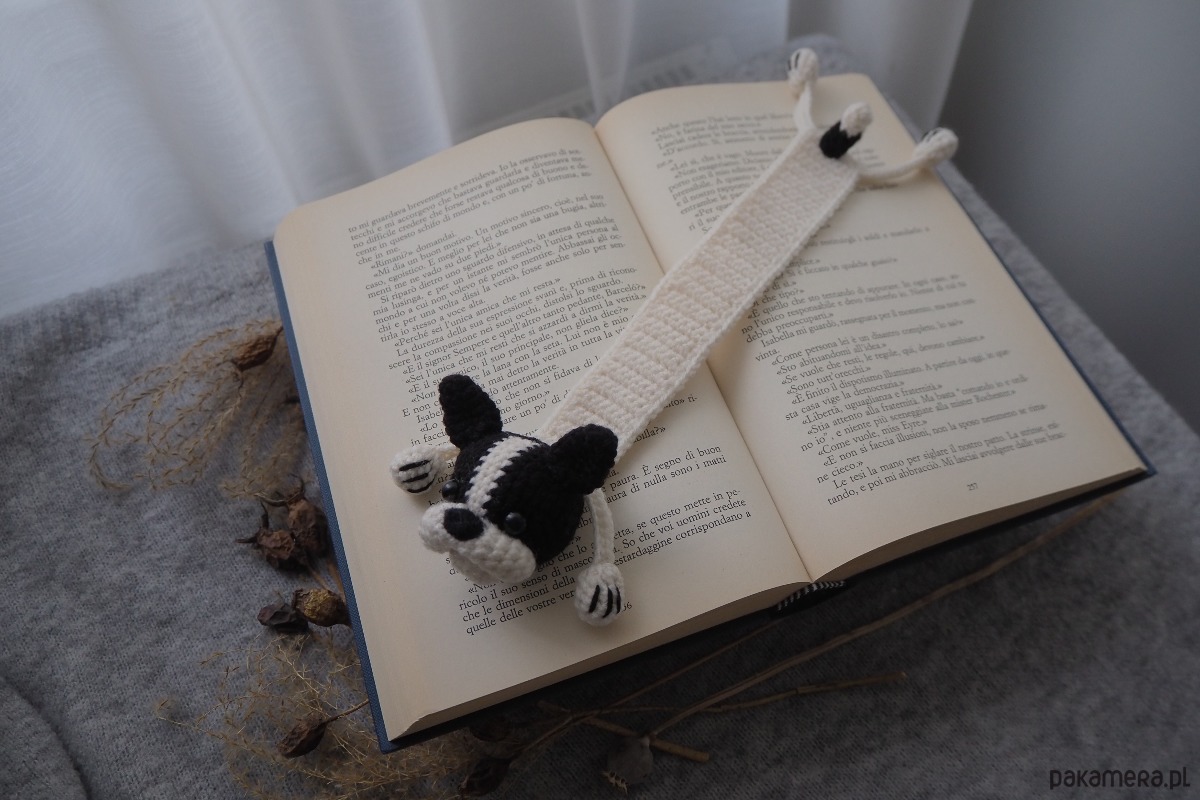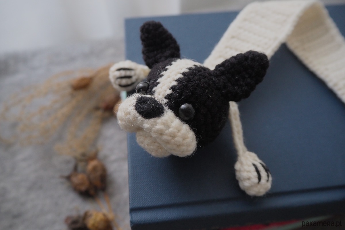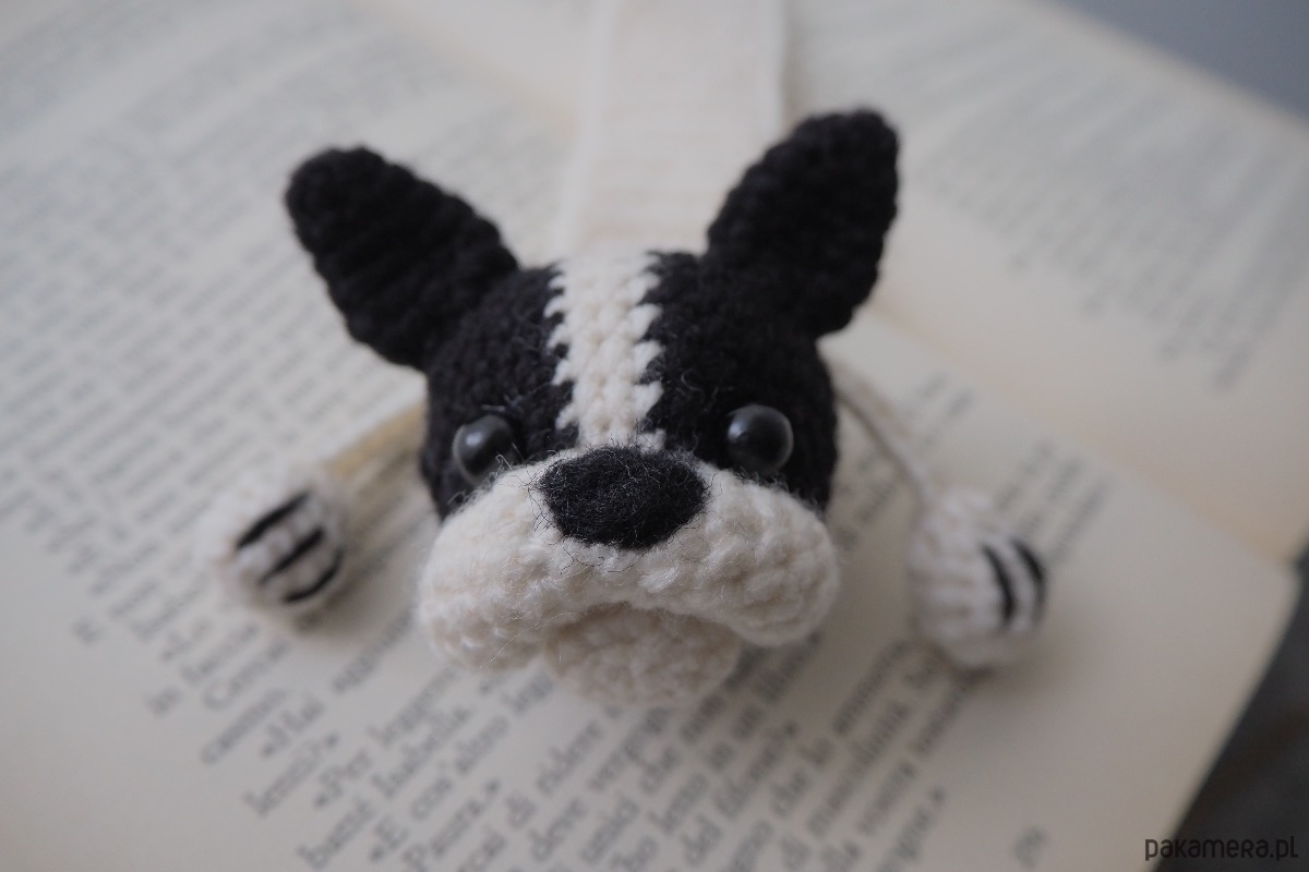Zakładka do książki z sympatycznym pieskiem wykonana z włóczki na szydełku.