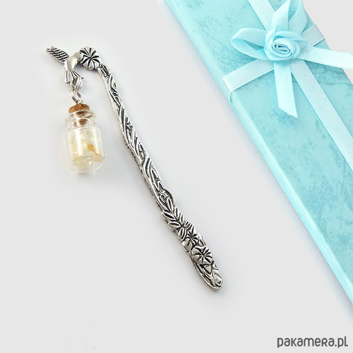Wymiary buteleczki ok. 2x1,5 cm, długość zakładki ok. 12 cm.