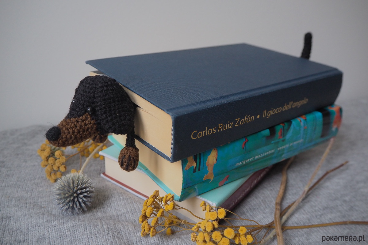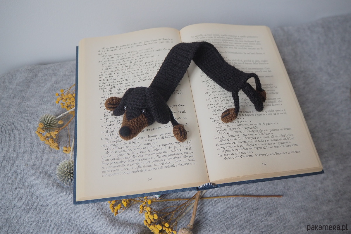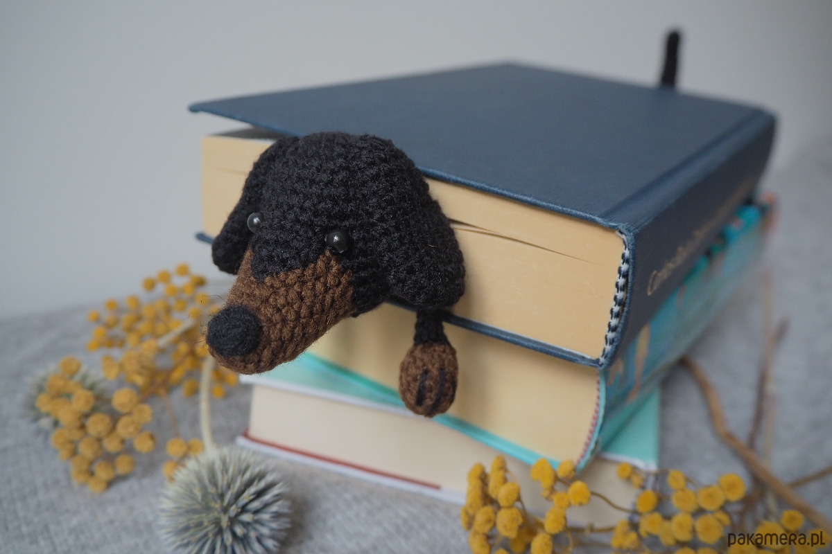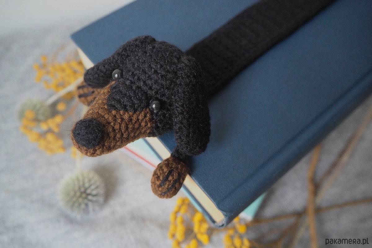 Zakładka do książki z sympatycznym pieskiem wykonana z włóczki na szydełku.