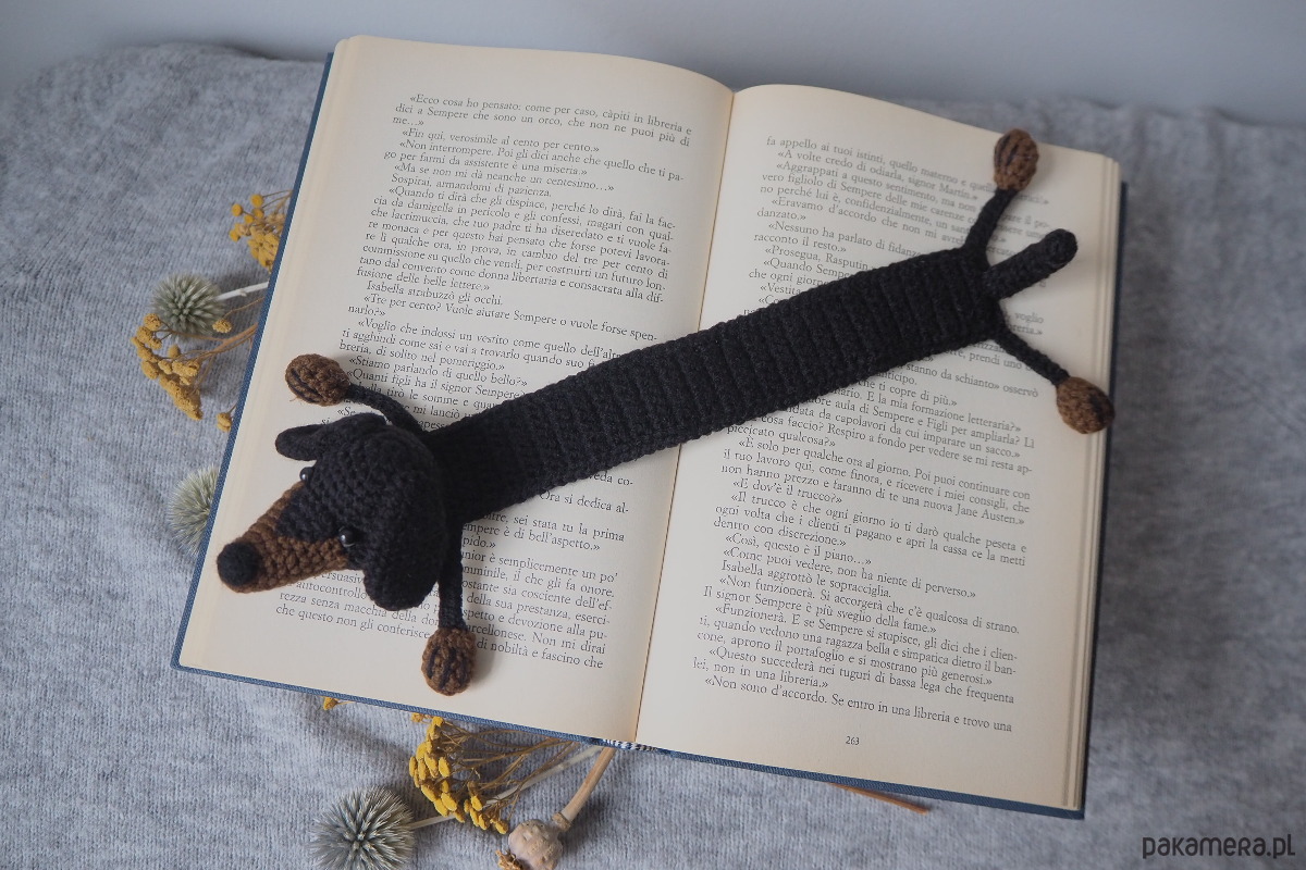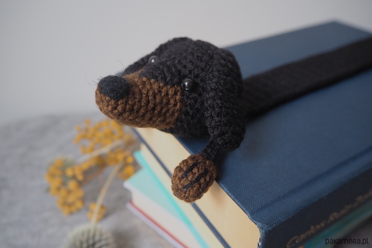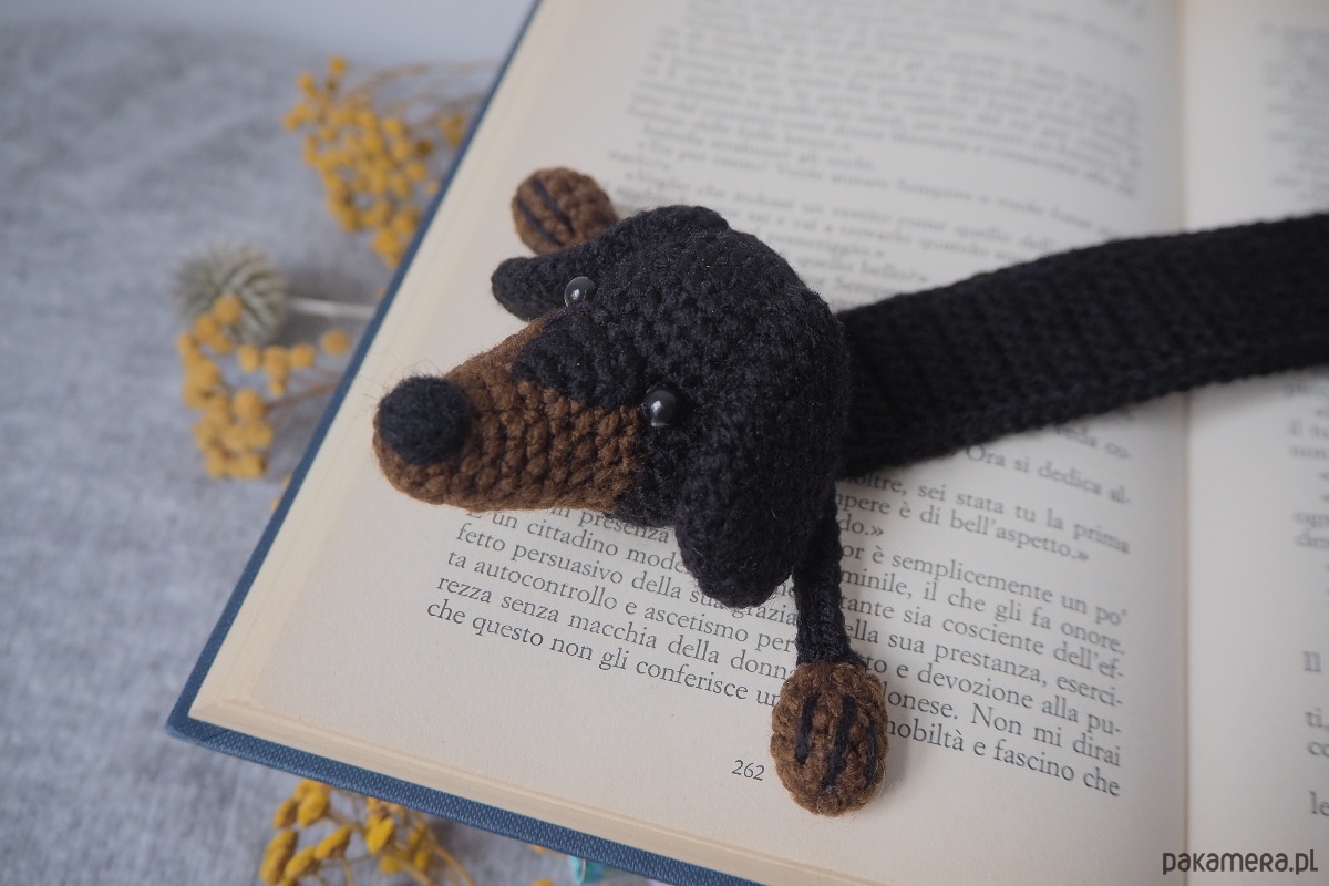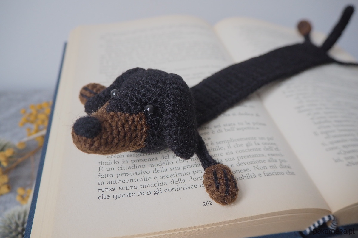 Zakładka do książki z sympatycznym pieskiem wykonana z włóczki na szydełku.
