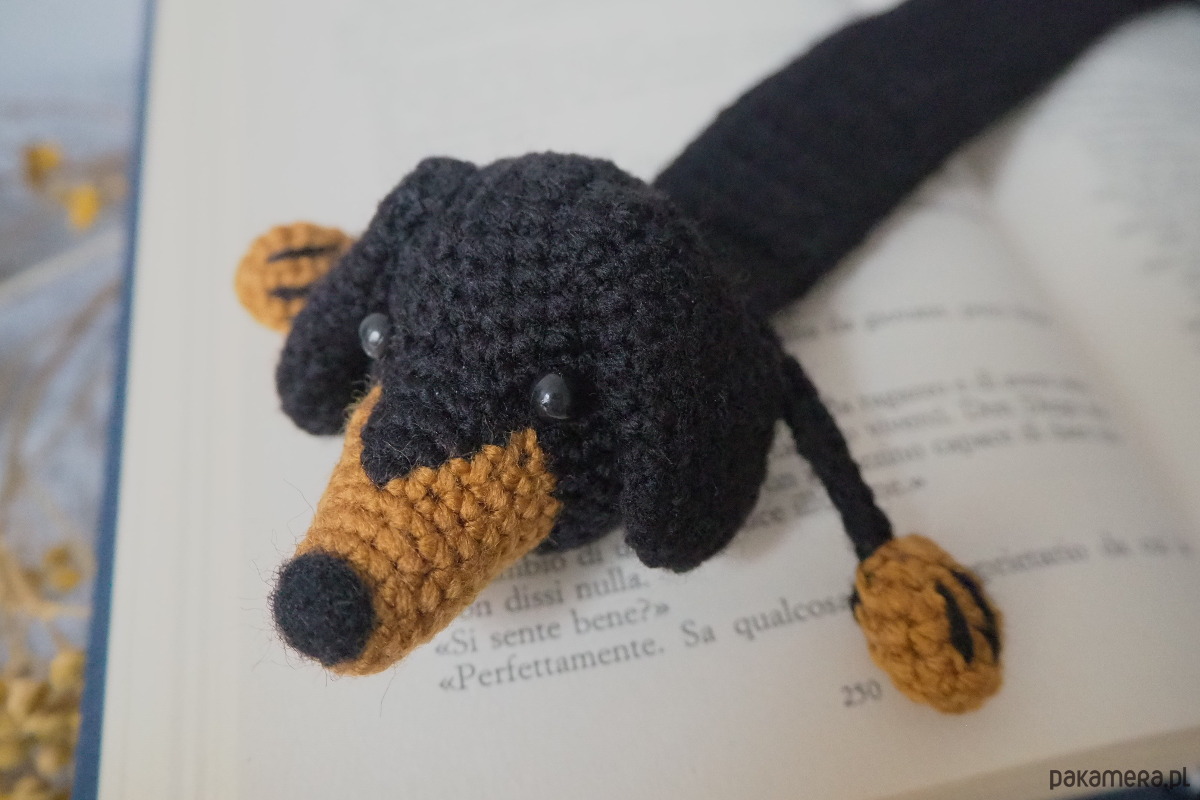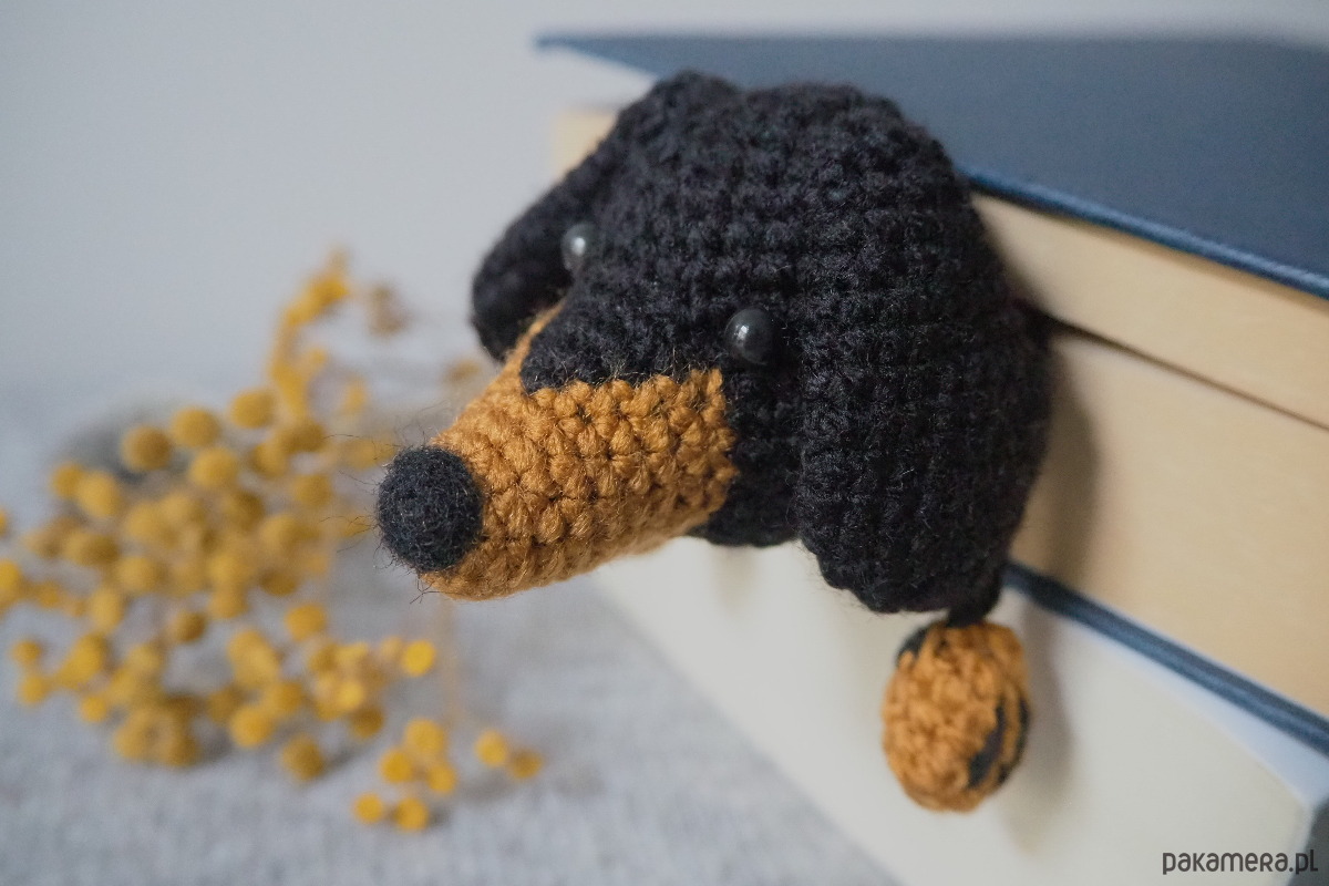 Zakładka do książki z sympatycznym pieskiem wykonana z włóczki na szydełku.