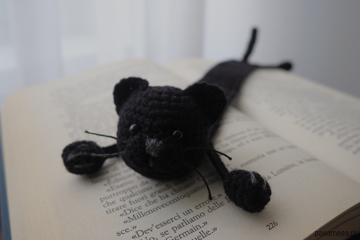 Zakładka do książki z sympatycznym kotem wykonana z włóczki na szydełku.