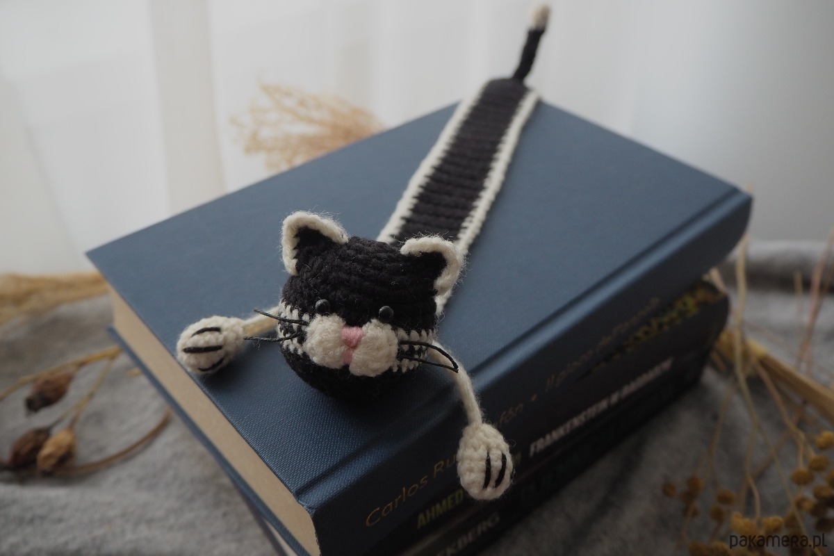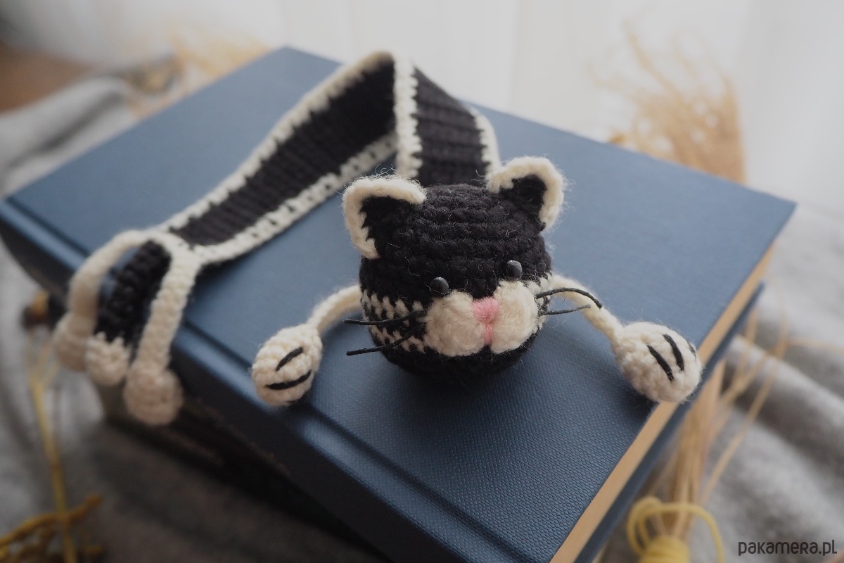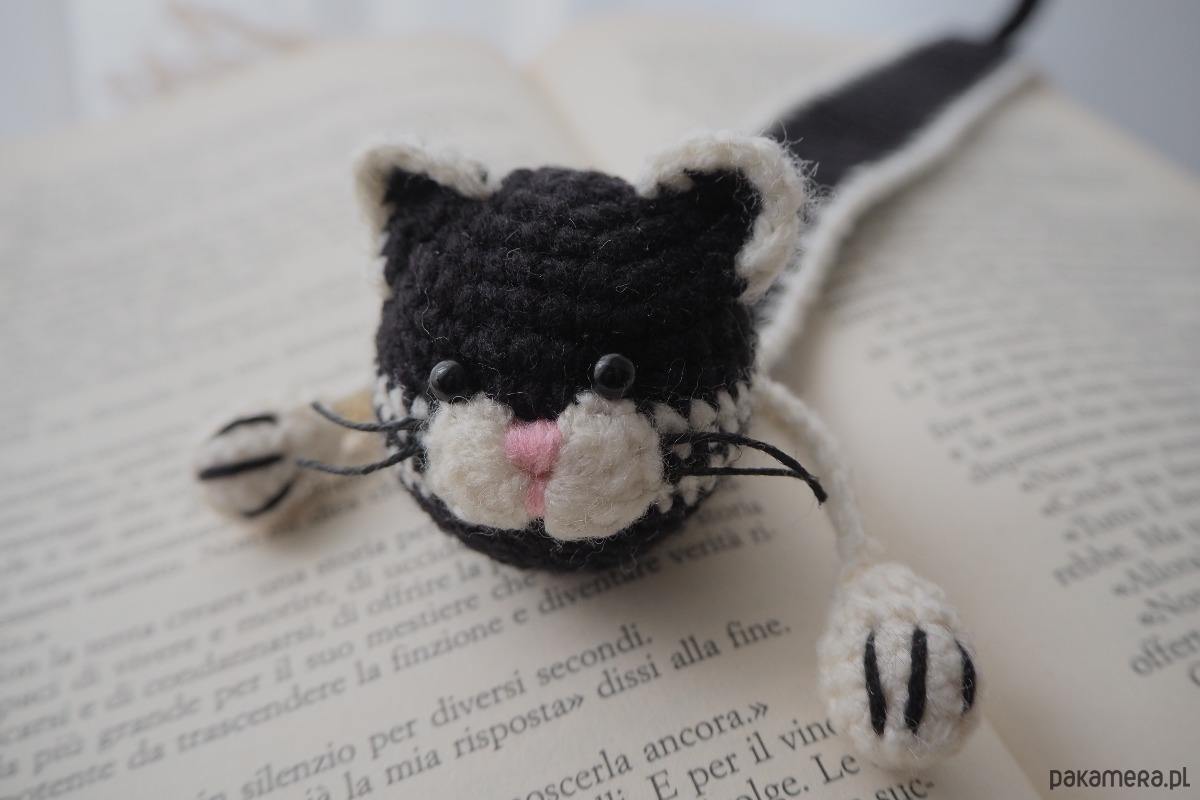 Zakładka do książki z sympatycznym kotem wykonana z włóczki na szydełku.