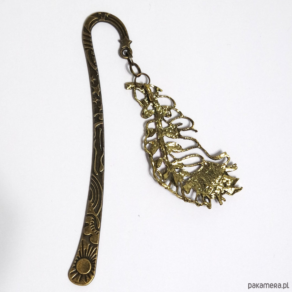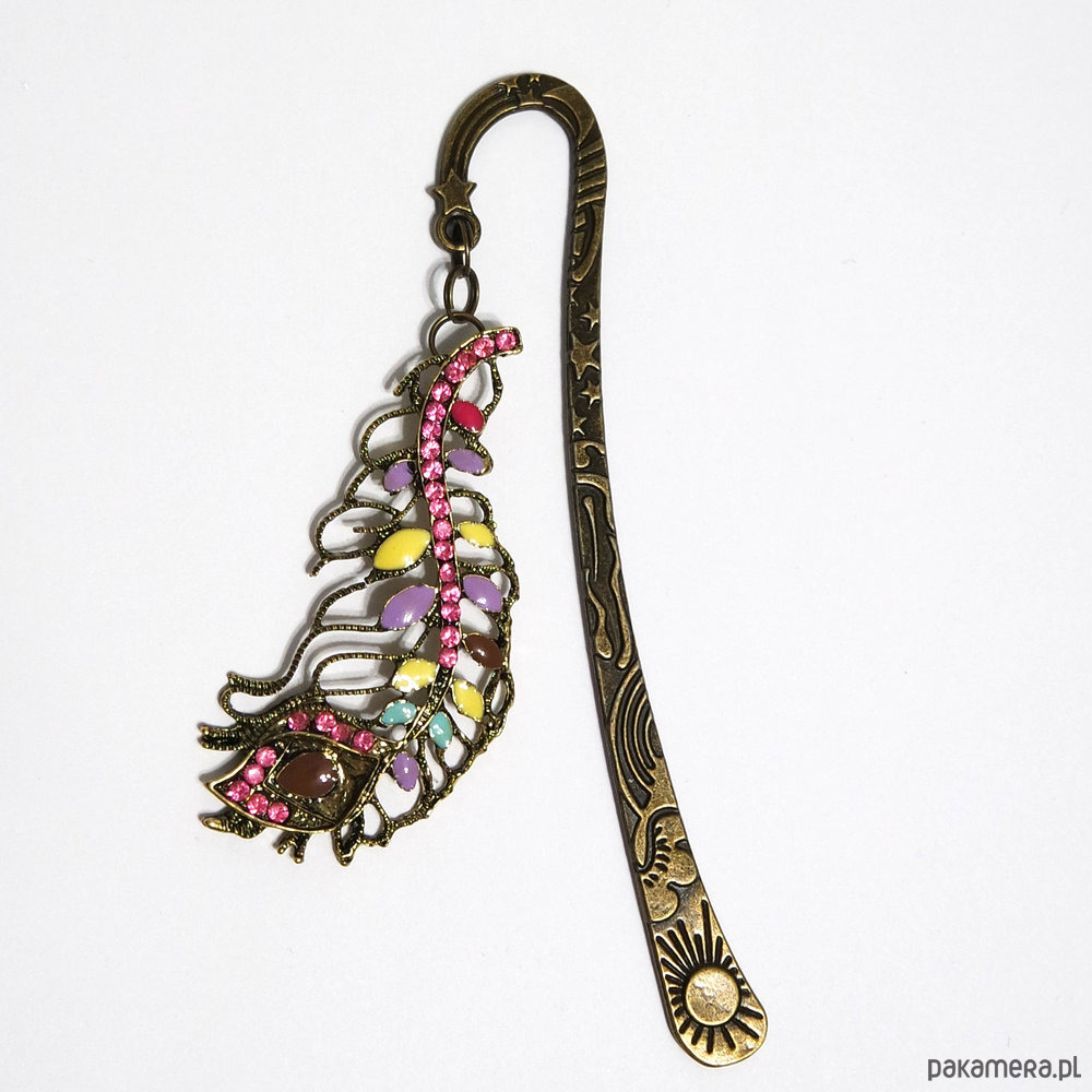 Zakładka wykonana jest z metalu w kolorze antycznego brązu, piórko jest wykończone w kolorze złotym.