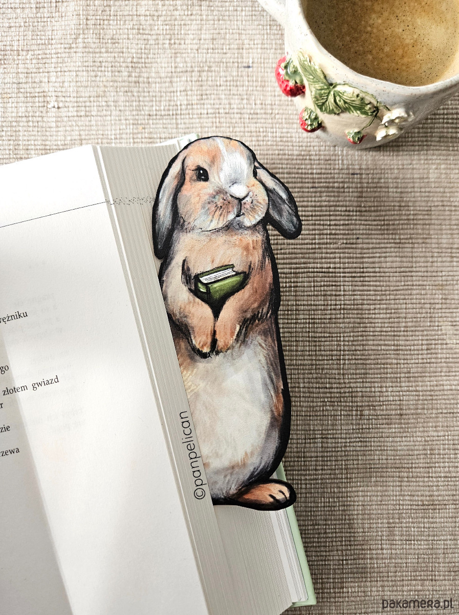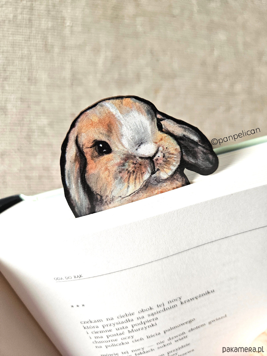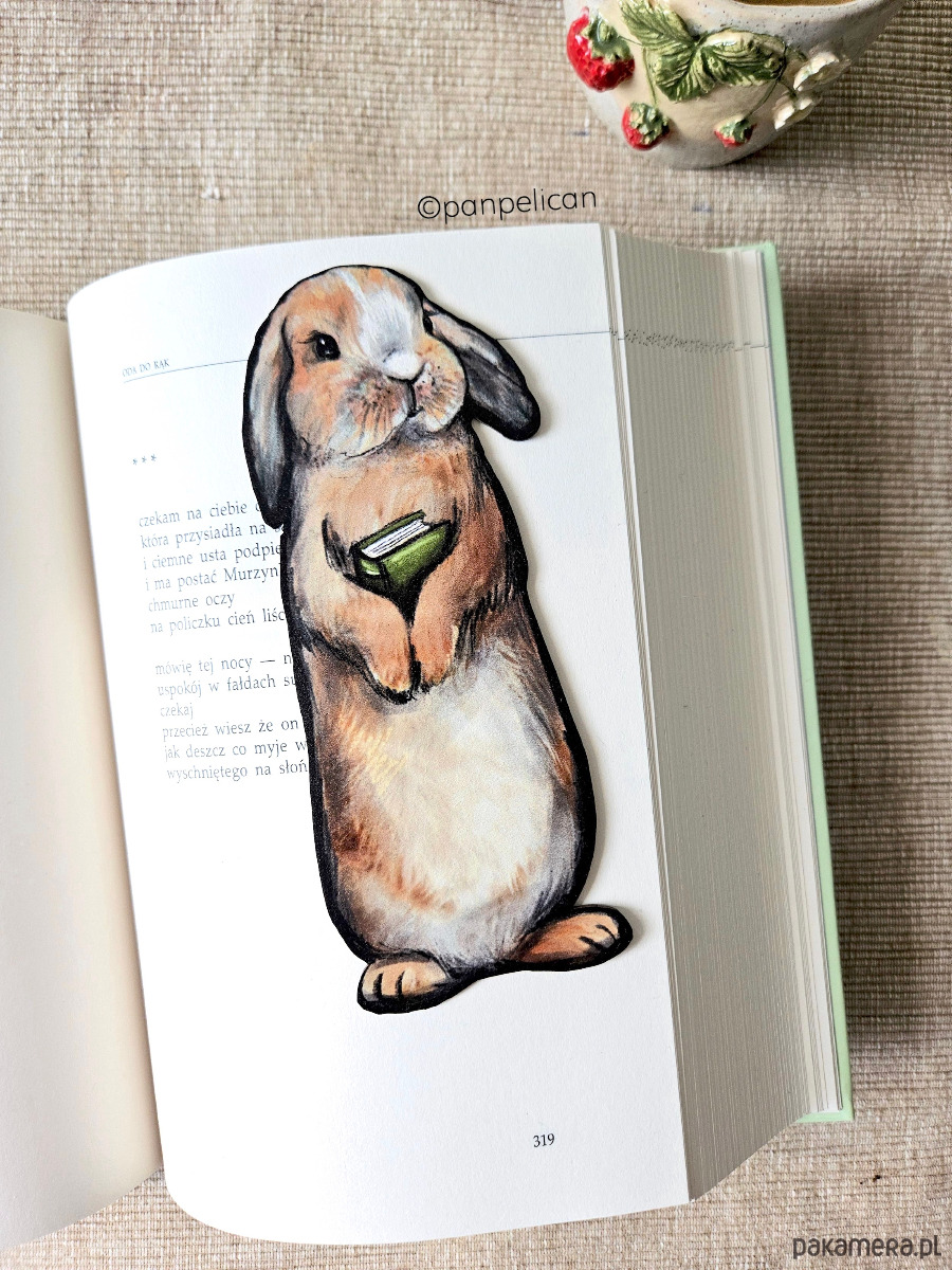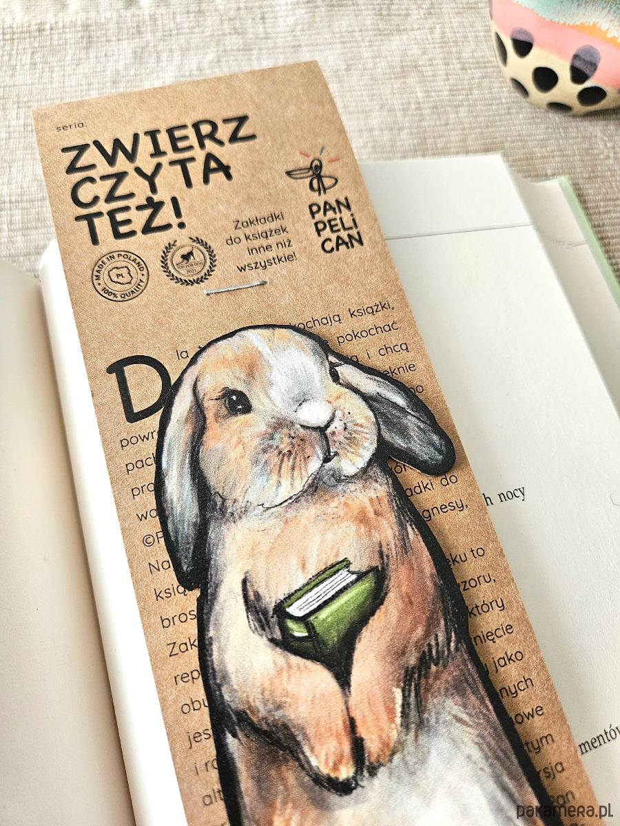 Autorska dwustronna zakładka do książki „Królik Vincent”*. Druk UV na ekotekturze premium, reprodukcja malowanego ręcznie wzoru.
