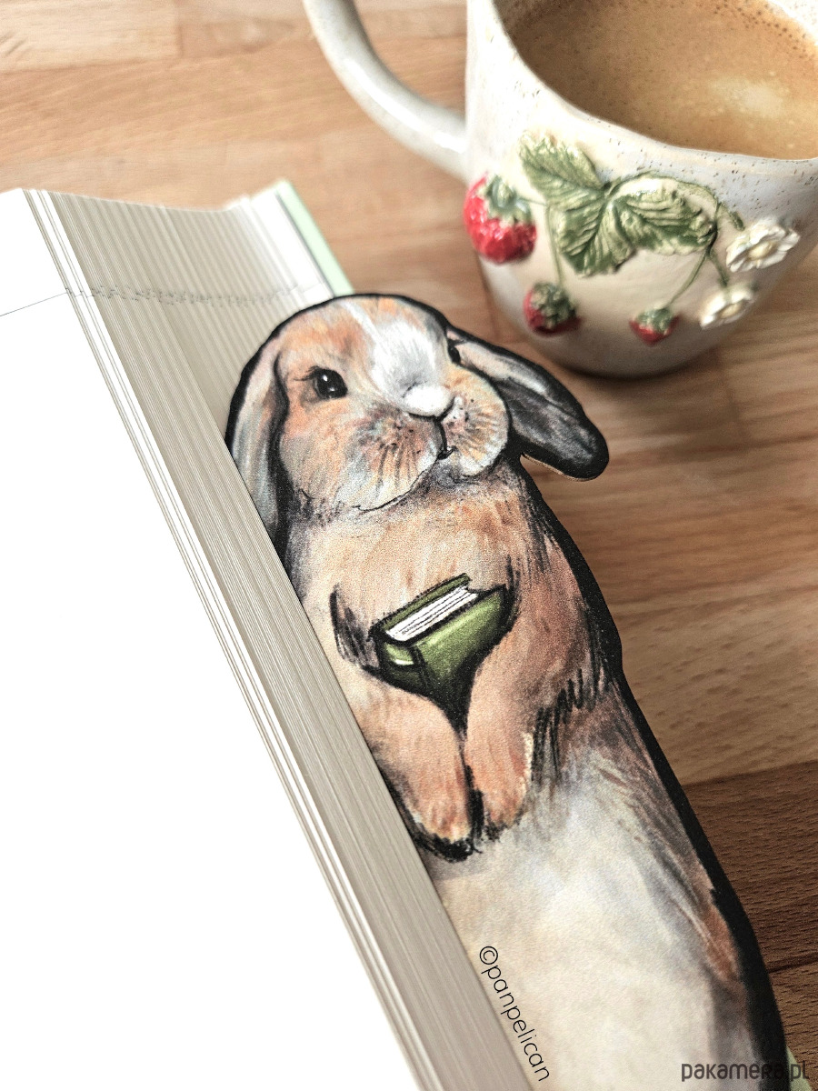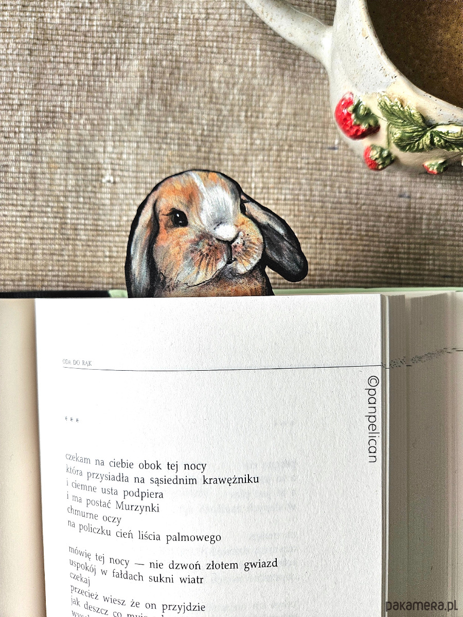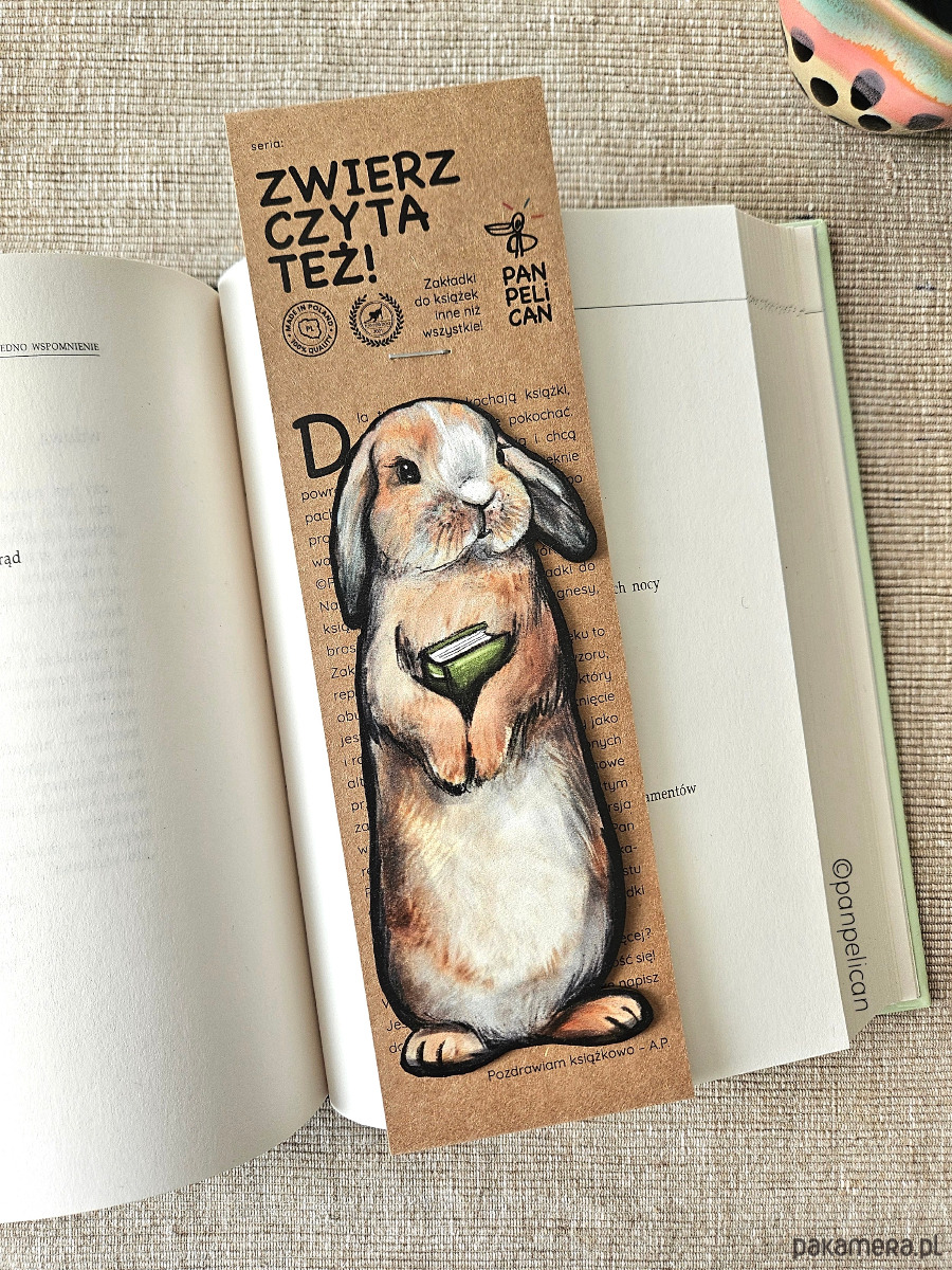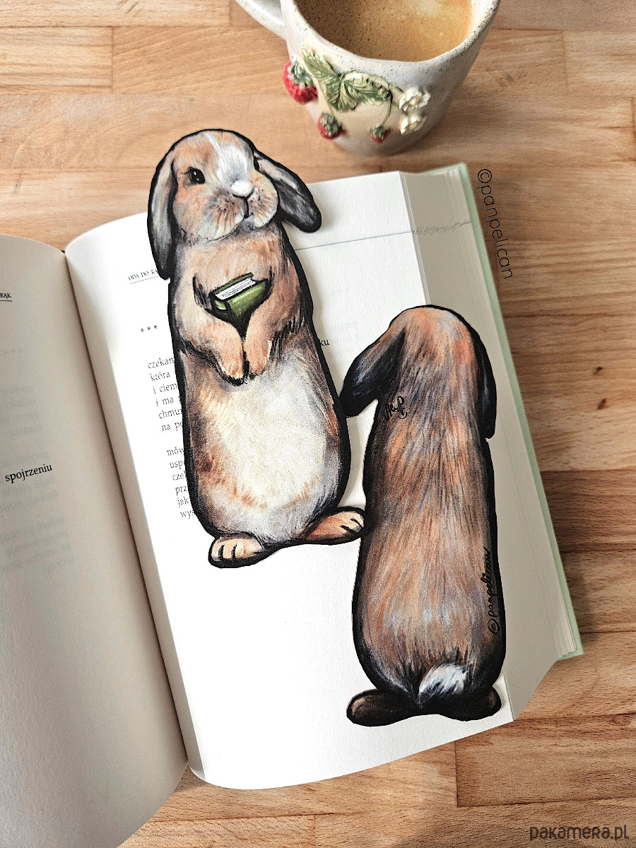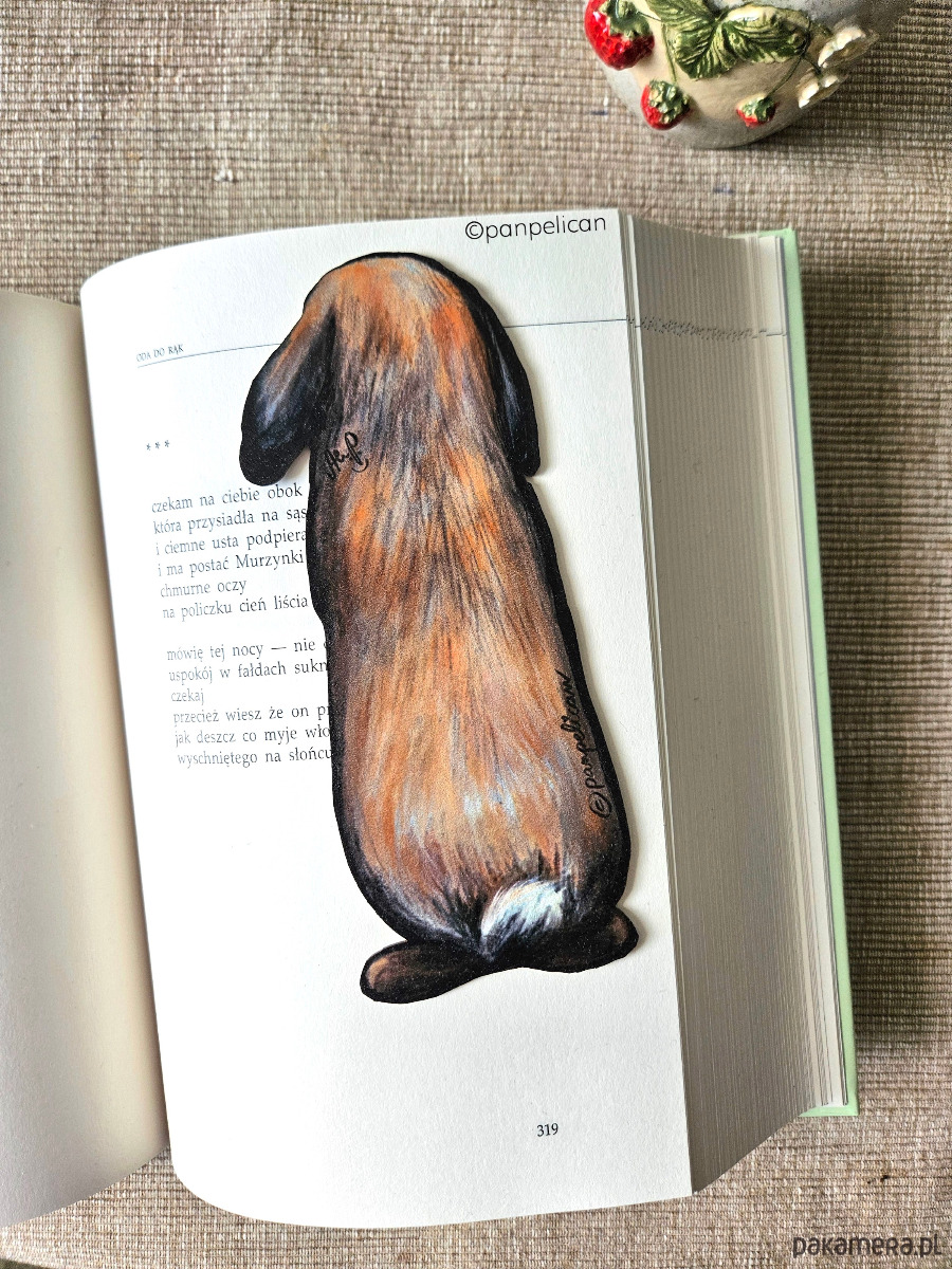 Autorska dwustronna zakładka do książki „Królik Vincent”*. Druk UV na ekotekturze premium, reprodukcja malowanego ręcznie wzoru.