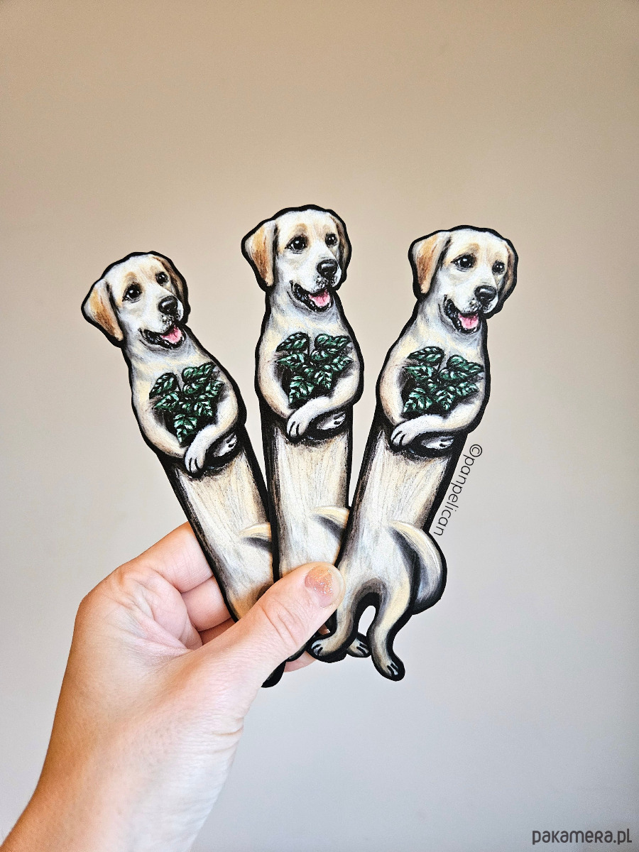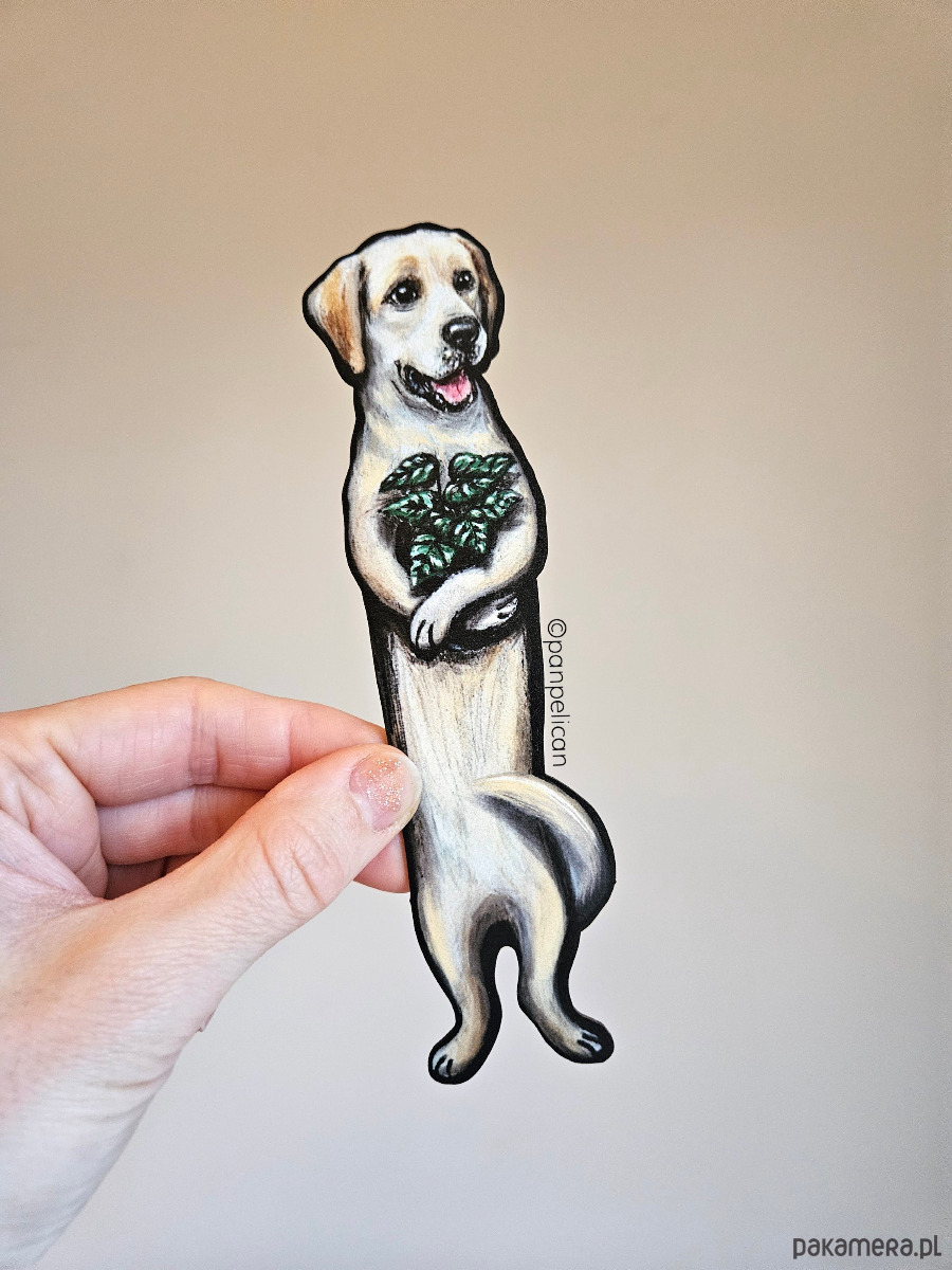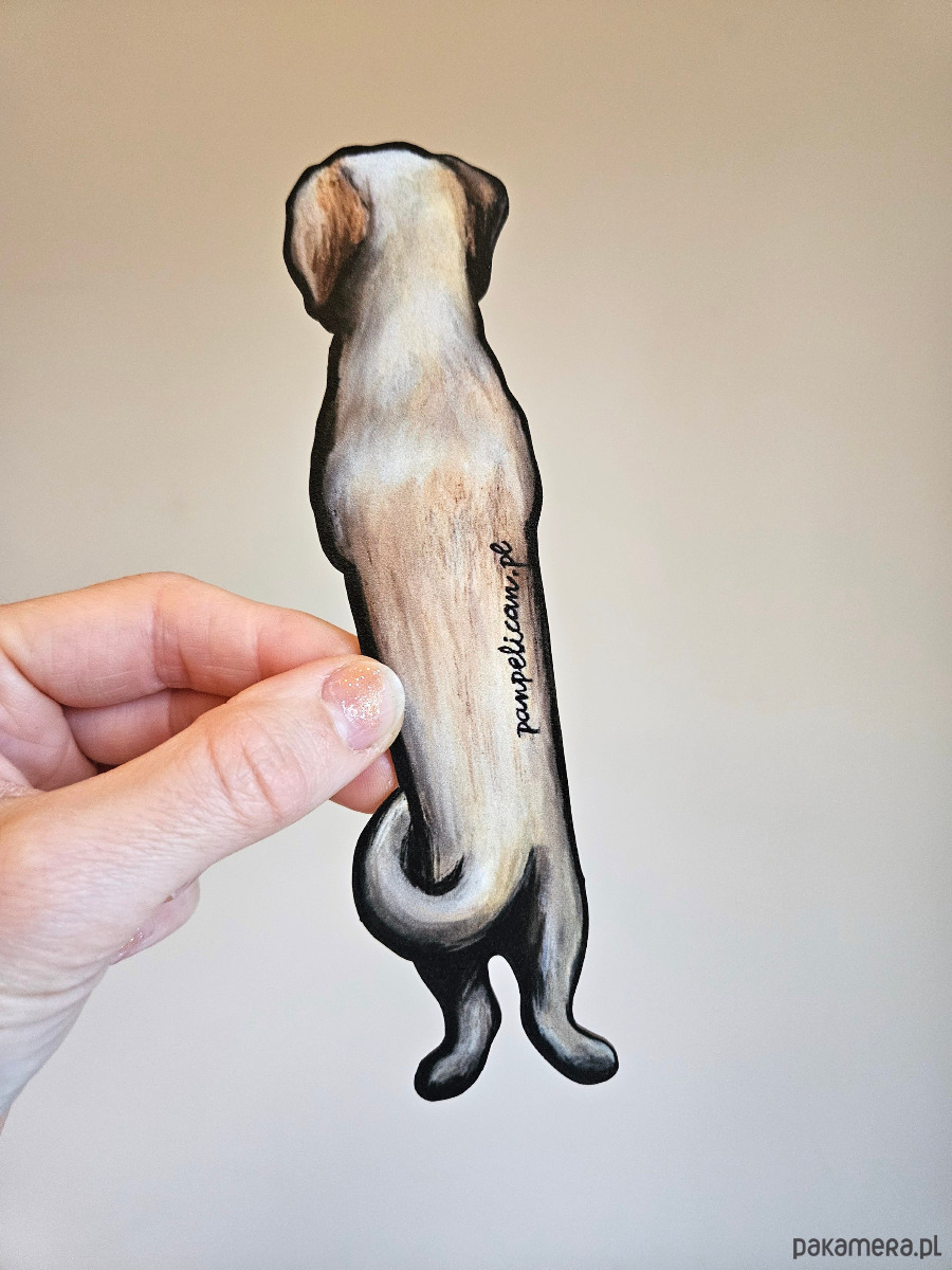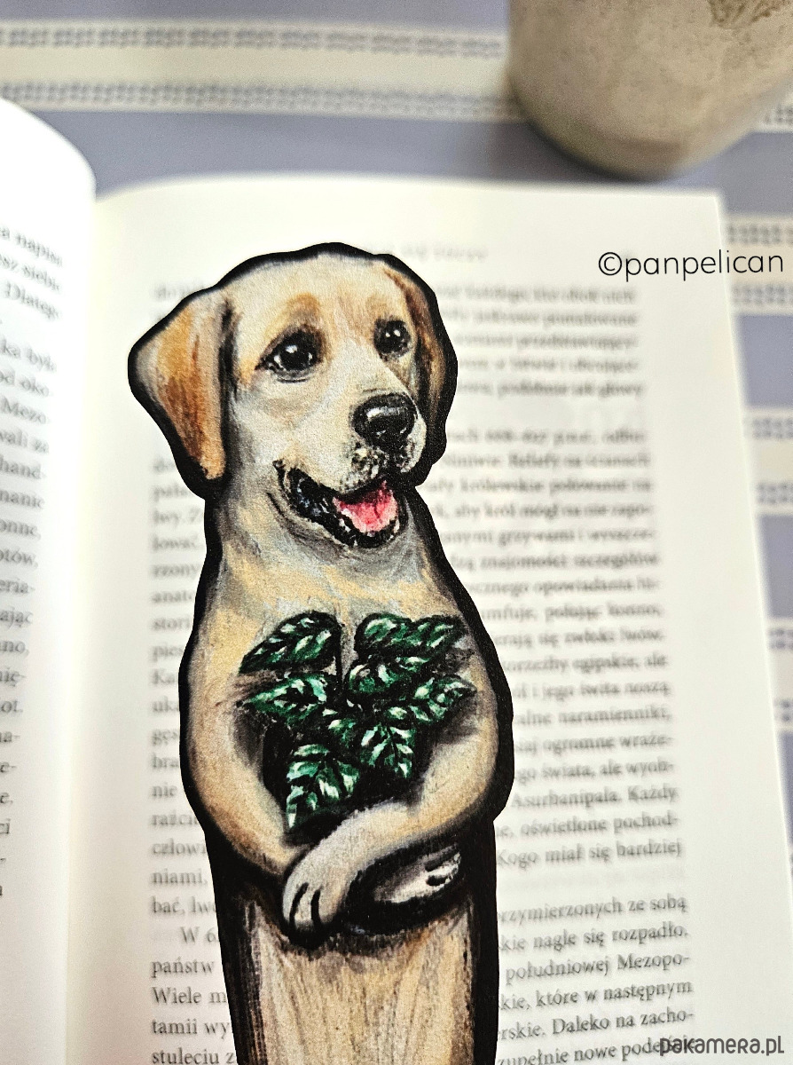 Autorska dwustronna zakładka do książki „abrador Rockie”*. Druk na ekotekturze premium, reprodukcja malowanego ręcznie wzoru.