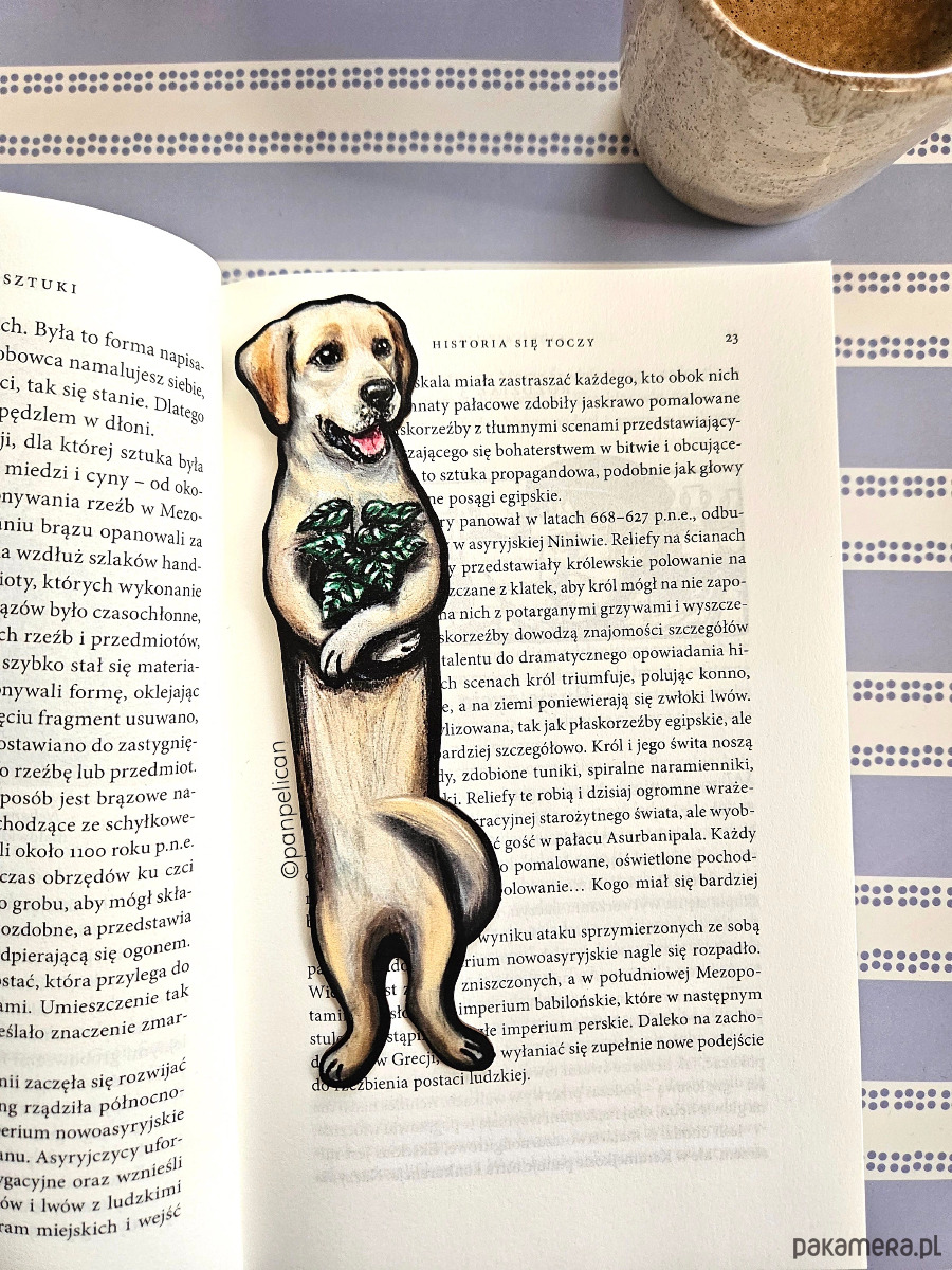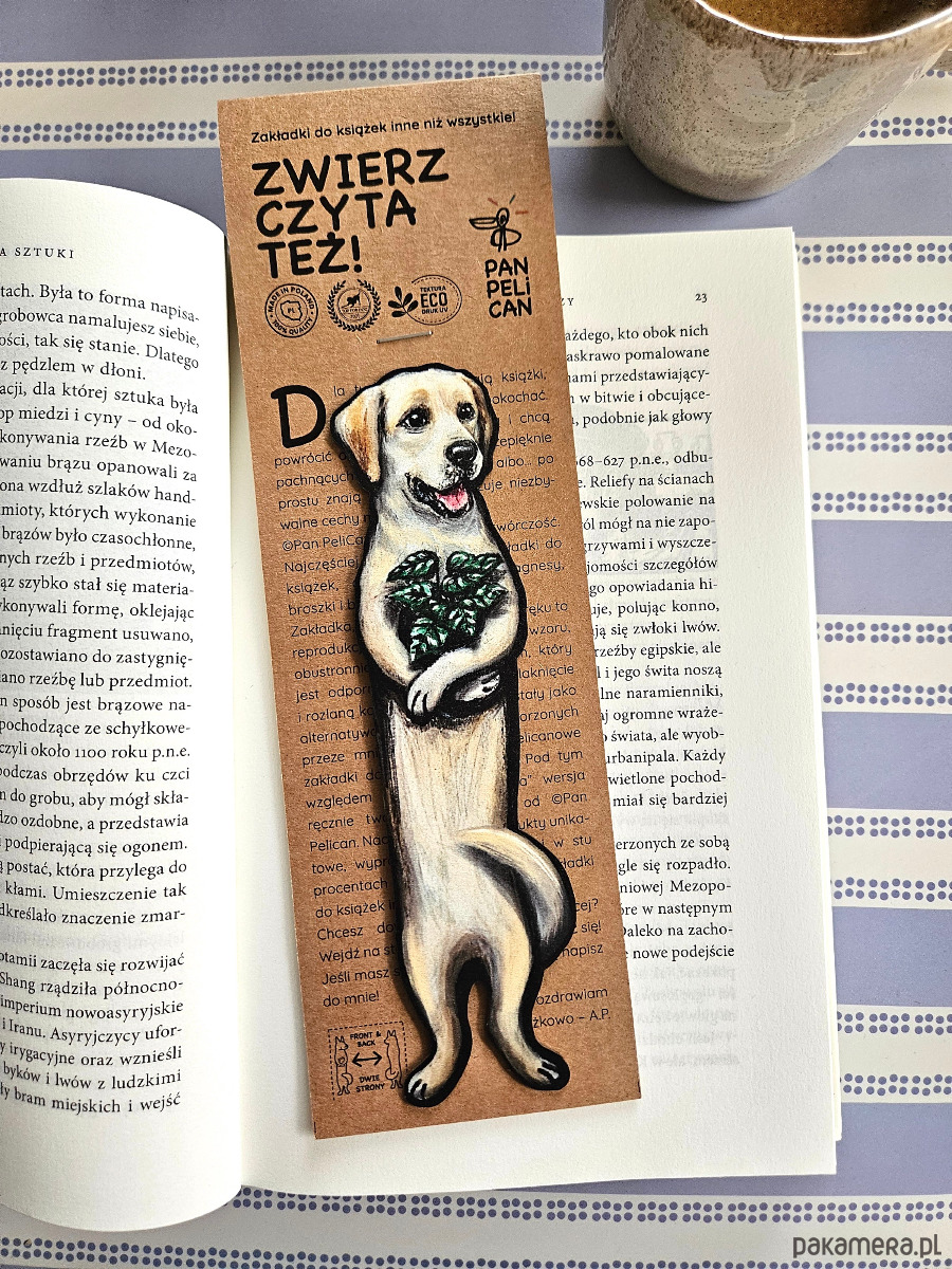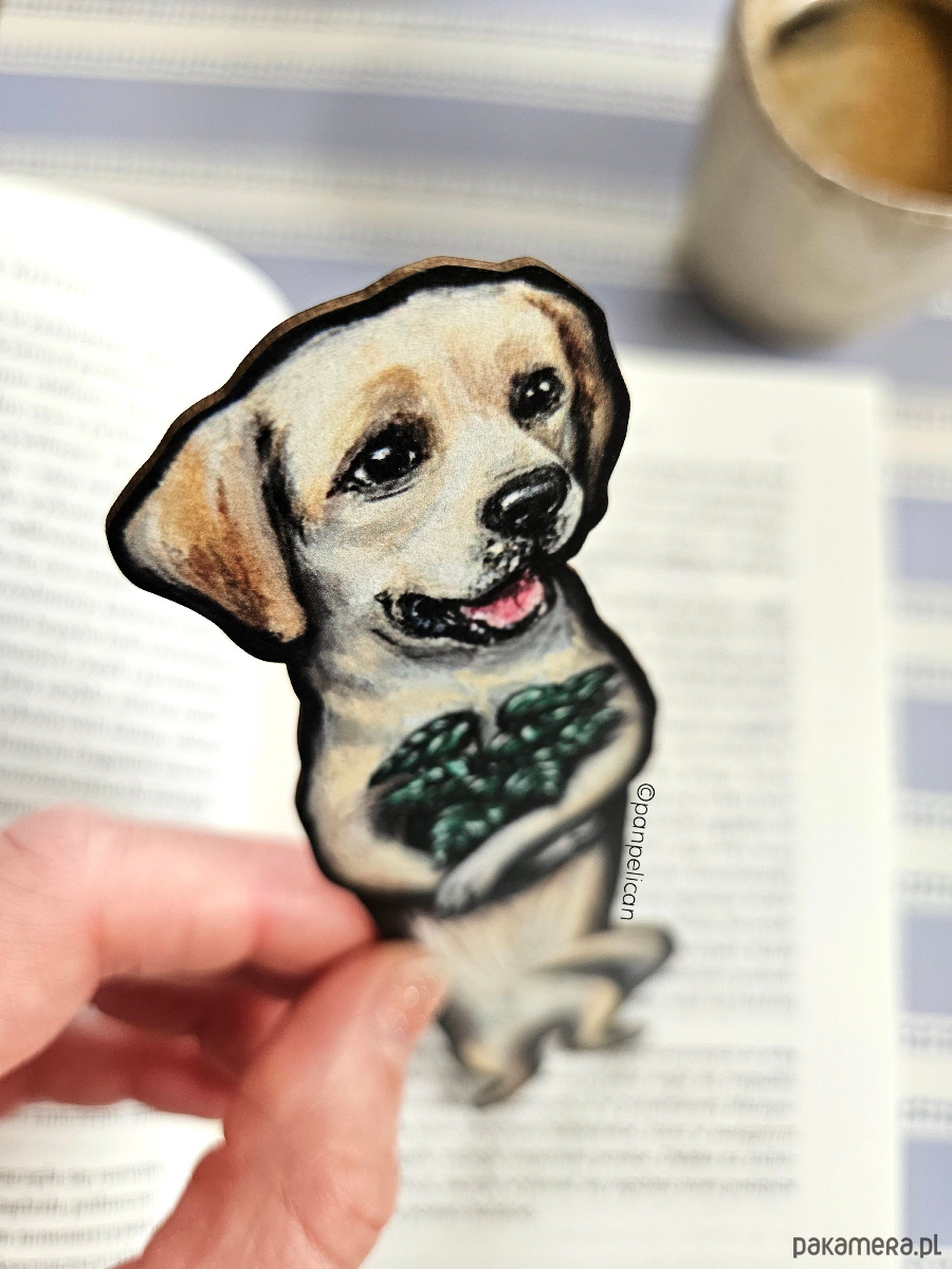 Autorska dwustronna zakładka do książki „abrador Rockie”*. Druk na ekotekturze premium, reprodukcja malowanego ręcznie wzoru.