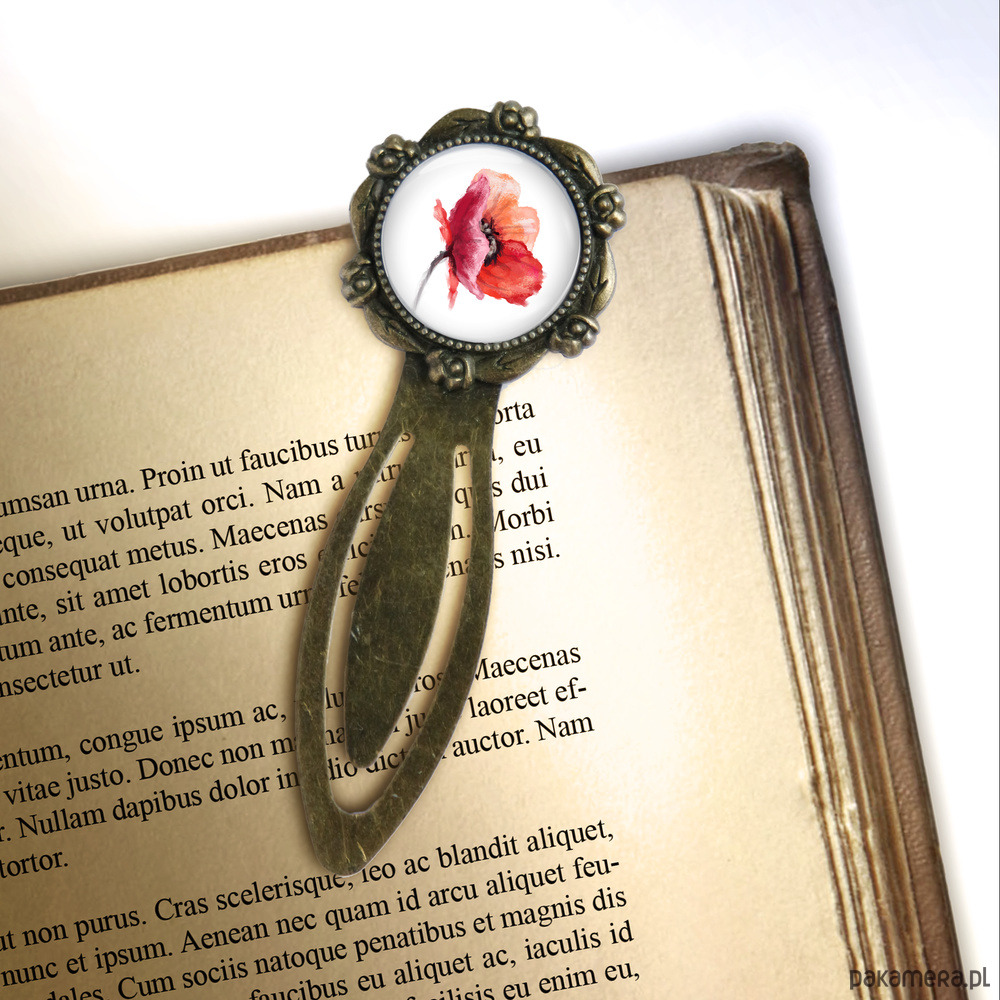 Grafika ukryta w pięknie zdobionej retro zakładce do książki pod osłoną przeźroczystego półokrągłego szkiełka.