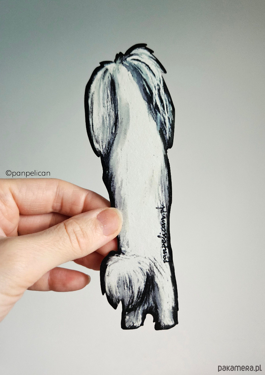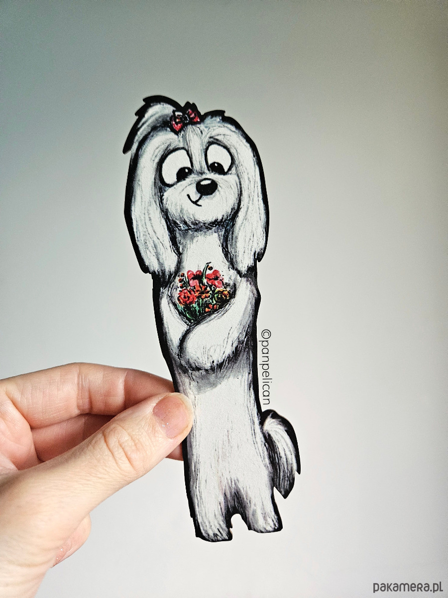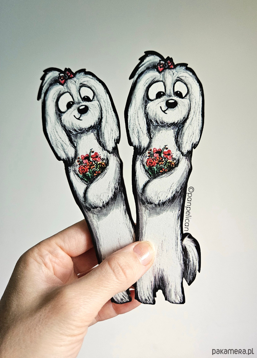 Autorska dwustronna zakładka do książki "Maltańczyk Nala”*. Druk na ekotekturze premium, reprodukcja malowanego ręcznie wzoru.