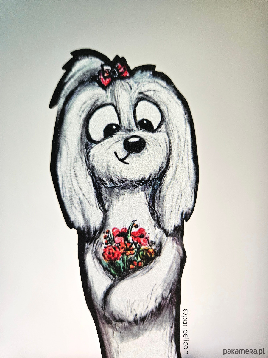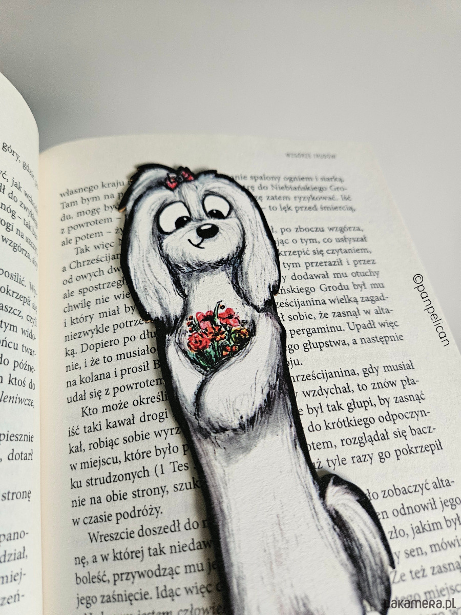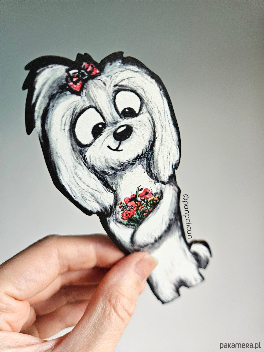 Autorska dwustronna zakładka do książki "Maltańczyk Nala”*. Druk na ekotekturze premium, reprodukcja malowanego ręcznie wzoru.