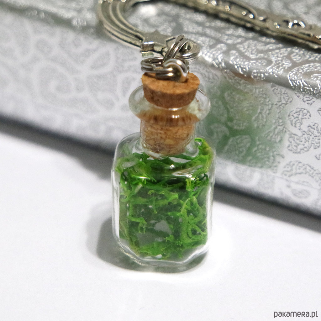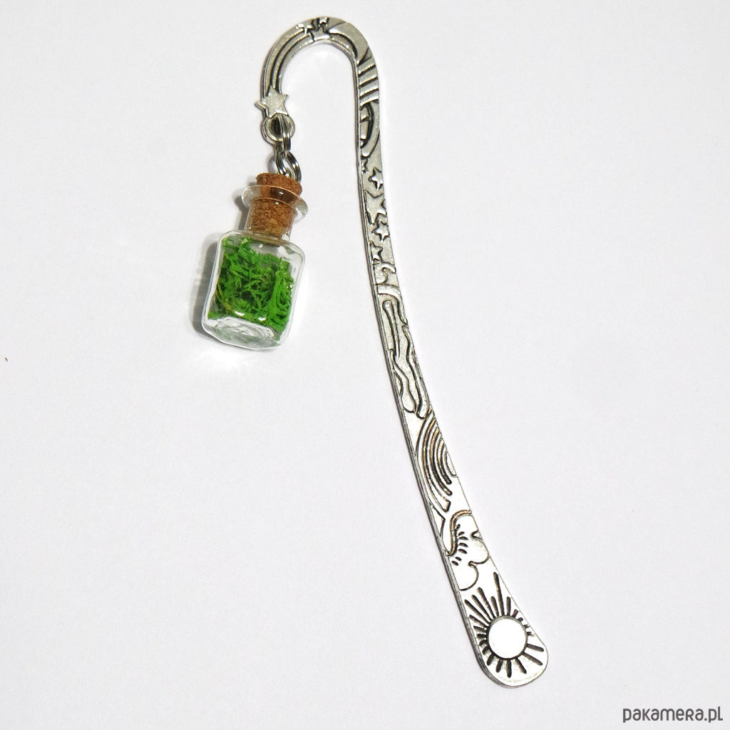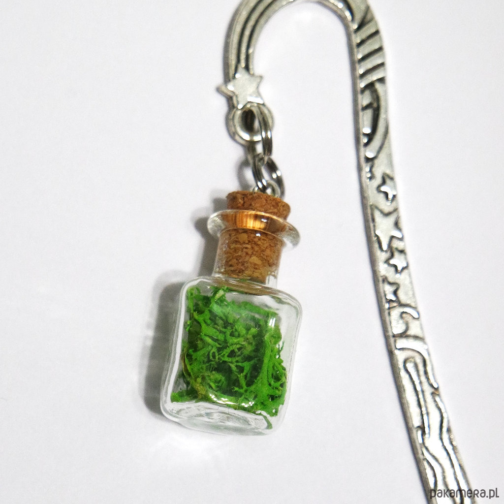 Wyjątkowa zakładka do książki z uroczą, malutką, szklaną buteleczką, wypełnioną mchem i zamkniętą koreczkiem.