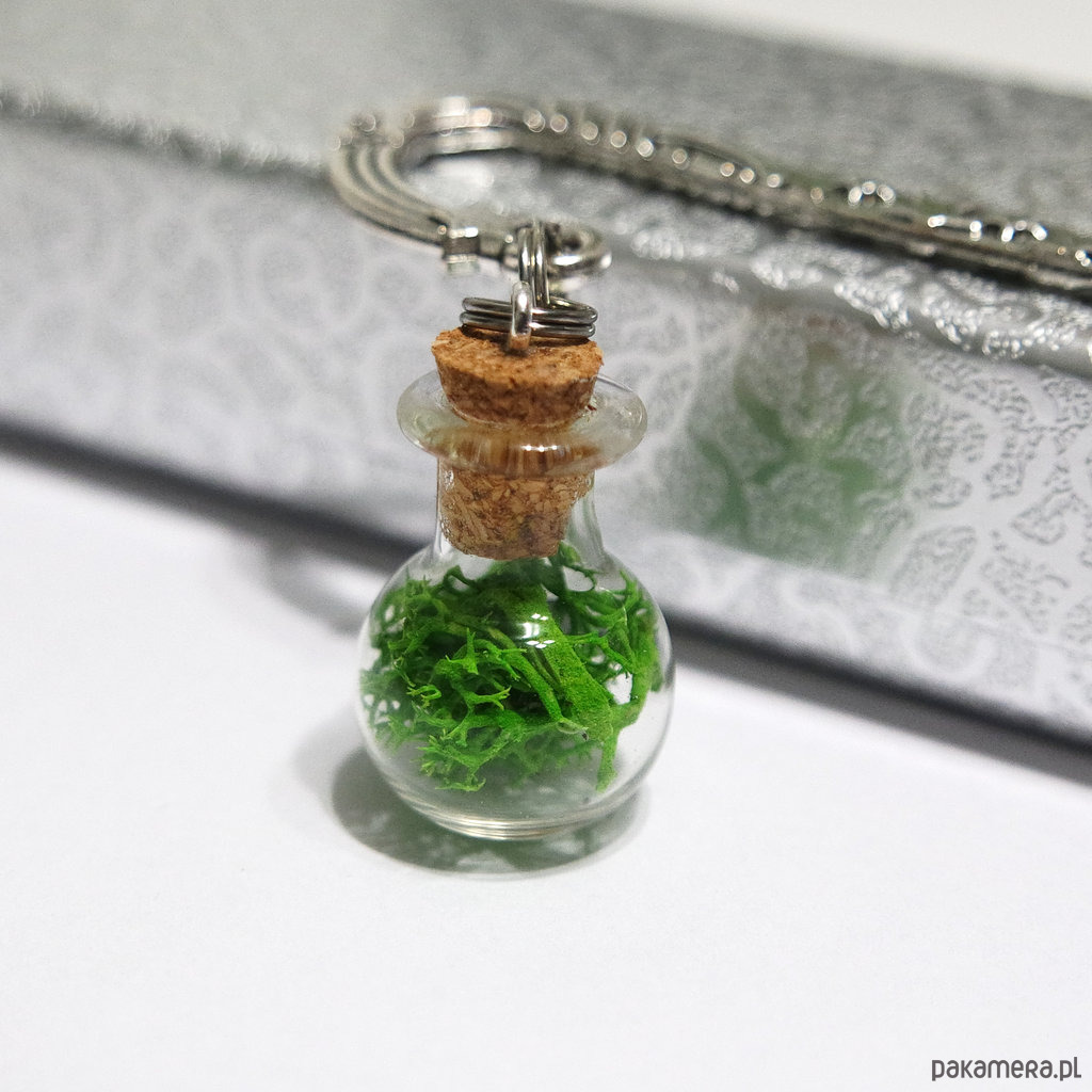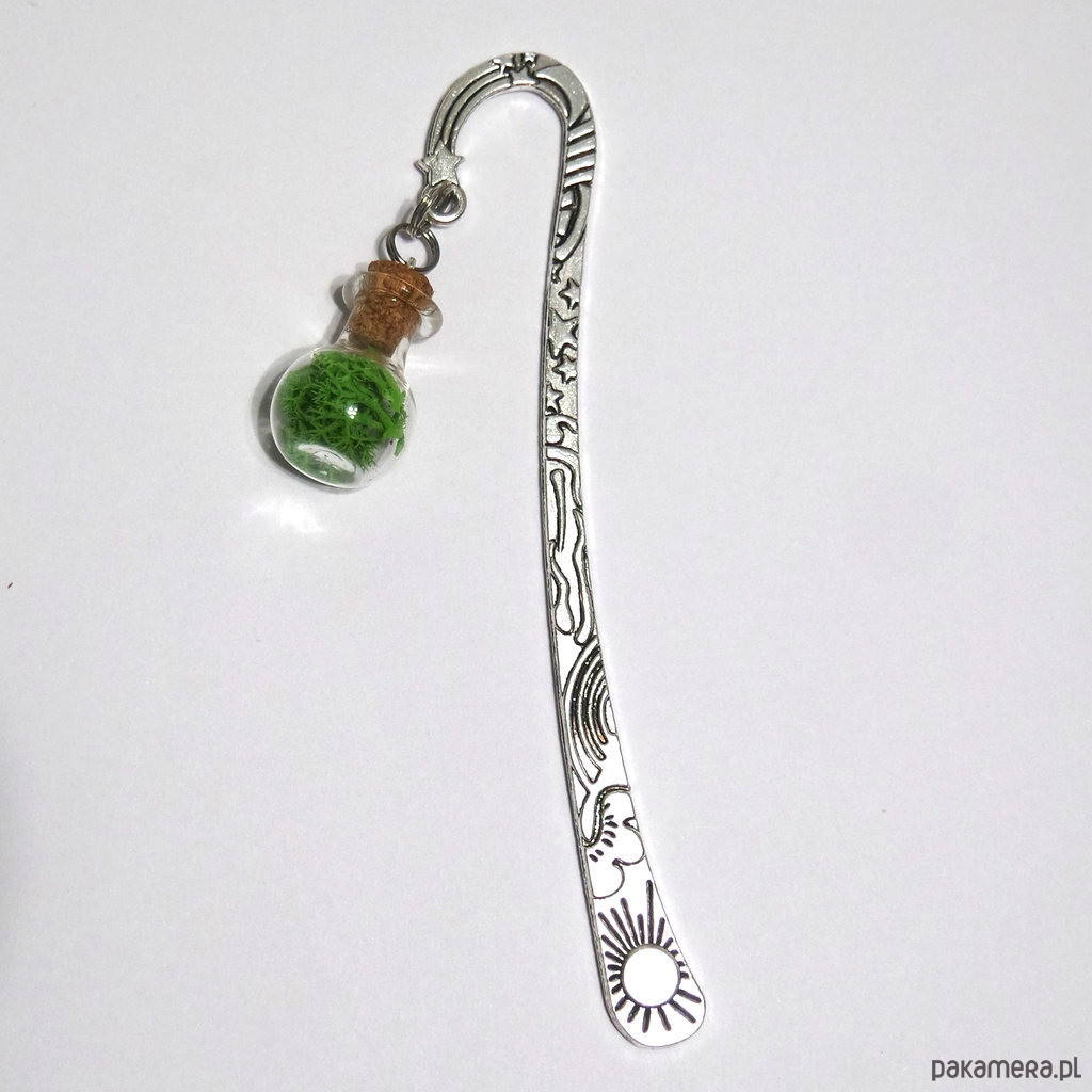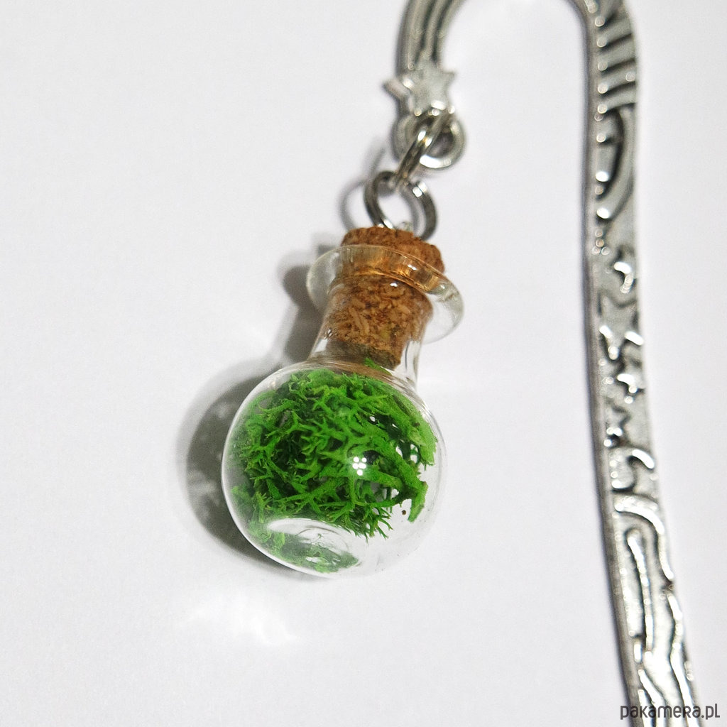 Wyjątkowa zakładka do książki z uroczą, malutką, szklaną buteleczką, wypełnioną mchem i zamkniętą koreczkiem.