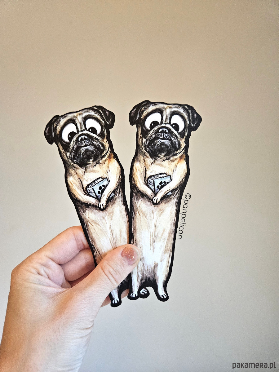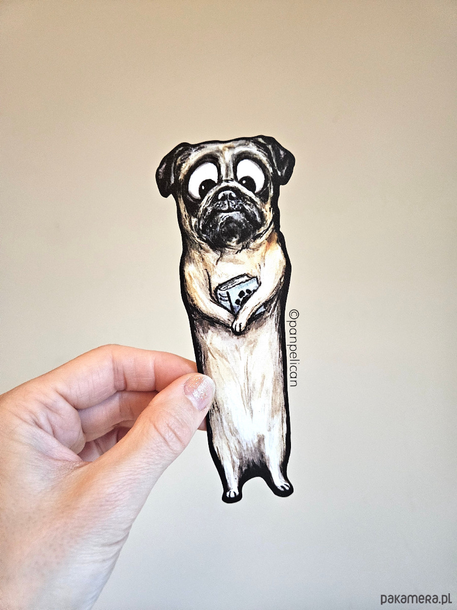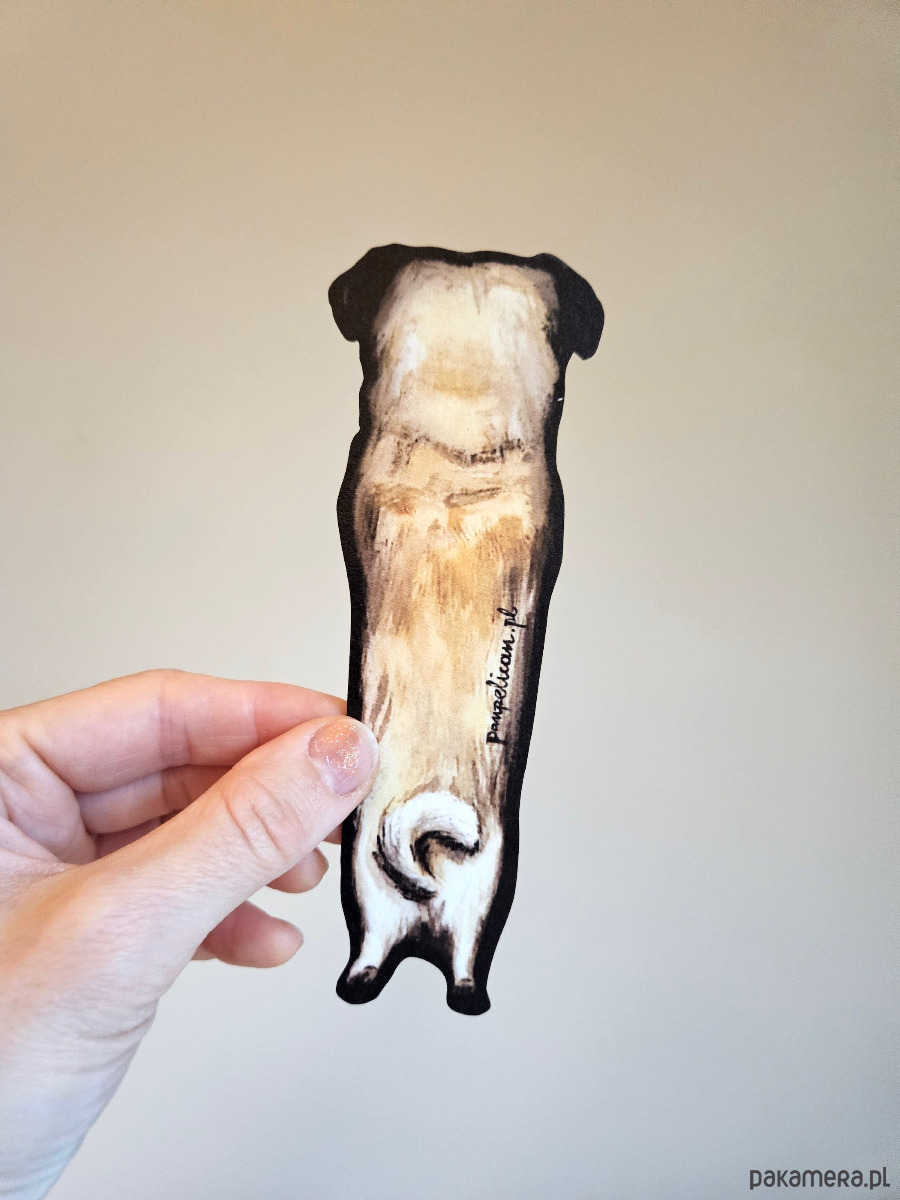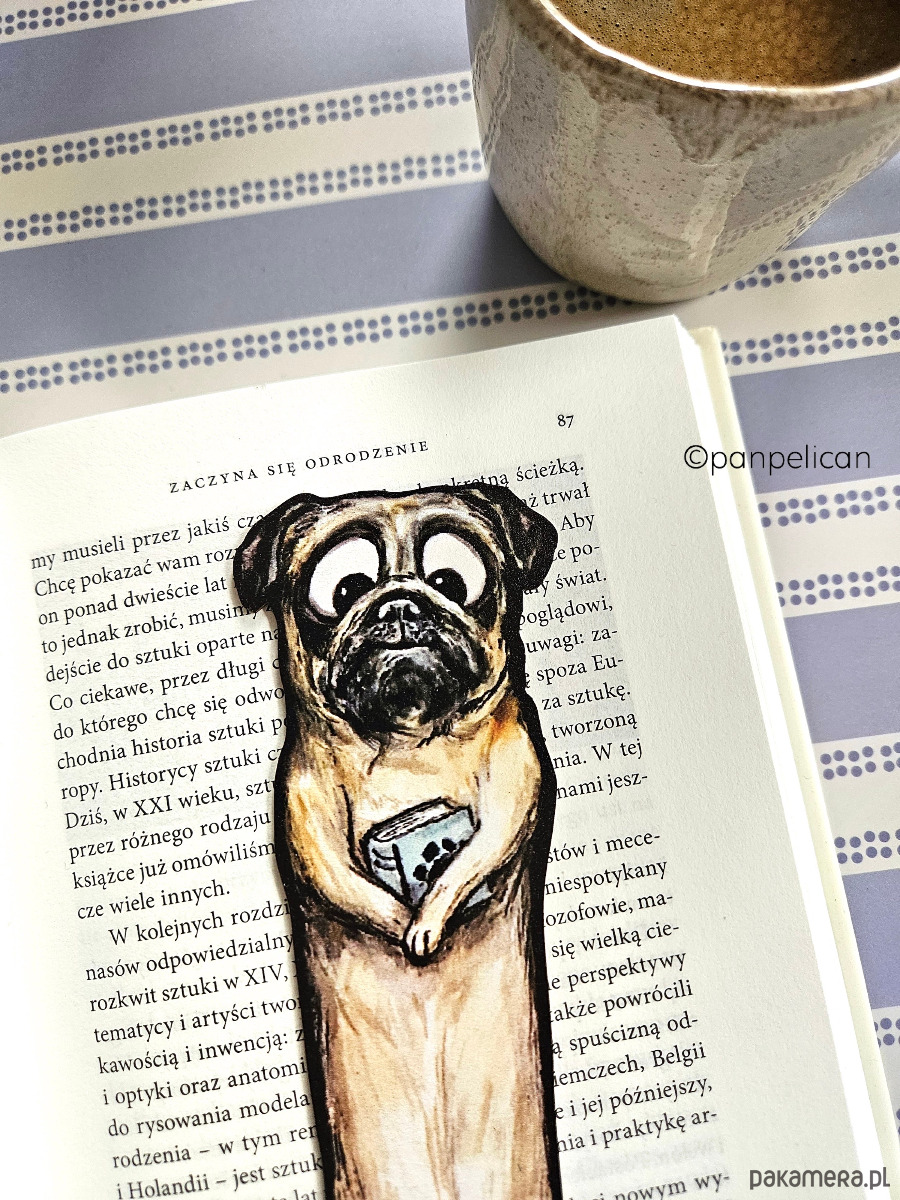 Autorska dwustronna zakładka do książki „Mops”. Druk na ekotekturze premium, reprodukcja malowanego ręcznie wzoru.