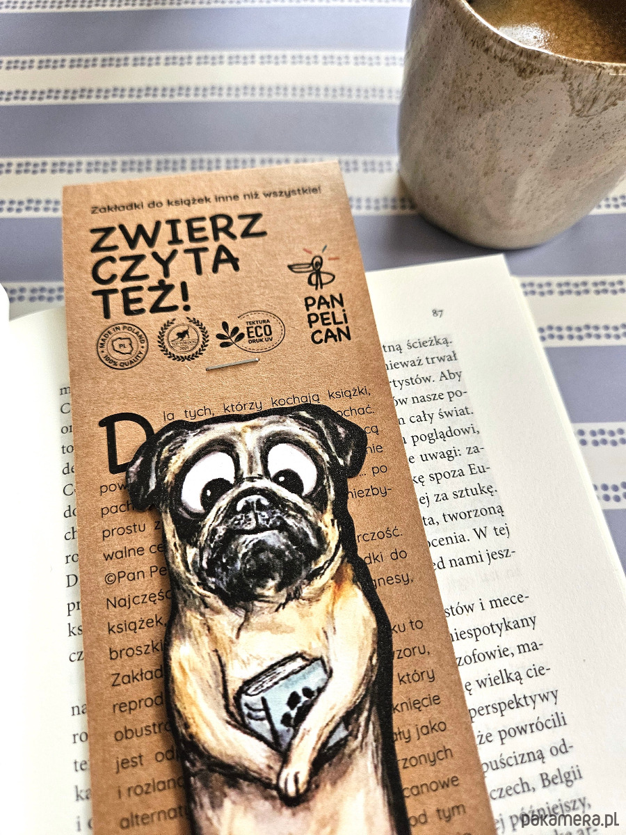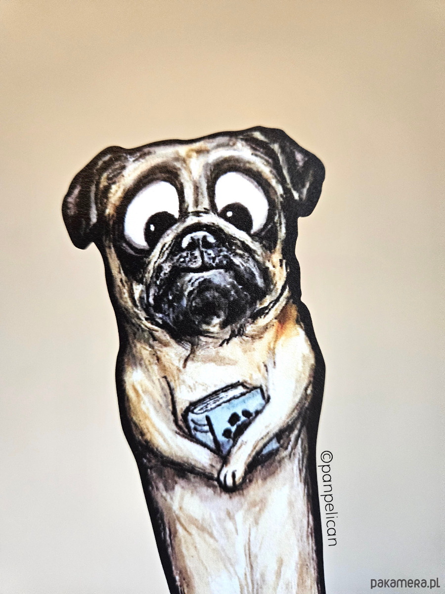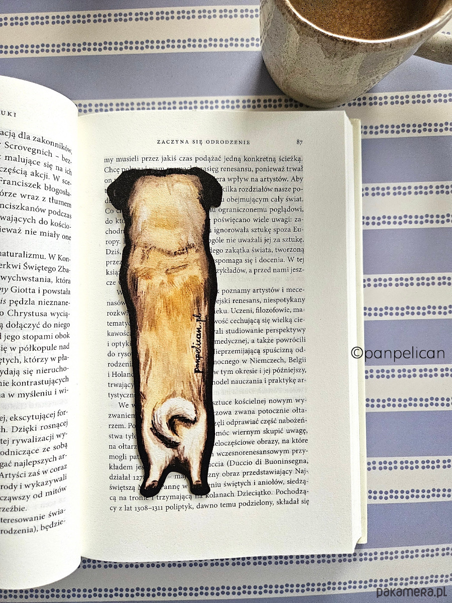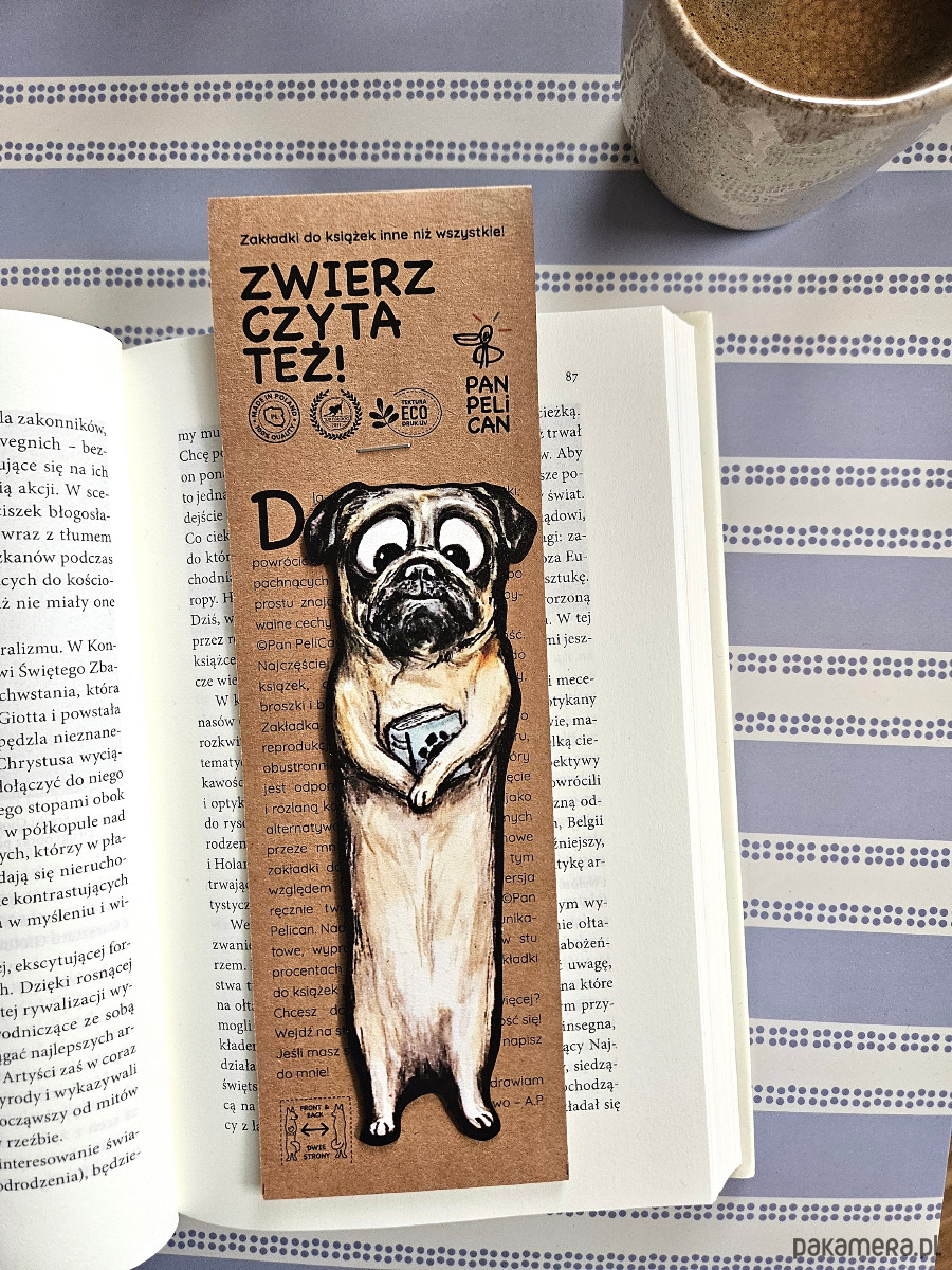 Autorska dwustronna zakładka do książki „Mops”. Druk na ekotekturze premium, reprodukcja malowanego ręcznie wzoru.