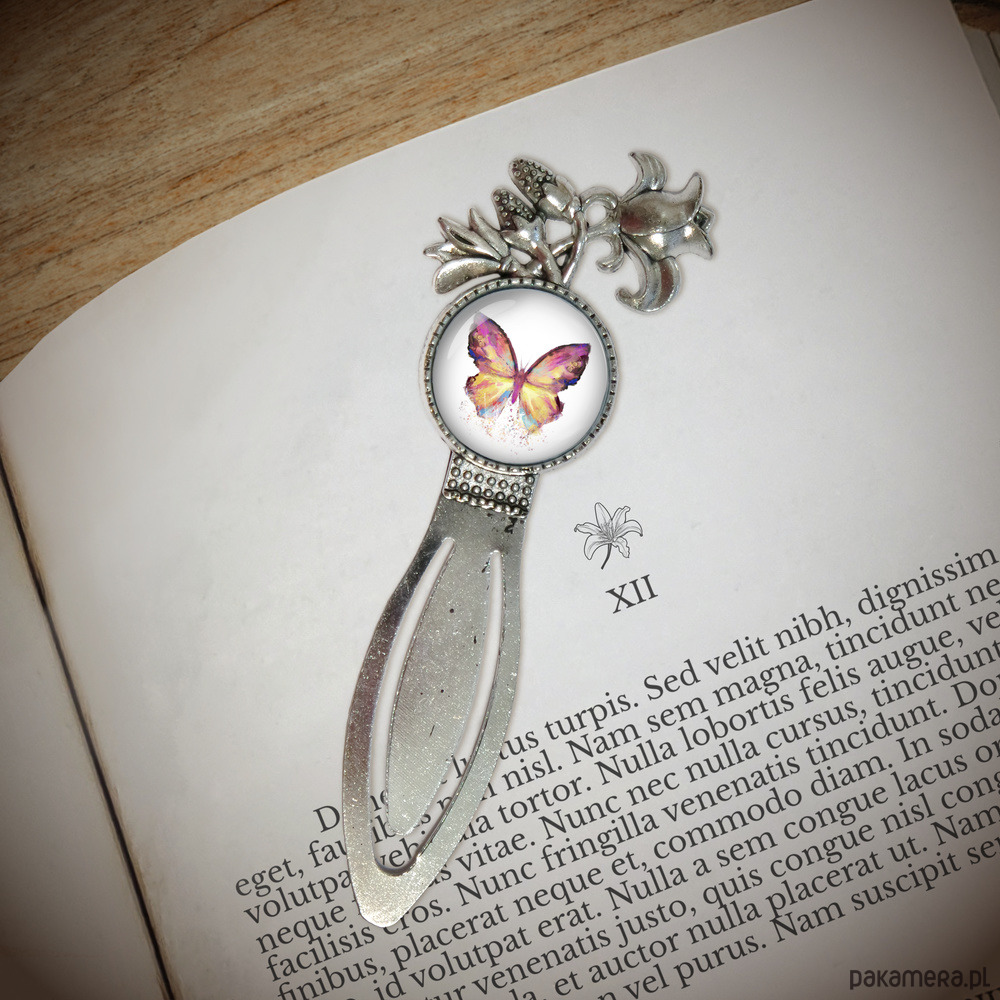Grafika ukryta w pięknie zdobionej motywem lilii, romantycznej zakładce do książki pod osłoną przeźroczystego półokrągłego szkiełka.