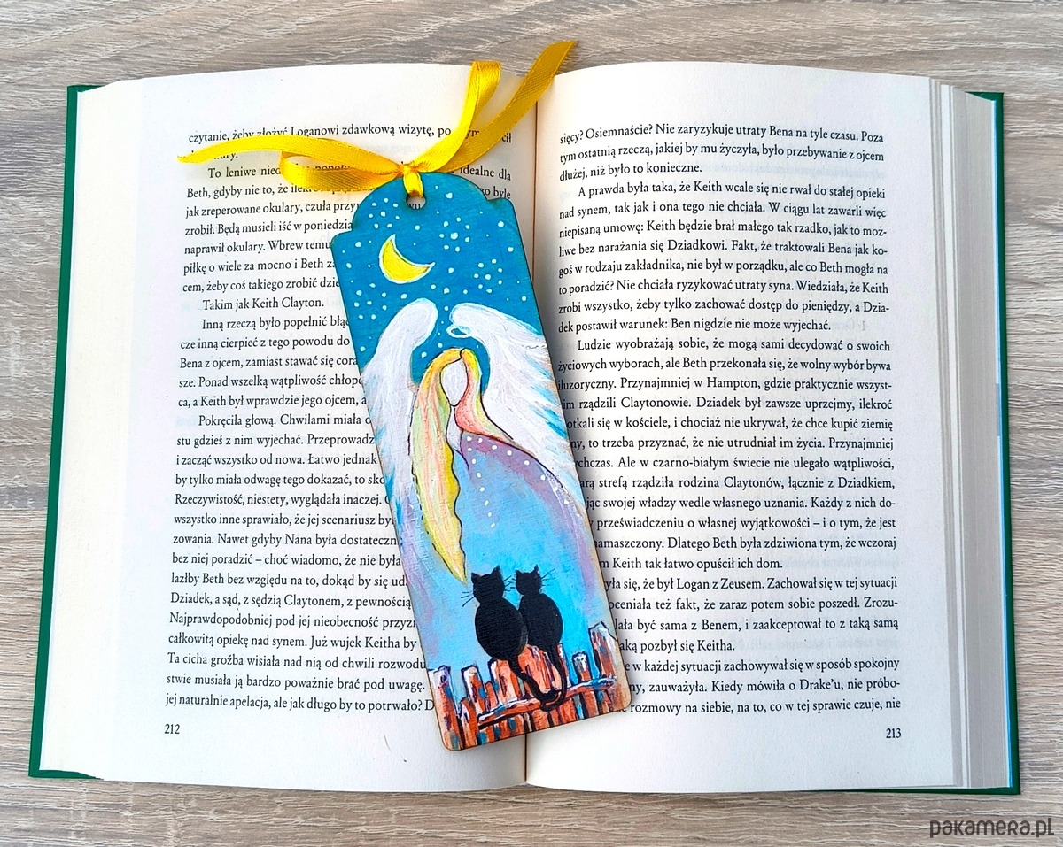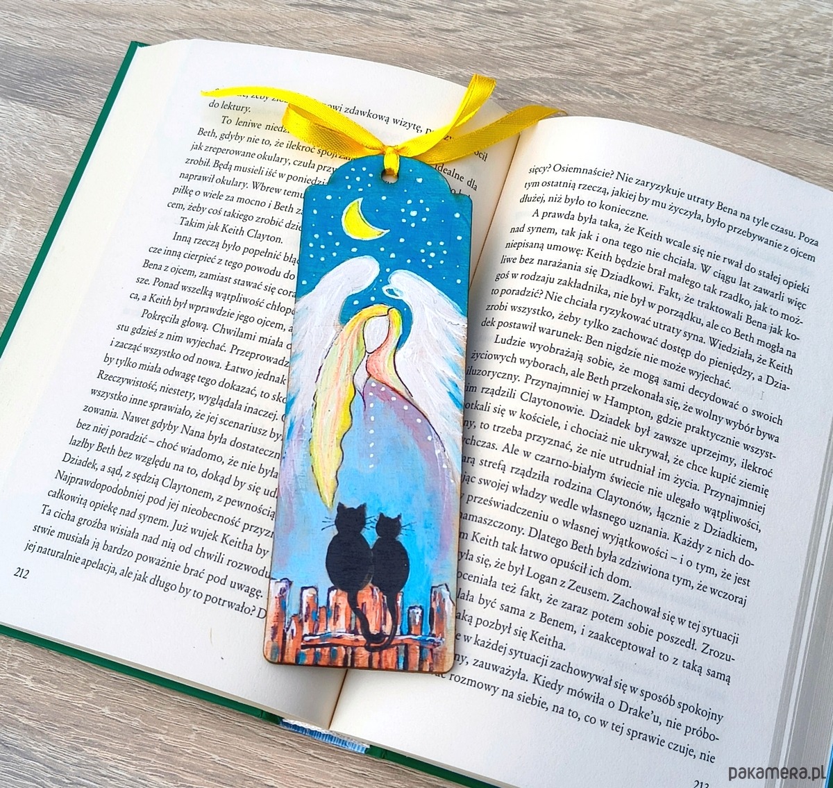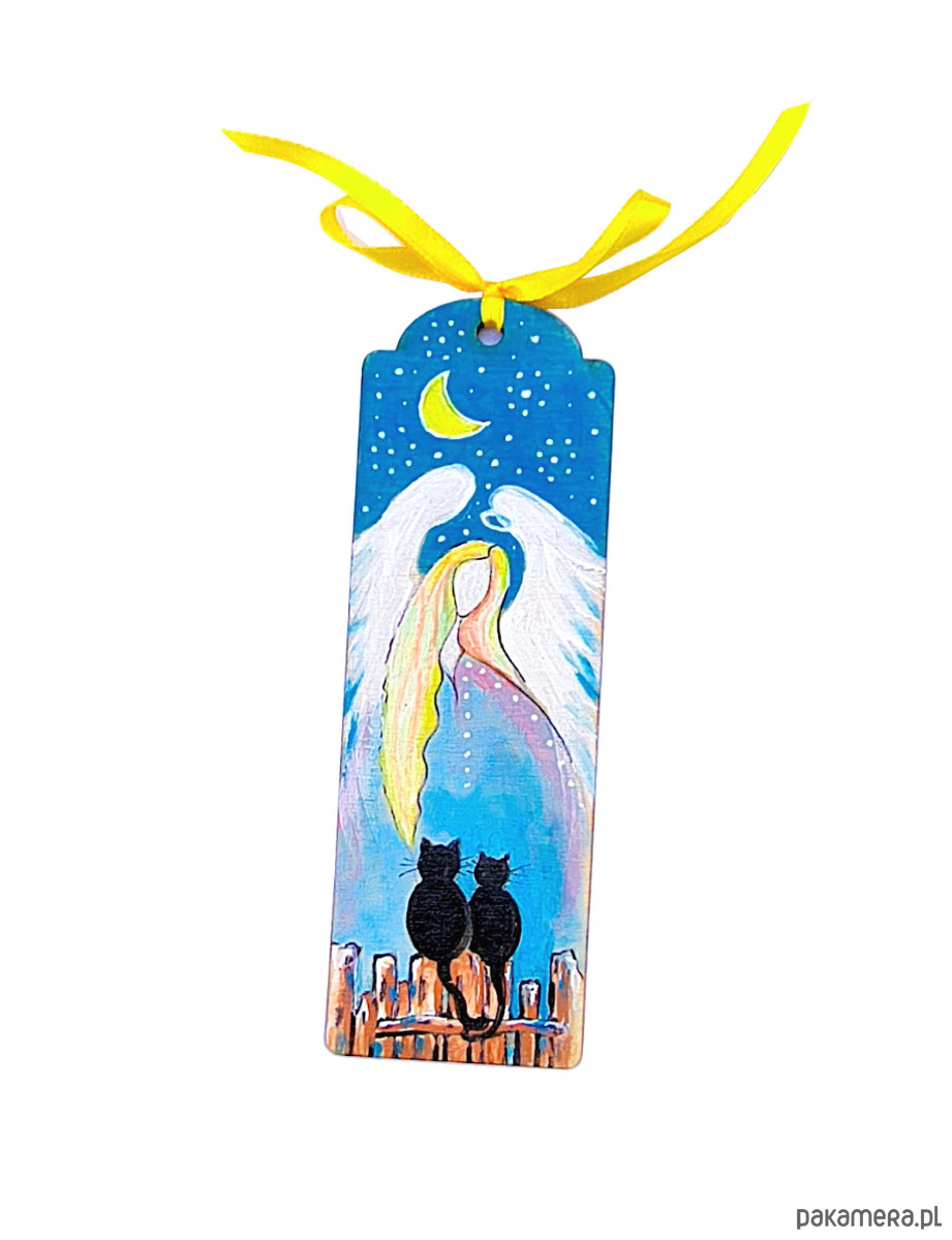 Wprowadź odrobinę magii do codzienności dzięki tej ręcznie wykonanej zakładce z ilustracją anioła. Zakładka malowana ręcznie, wykonana z drewna, zakończona ozdobną kokardką z żółtej wstążki. Idealna jako prezent lub osobisty talizman do ulubionej książki.