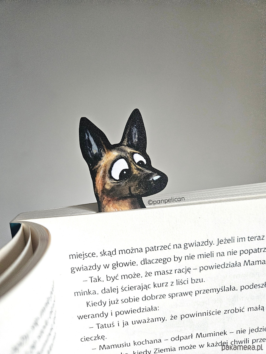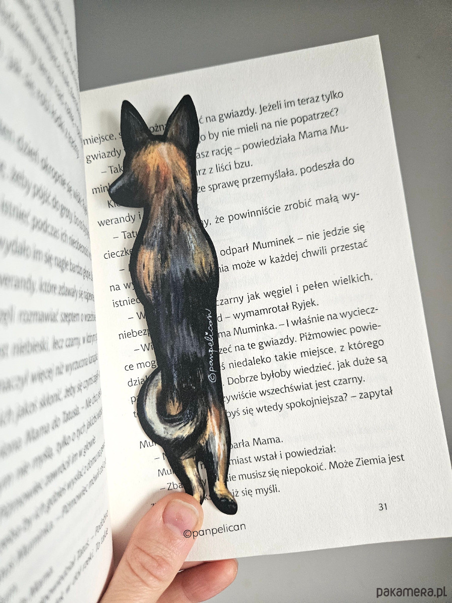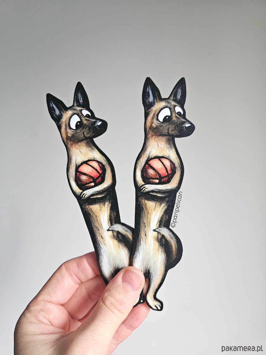 Autorska dwustronna zakładka do książki „Owczarek belgijski Kira”*. Druk na ekotekturze premium, reprodukcja malowanego ręcznie wzoru.