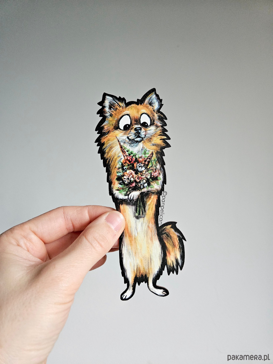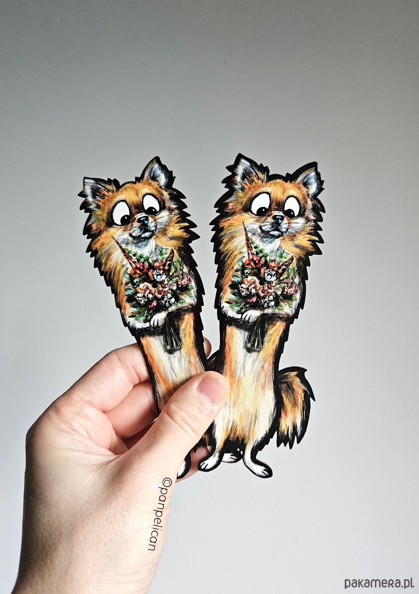 Autorska dwustronna zakładka do książki „Chihuahua Dyzio”. Druk na ekotekturze premium, reprodukcja malowanego ręcznie wzoru.