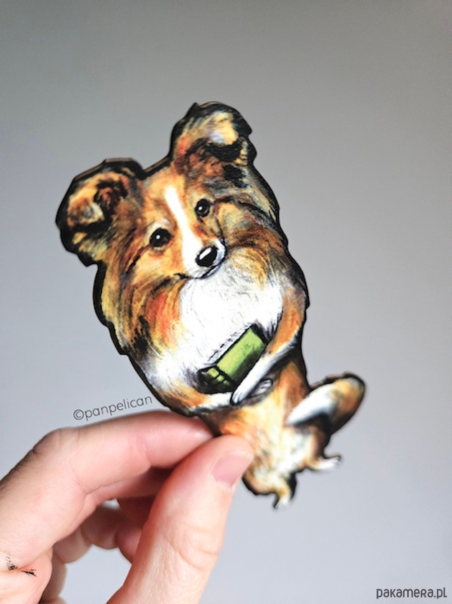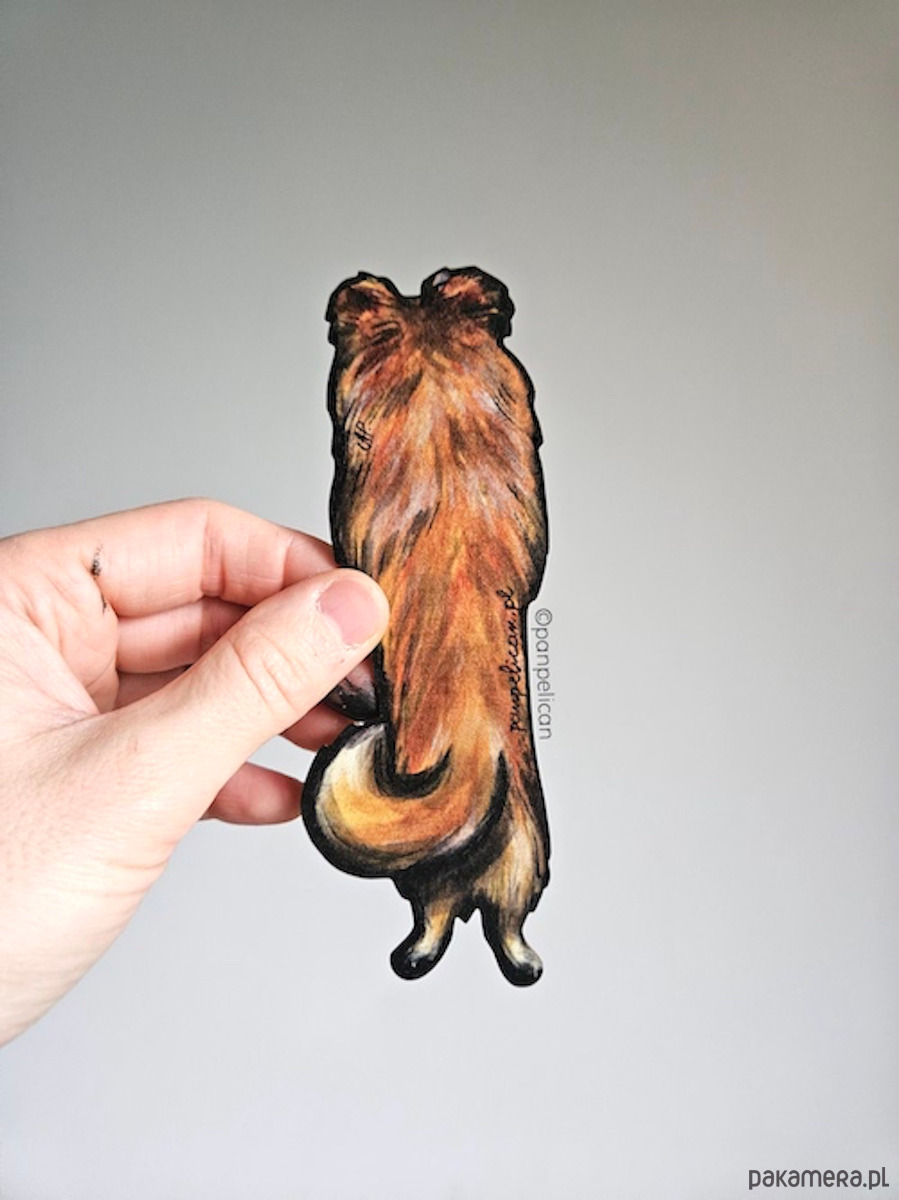 Autorska dwustronna zakładka do książki „Owczarek Szetlandzki Sally”. Druk na ekotekturze premium, reprodukcja malowanego ręcznie wzoru.
