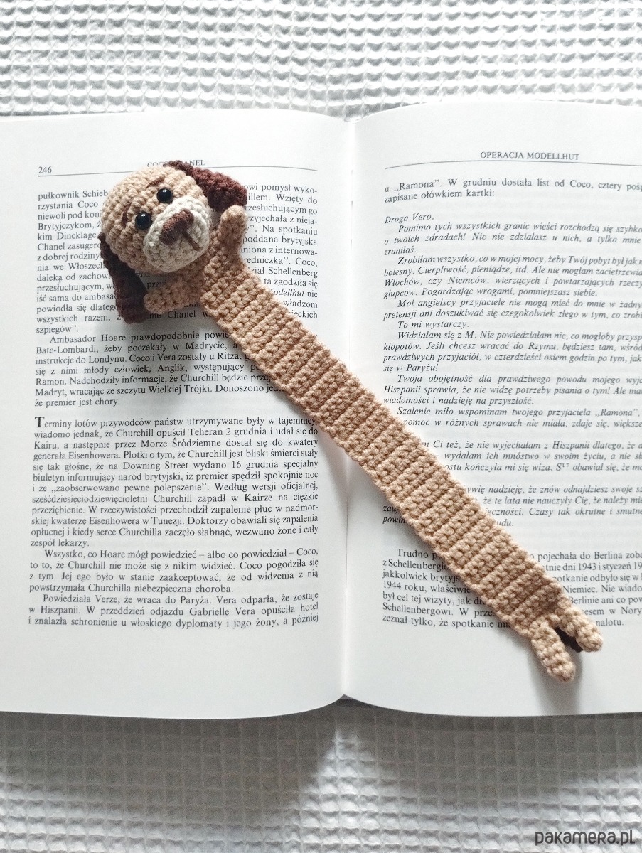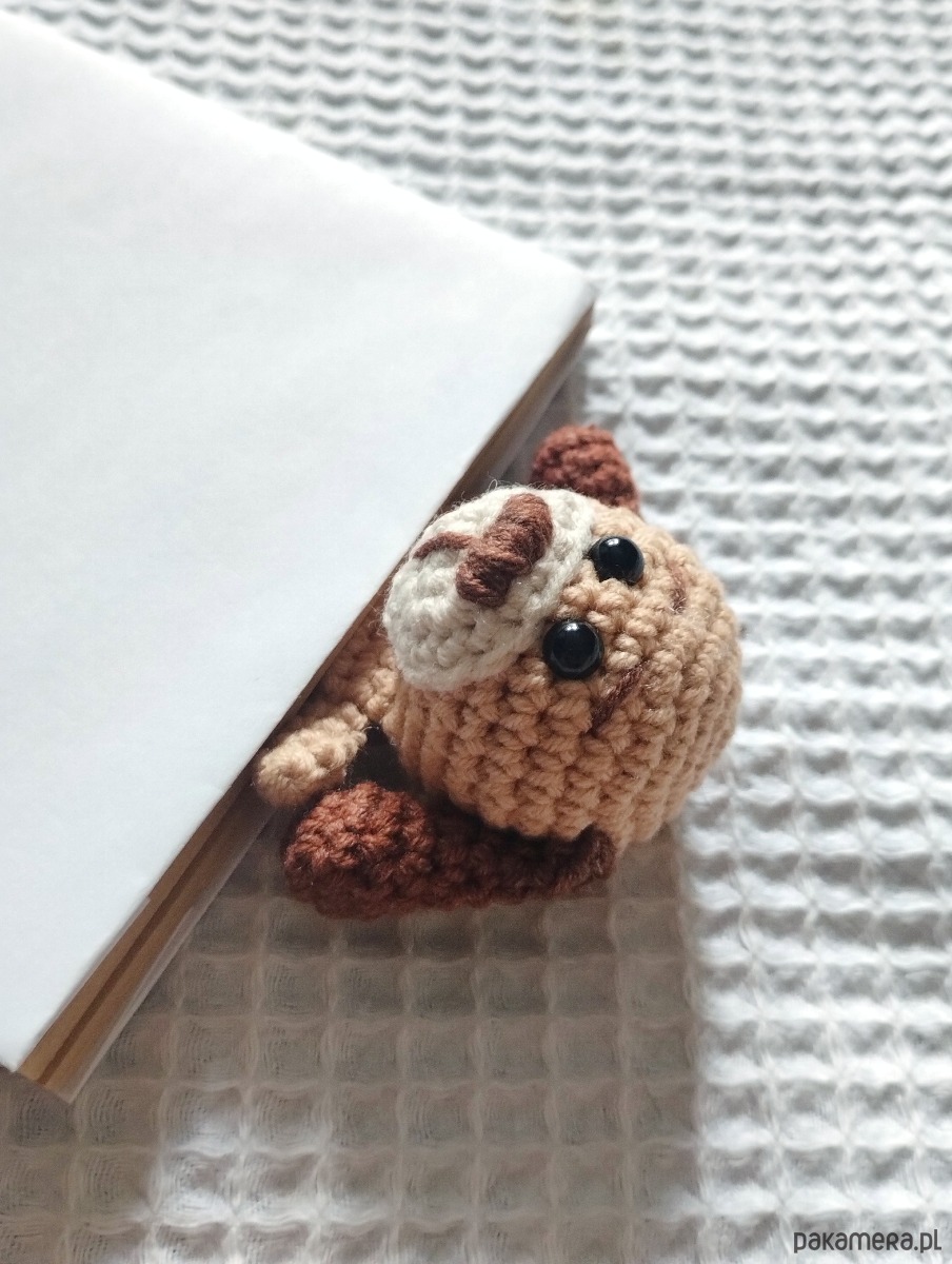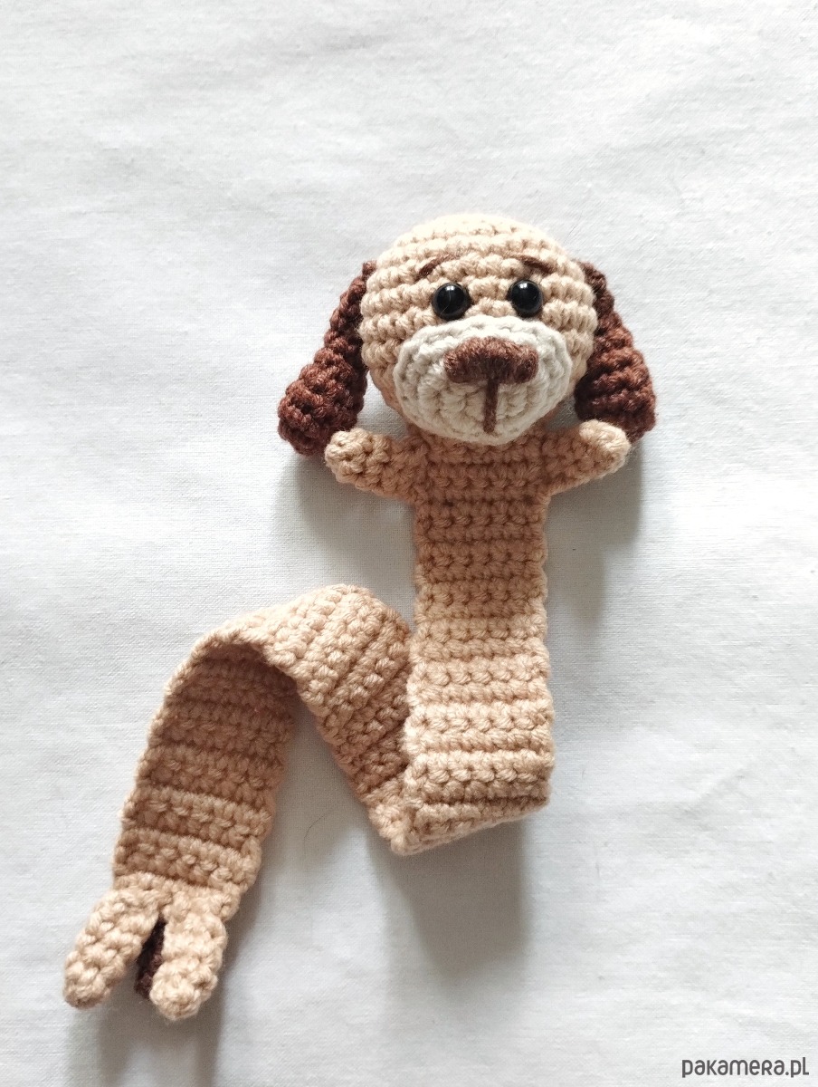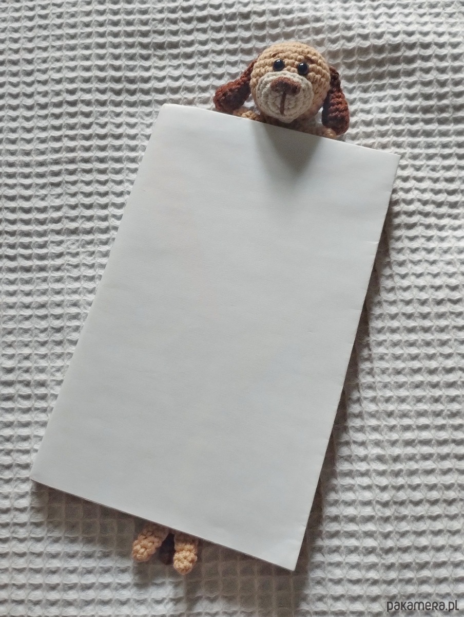 A przechodząc do szczegółów przedstawionej zakładki - głowa pieska ma ok 4 cm średnicy, obok niej - łapki, po drugiej stronie zakładki znajdziemy nóżki i ogonek. Zakładka (część bez zwierzątka) ma długość 20 cm.