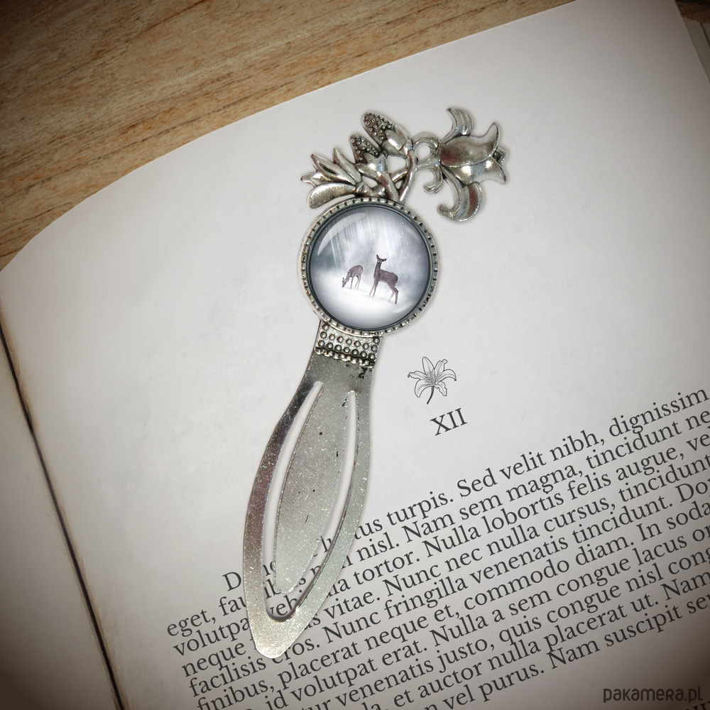 Grafika ukryta w pięknie zdobionej motywem lilii, romantycznej zakładce do książki pod osłoną przeźroczystego półokrągłego szkiełka.