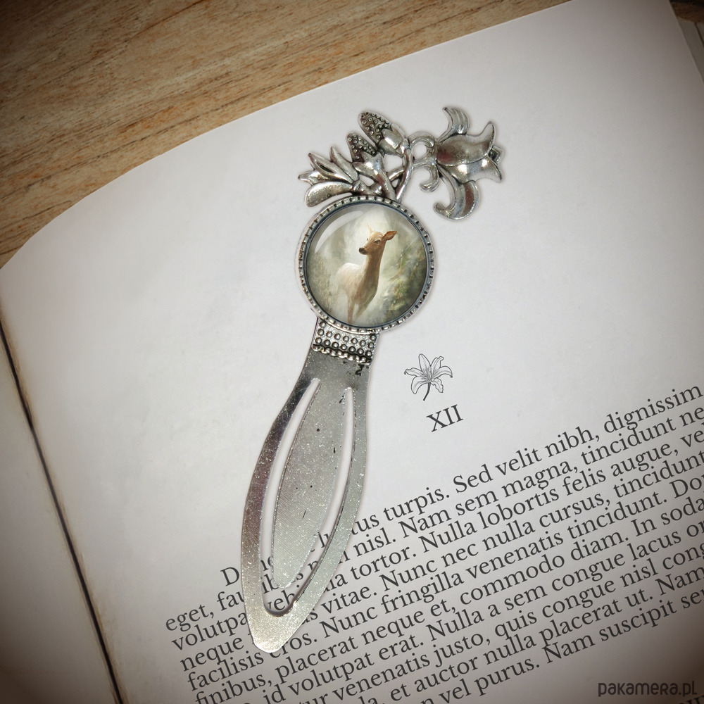 Grafika ukryta w pięknie zdobionej motywem lilii, romantycznej zakładce do książki pod osłoną przeźroczystego półokrągłego szkiełka.