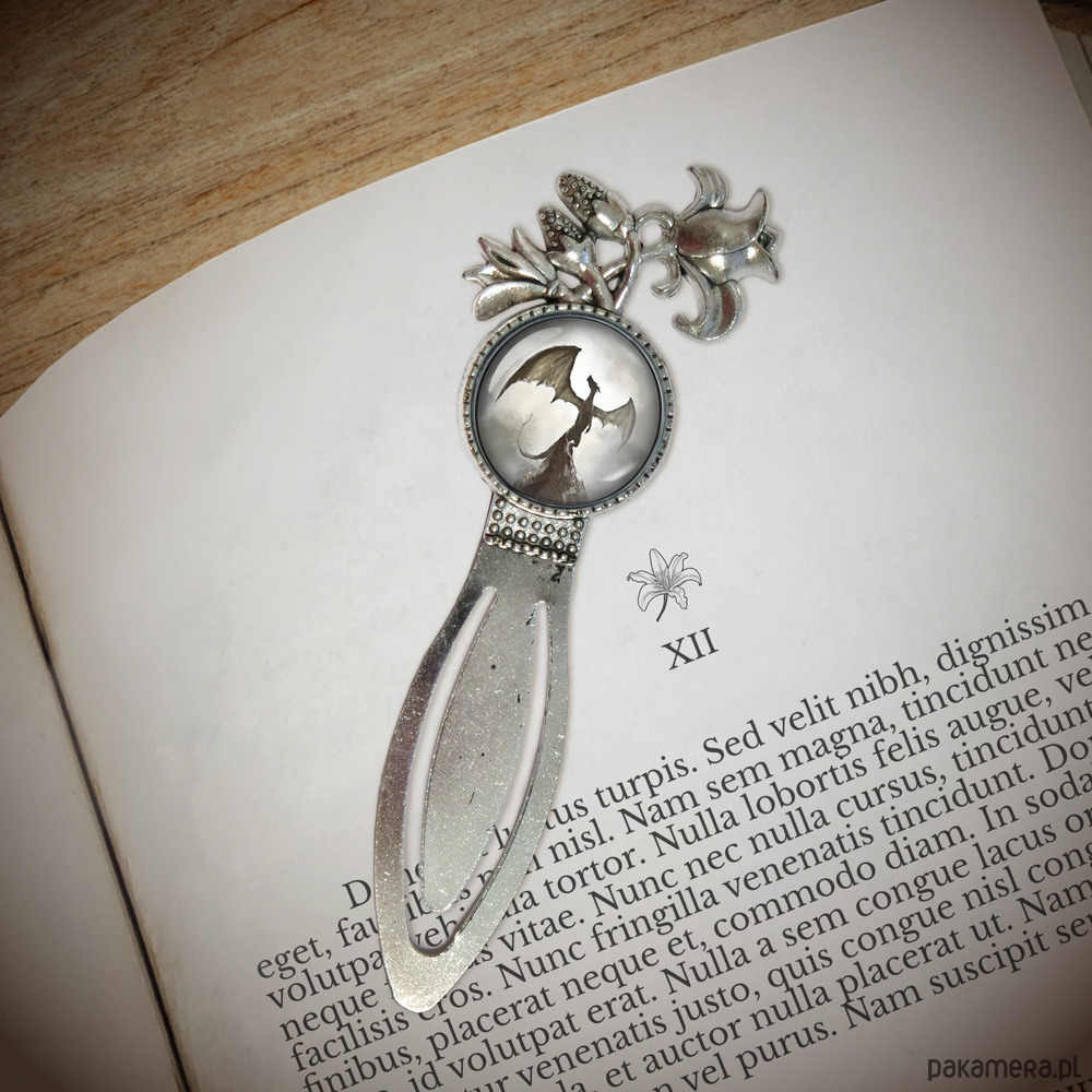 Grafika ukryta w pięknie zdobionej motywem lilii, romantycznej zakładce do książki pod osłoną przeźroczystego półokrągłego szkiełka.