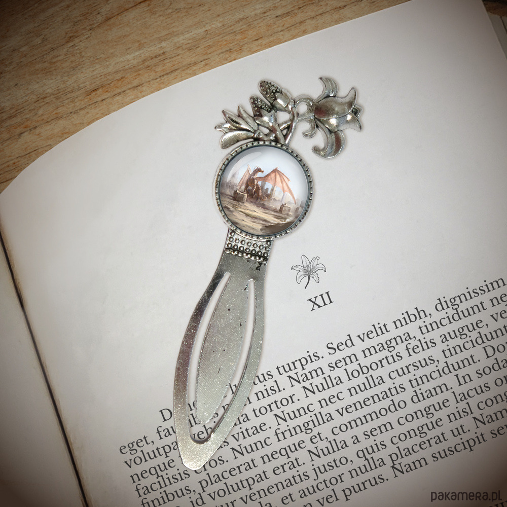 Grafika ukryta w pięknie zdobionej motywem lilii, romantycznej zakładce do książki pod osłoną przeźroczystego półokrągłego szkiełka.