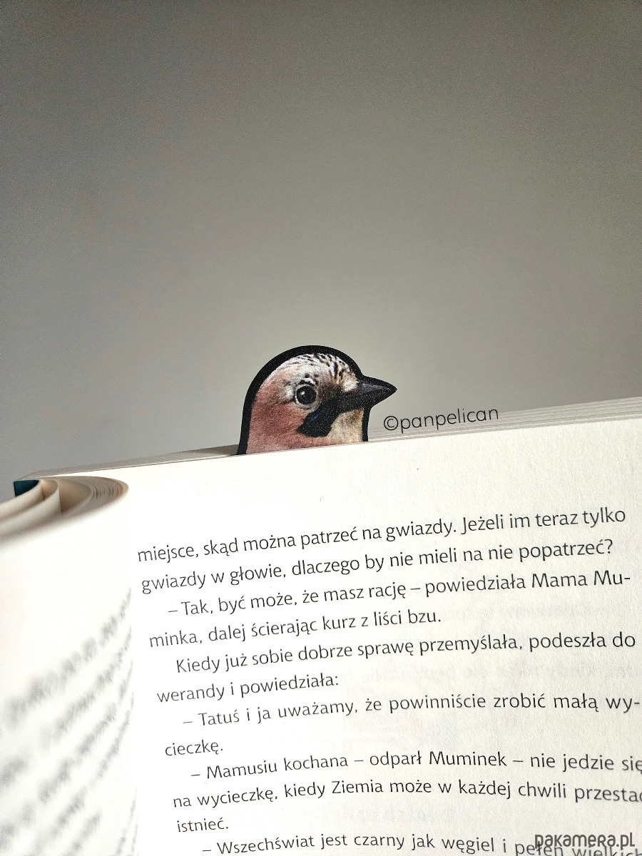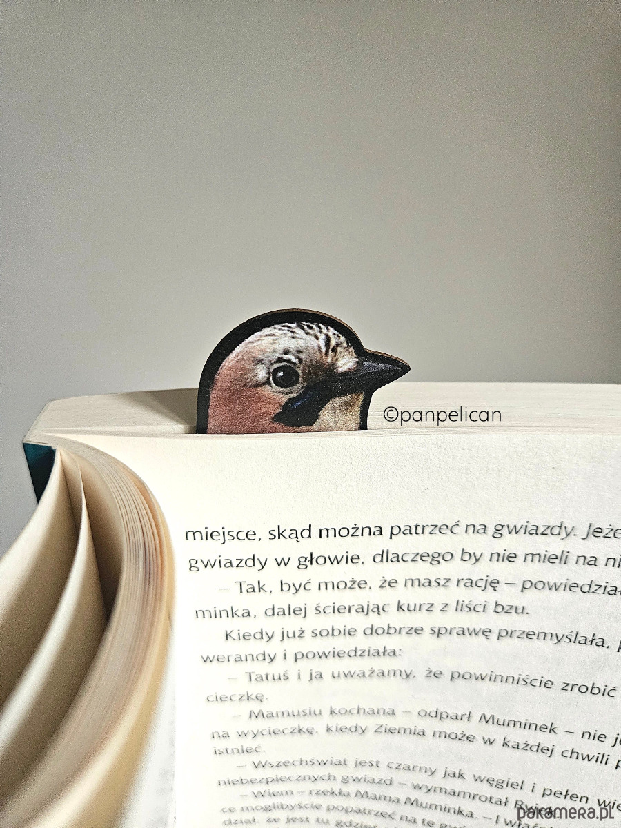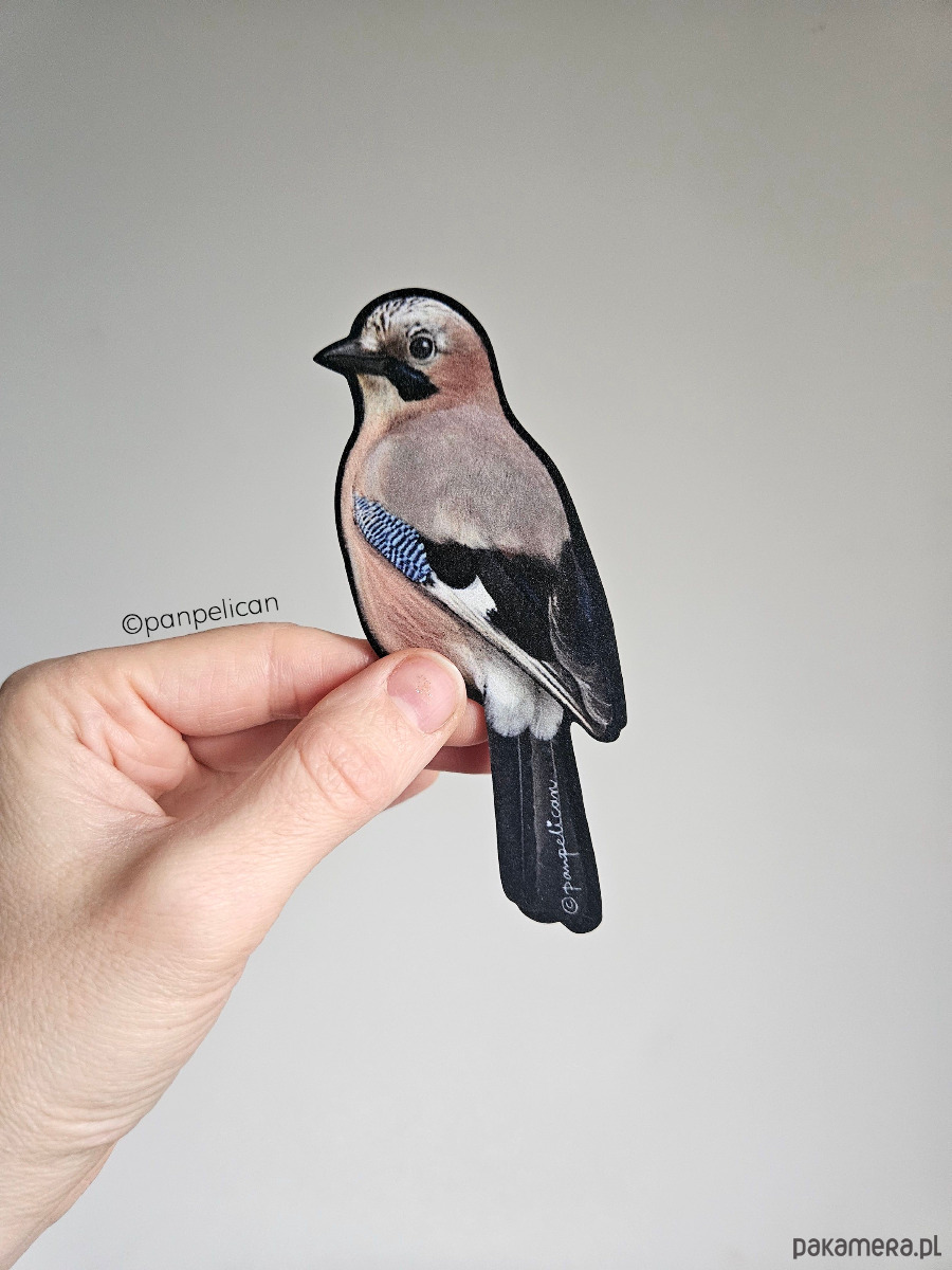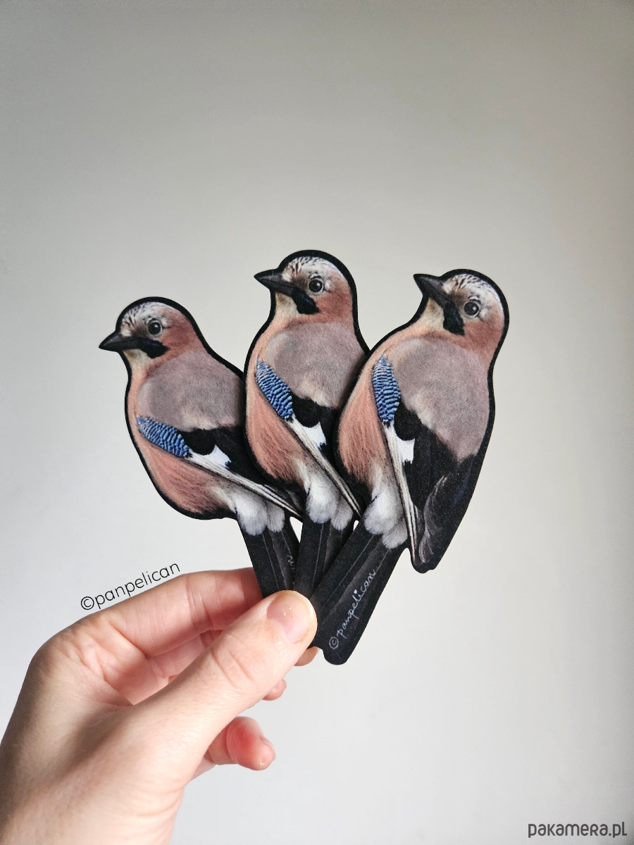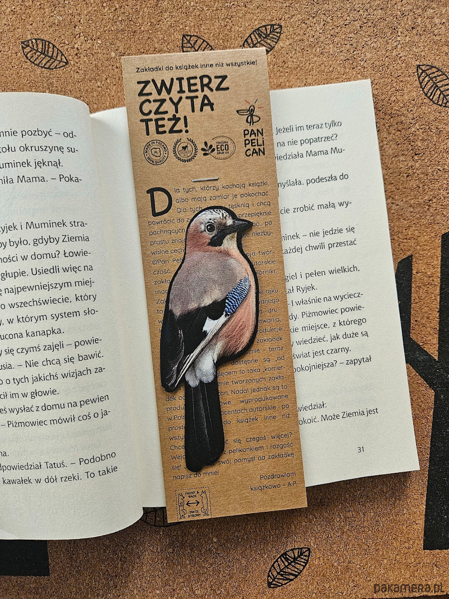 Autorska dwustronna zakładka do książki „Sójka”. Druk UV na ekotekturze premium, reprodukcja malowanego ręcznie wzoru.