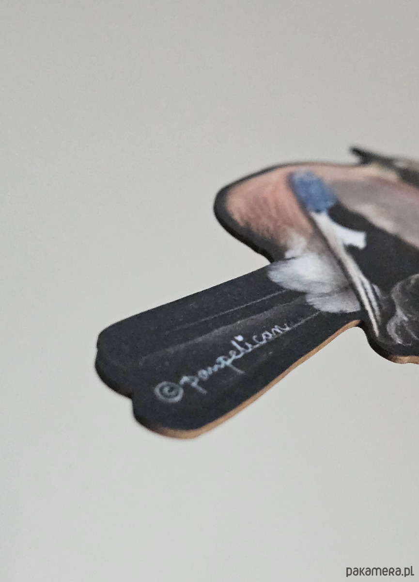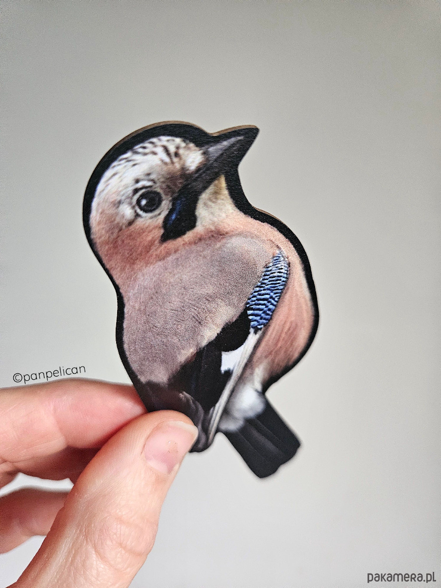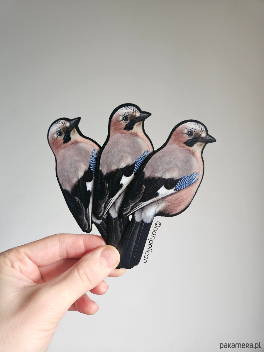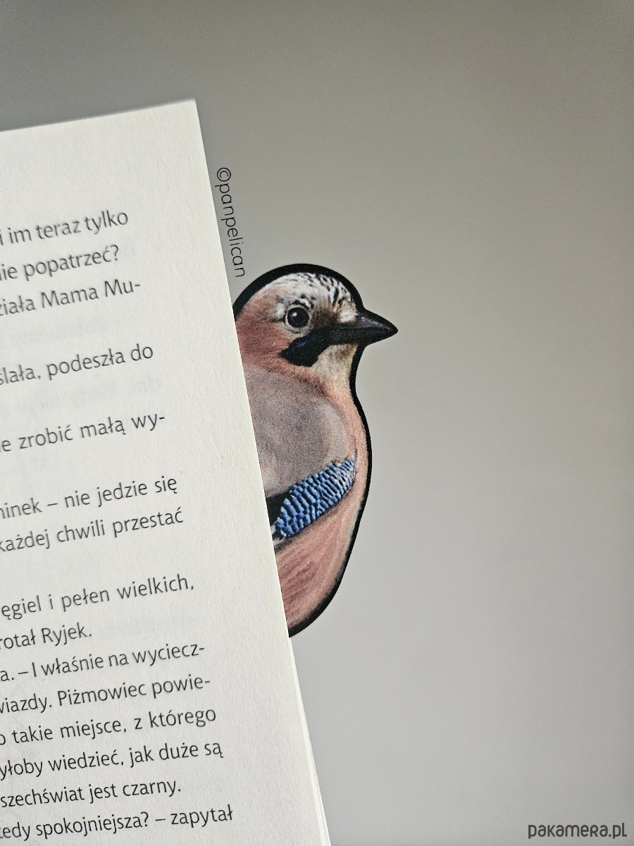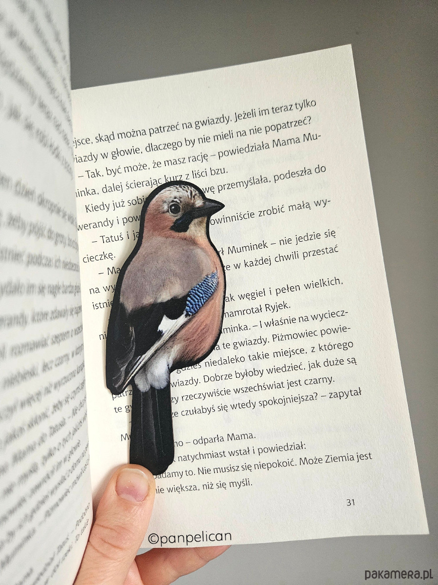 Autorska dwustronna zakładka do książki „Sójka”. Druk UV na ekotekturze premium, reprodukcja malowanego ręcznie wzoru.
