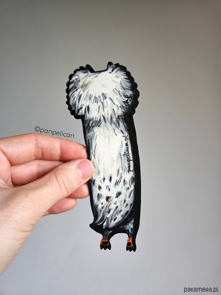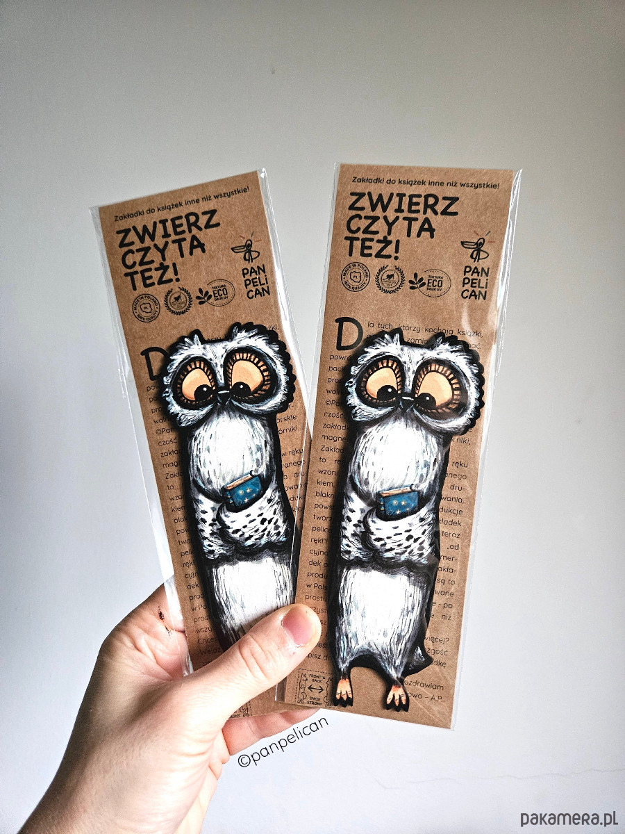 Autorska dwustronna zakładka do książki „Sówka Biała”. Druk UV na ekotekturze premium, reprodukcja malowanego ręcznie wzoru.