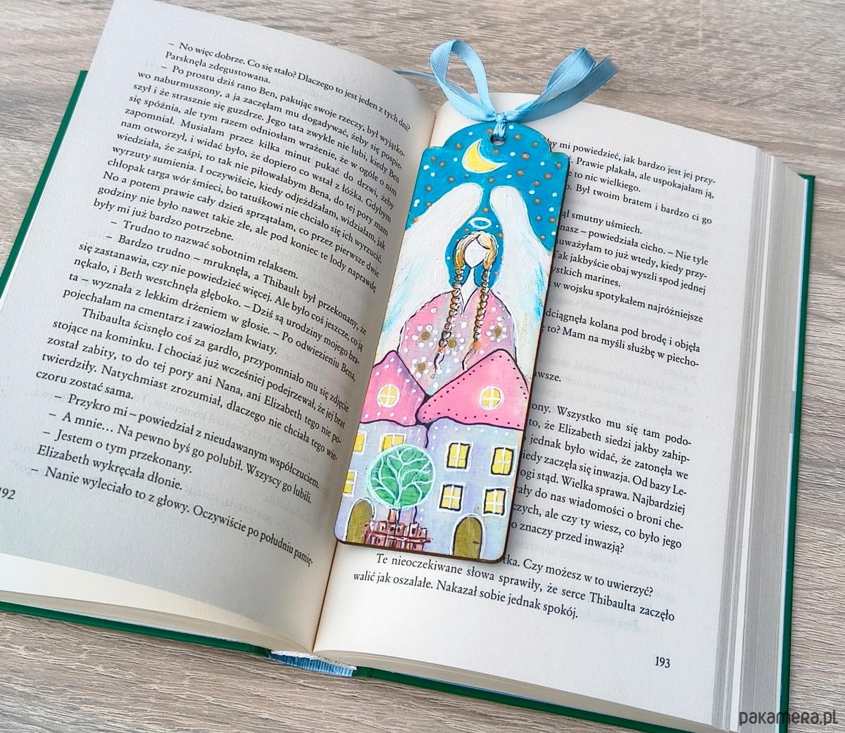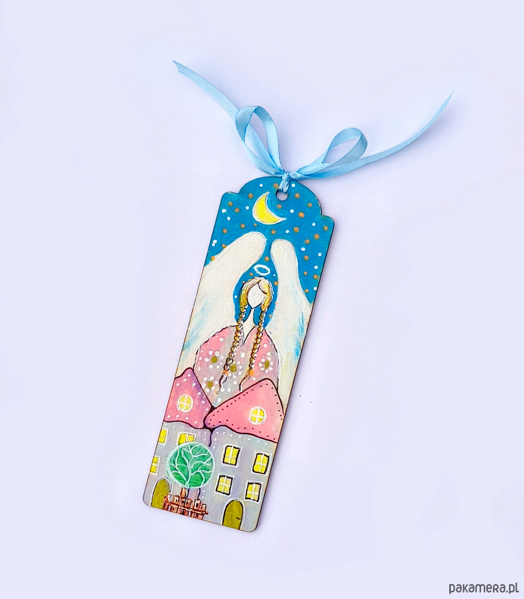 Wprowadź odrobinę magii do codzienności dzięki tej ręcznie wykonanej zakładce z ilustracją anioła. Zakładka malowana ręcznie, wykonana z drewna, zakończona ozdobną kokardką z błękitnej wstążki. Idealna jako prezent lub osobisty talizman do ulubionej książki.
