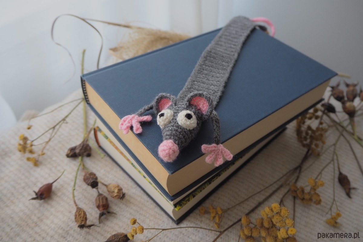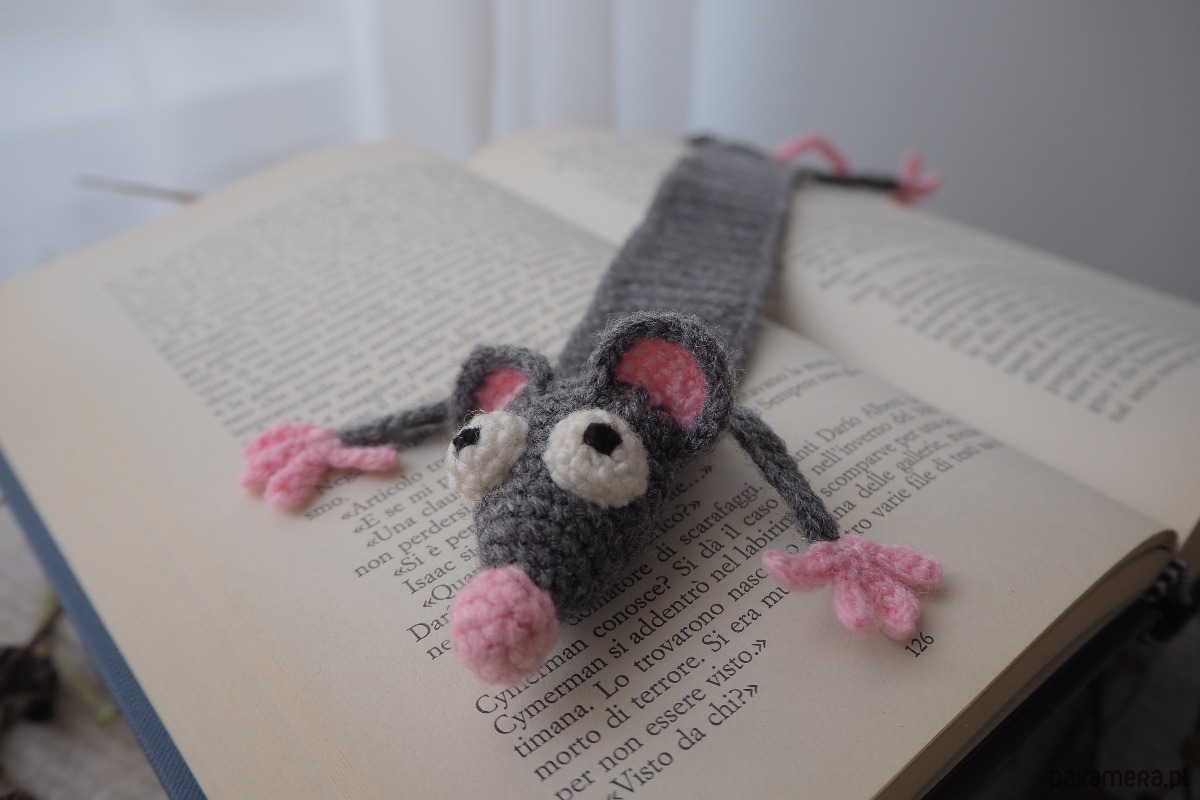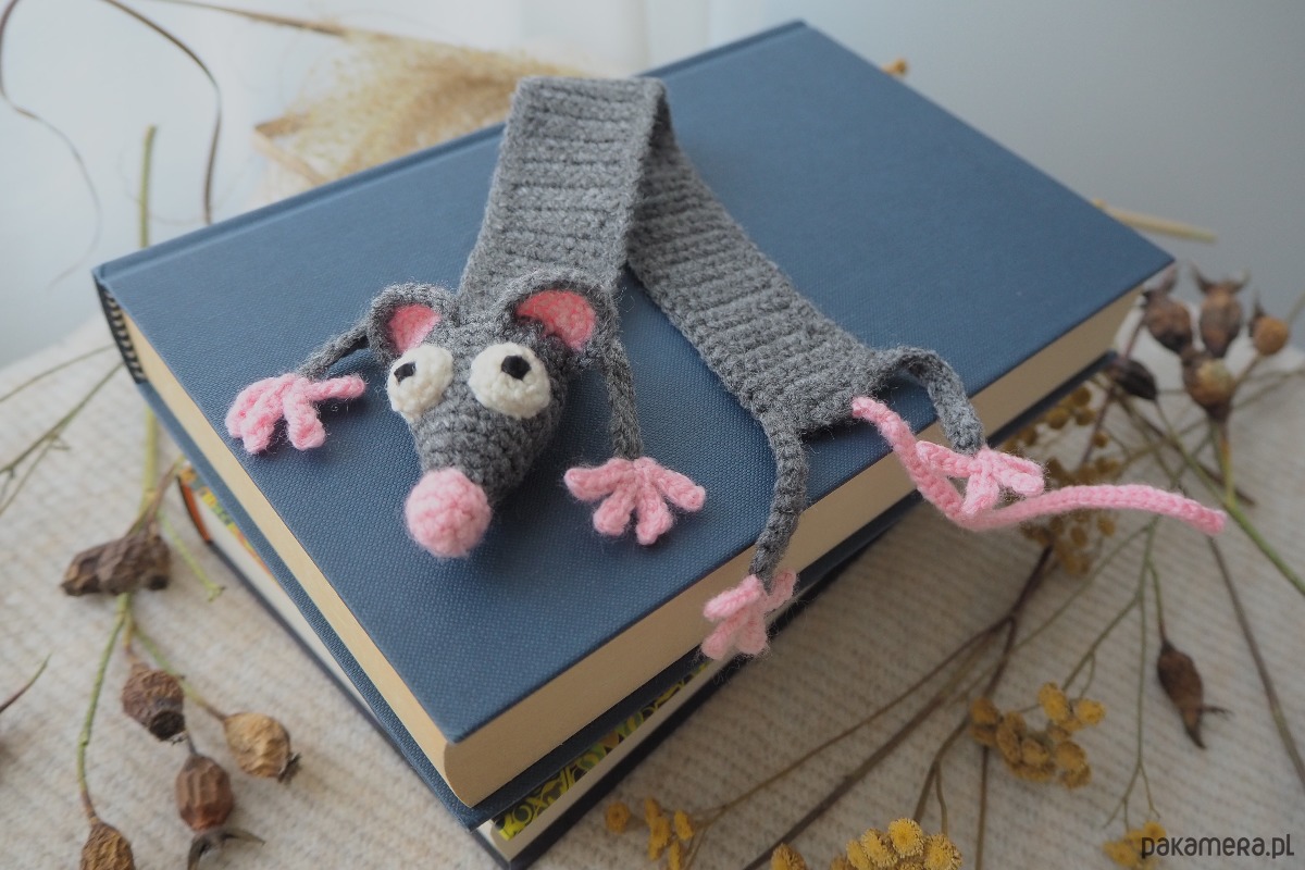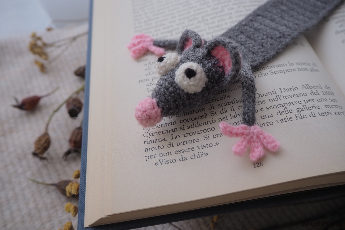 Zakładka do książki z sympatycznym szczurkiem wykonana z włóczki na szydełku.