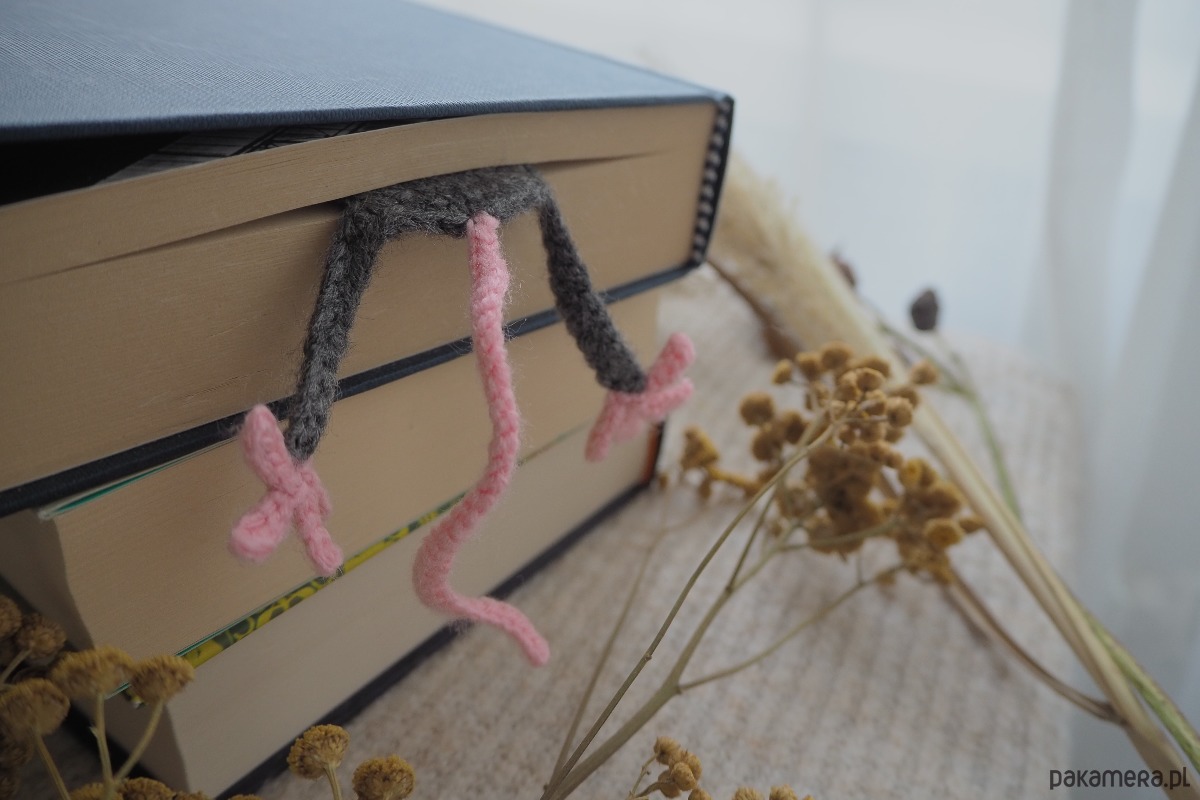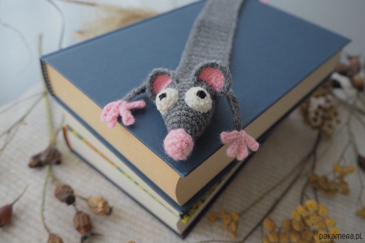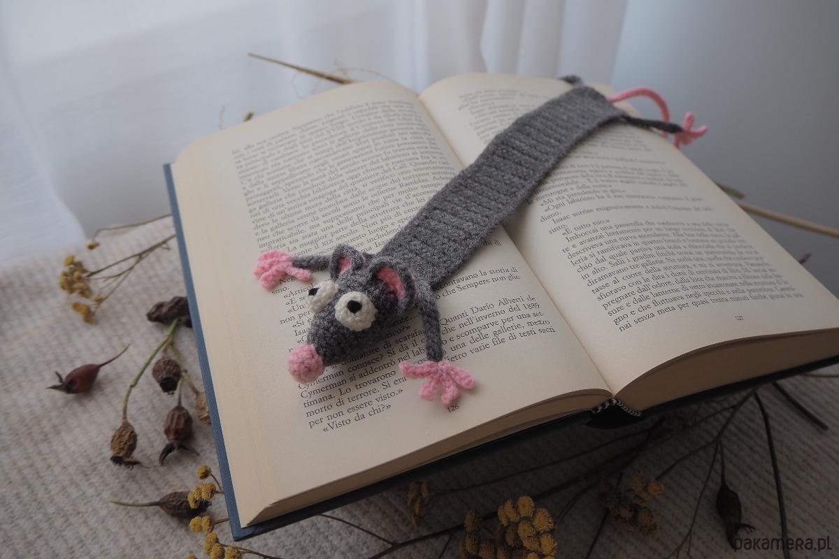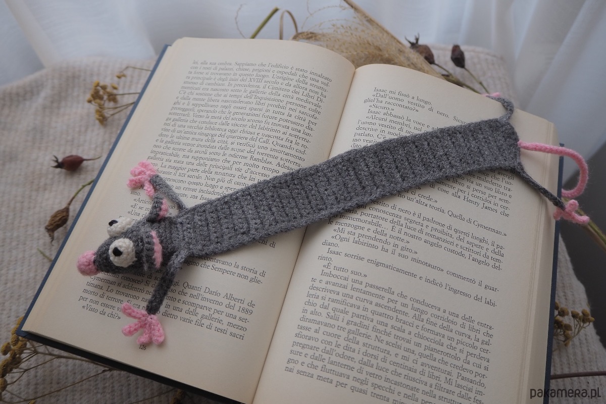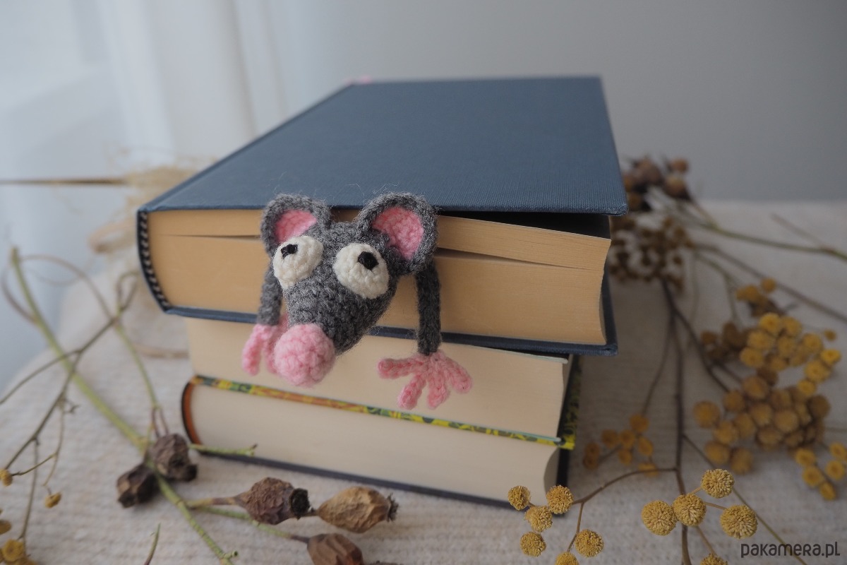 Zakładka do książki z sympatycznym szczurkiem wykonana z włóczki na szydełku.