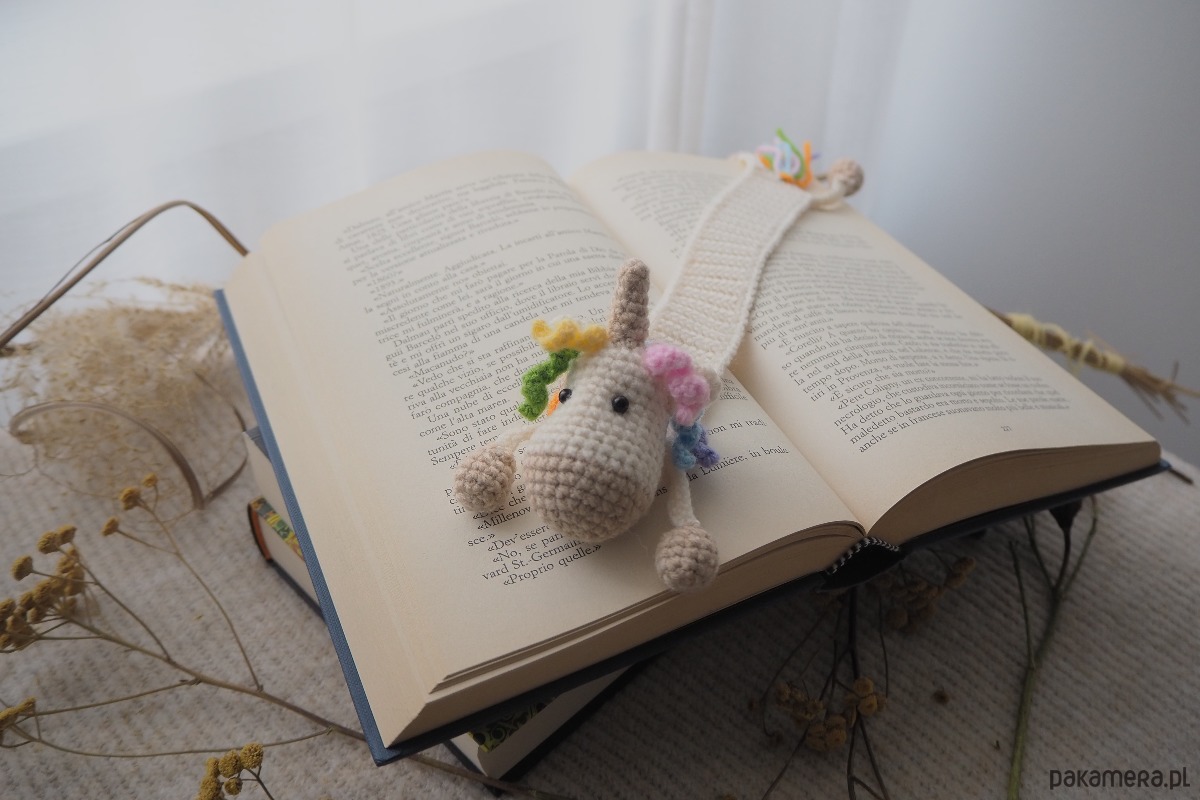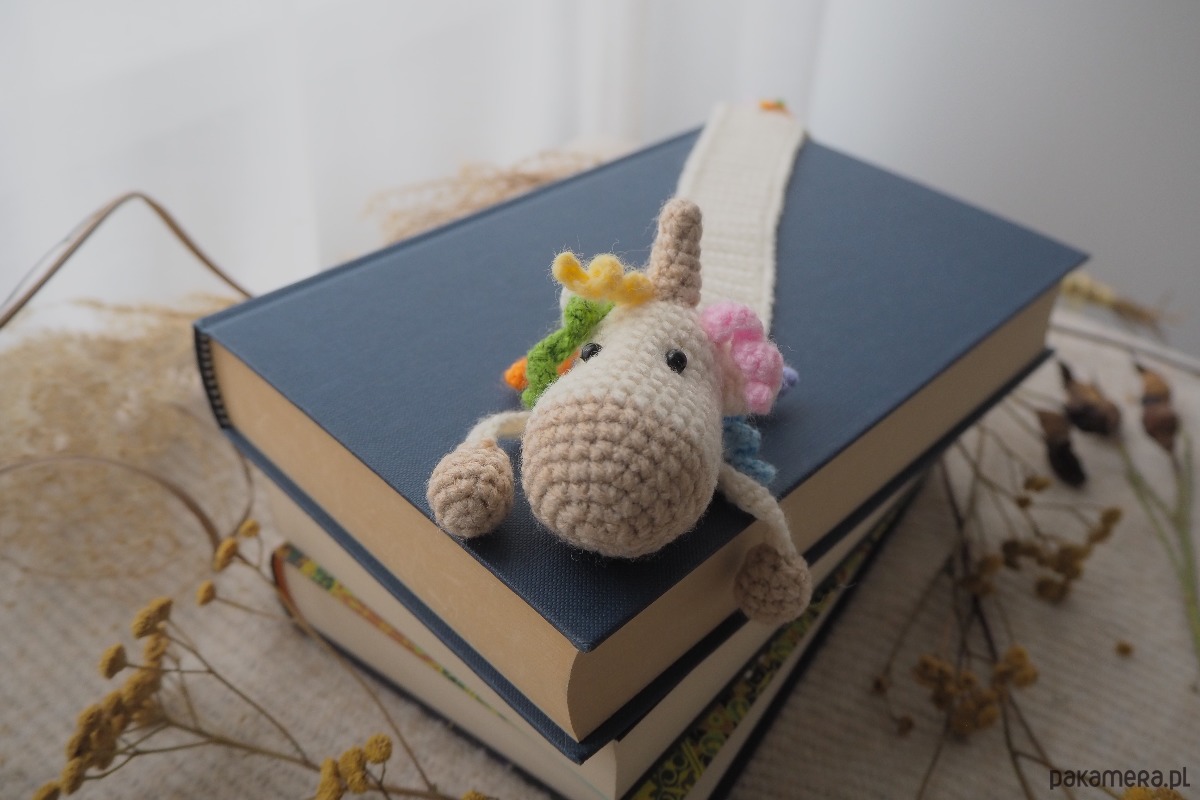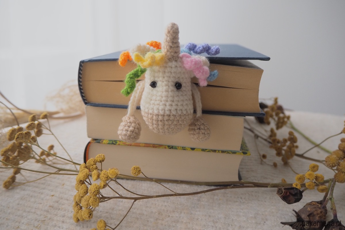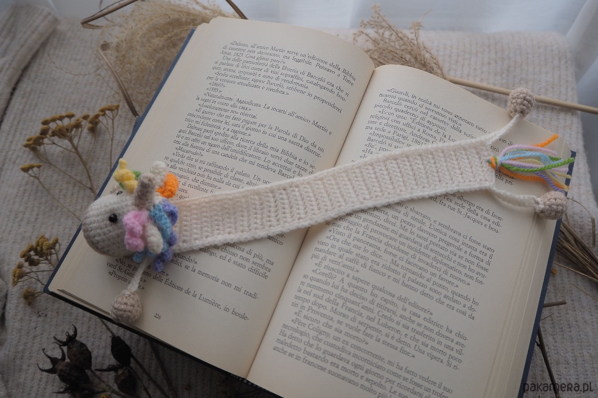 Zakładka do książki z sympatycznym jednorożcem wykonana z włóczki na szydełku.