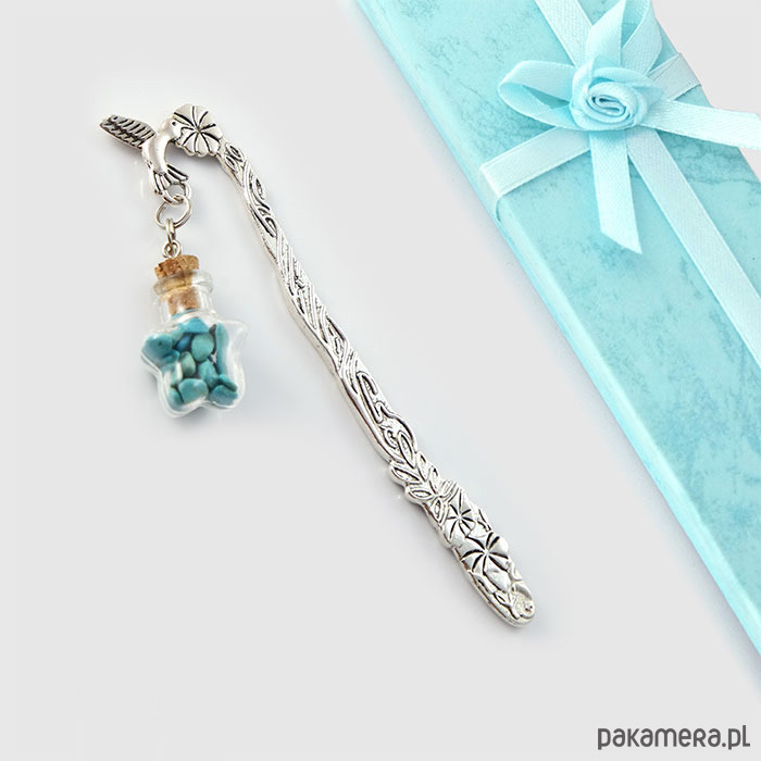 Wyjątkowa zakładka do książki z uroczą, malutką, szklaną buteleczką w kształcie gwiazdki, wypełnioną syntetycznym turkusem i zamkniętą koreczkiem.
