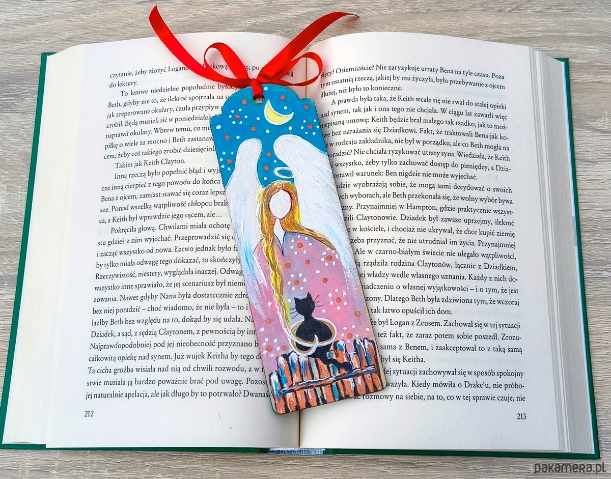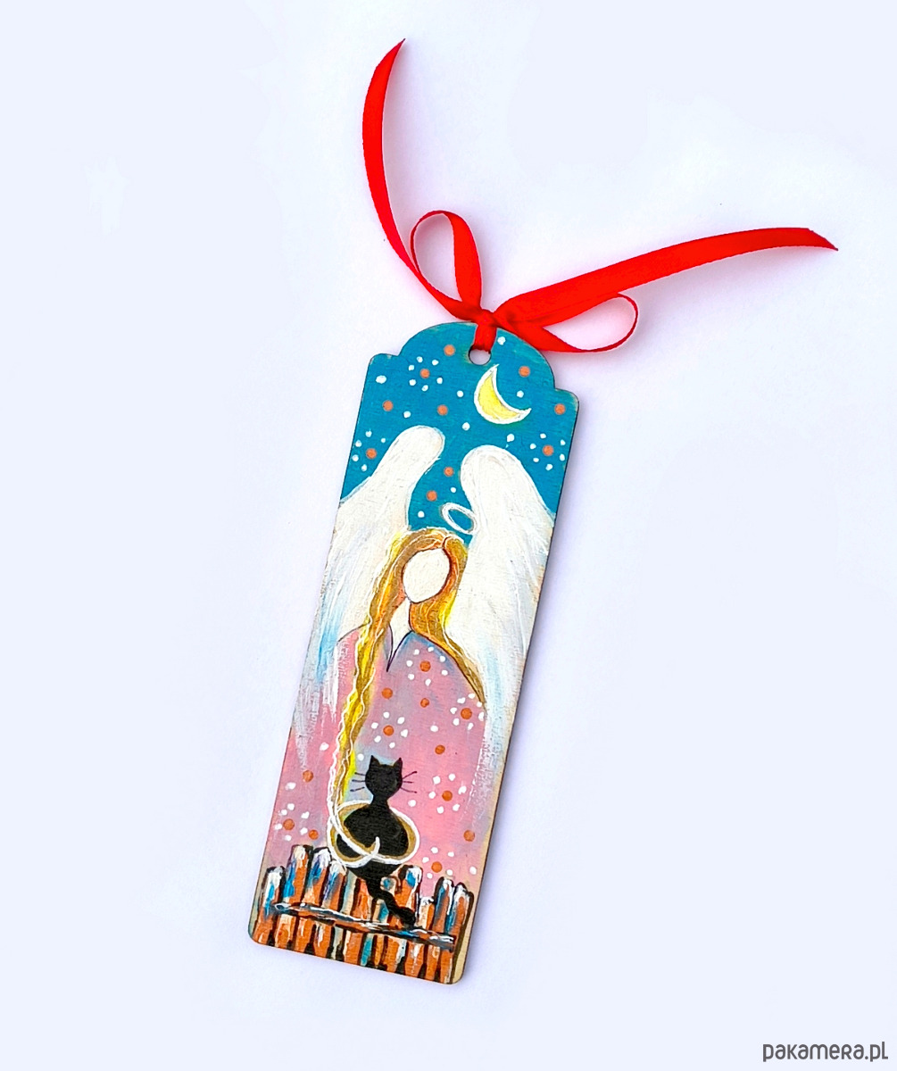 Wprowadź odrobinę magii do codzienności dzięki tej ręcznie wykonanej zakładce z ilustracją anioła. Zakładka malowana jest ręcznie, wykonana z drewna, zakończona ozdobną kokardką z czerwonej wstążki. Idealna jako prezent lub osobisty talizman do ulubionej książki.