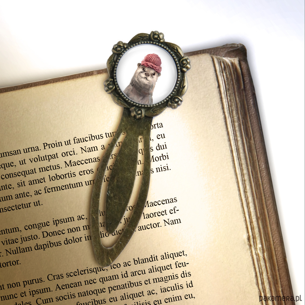 Grafika ukryta w pięknie zdobionej retro zakładce do książki pod osłoną przeźroczystego półokrągłego szkiełka.