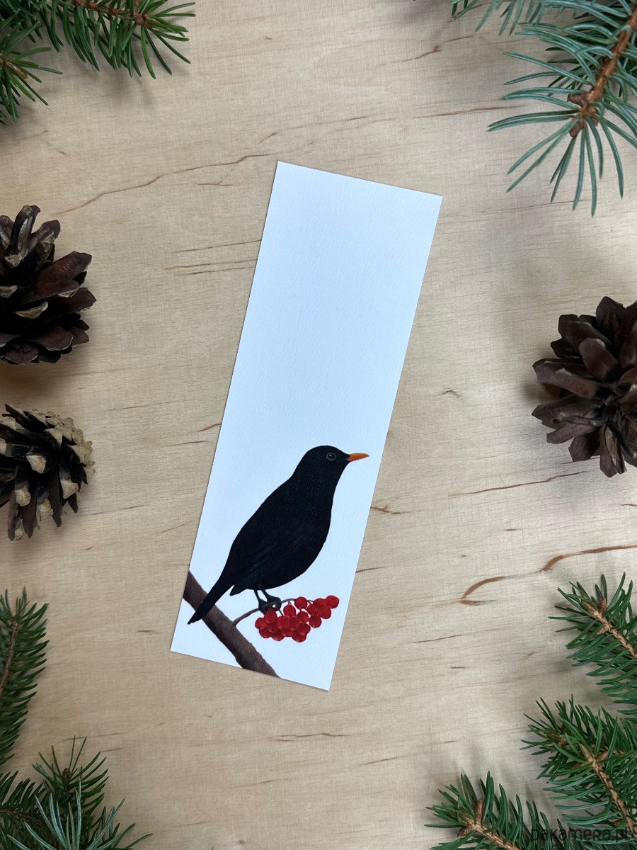 Zakładka z wydrukiem autorskiego malunku kosa na gałązce.