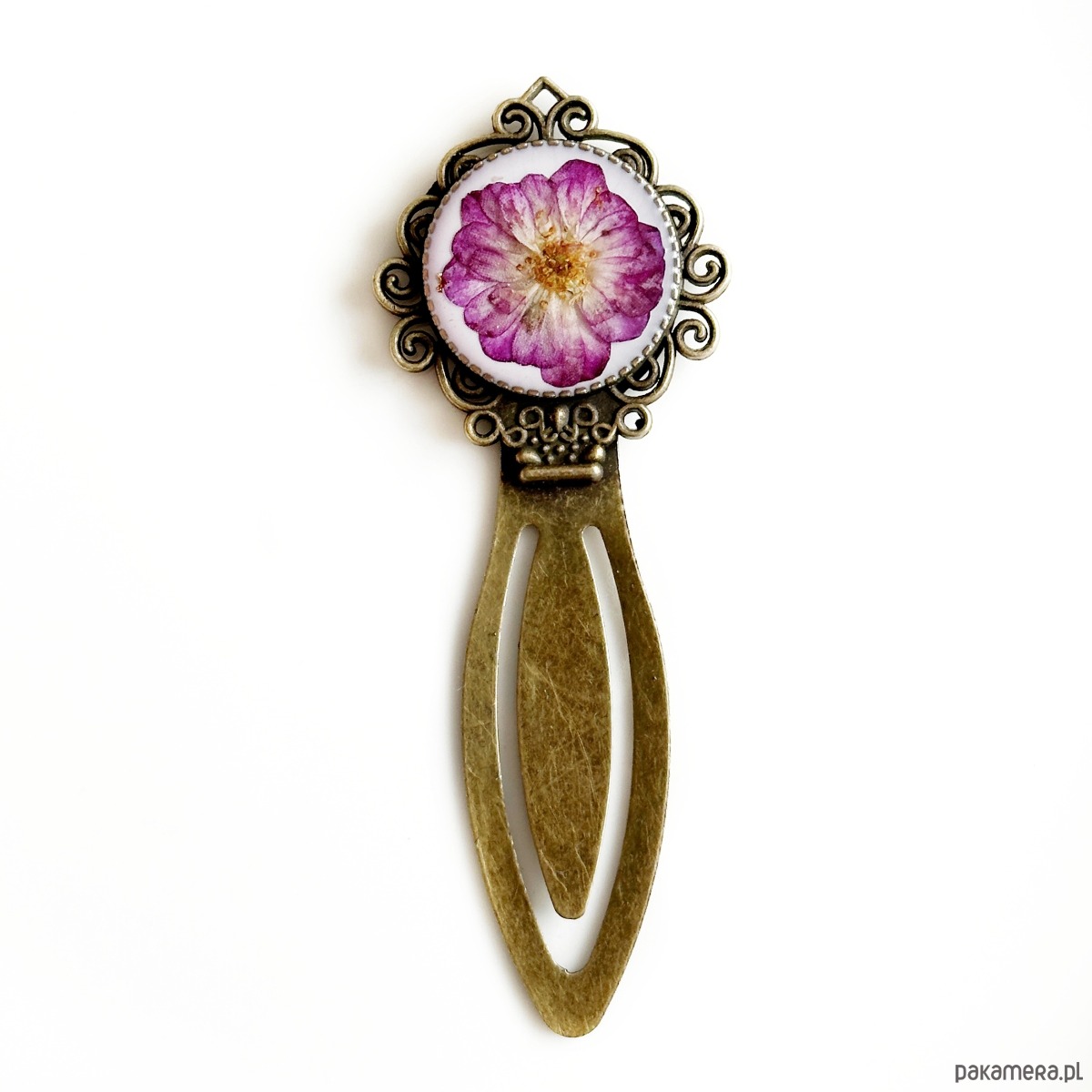 Zakładka do książki z suszonymi kwiatami zatopionymi w żywicy.