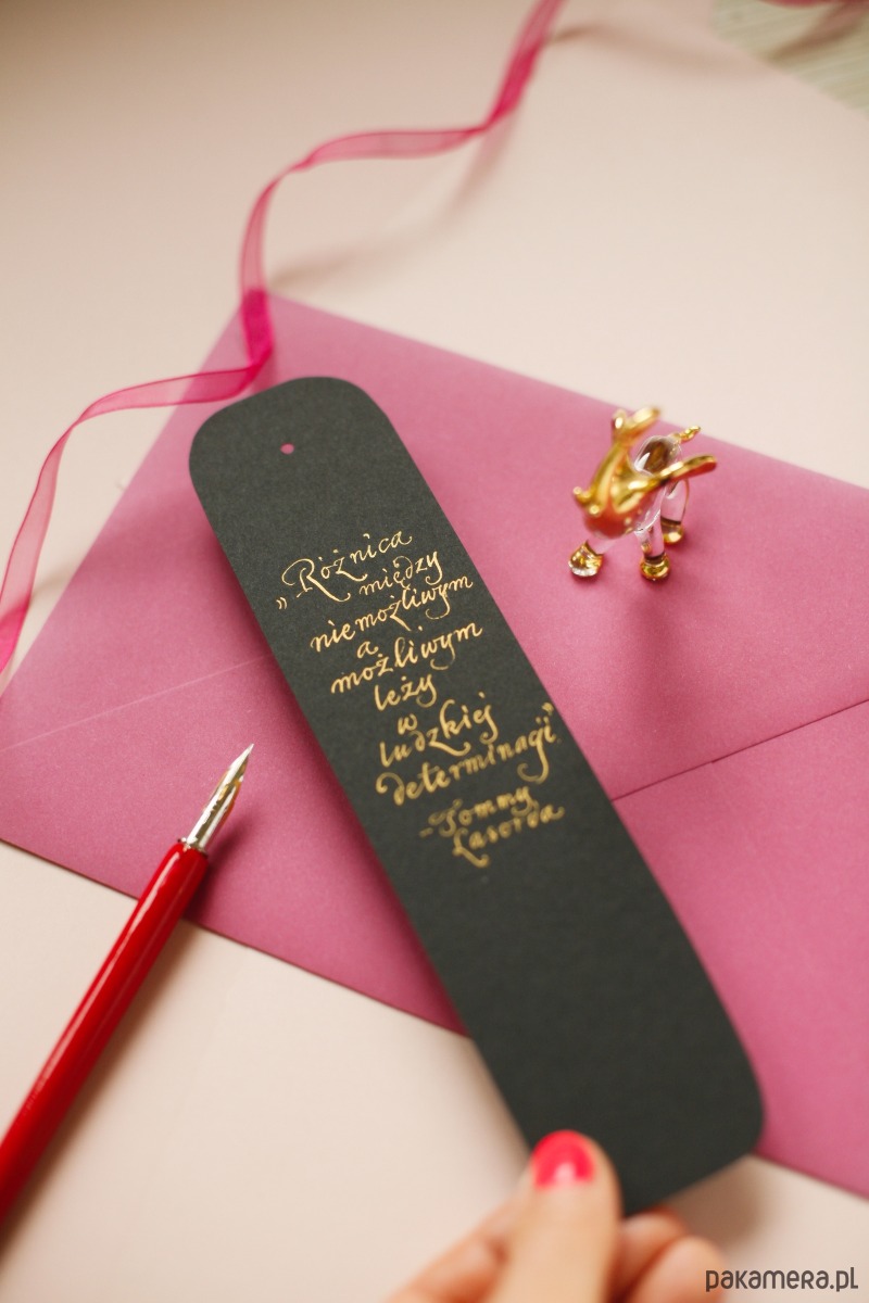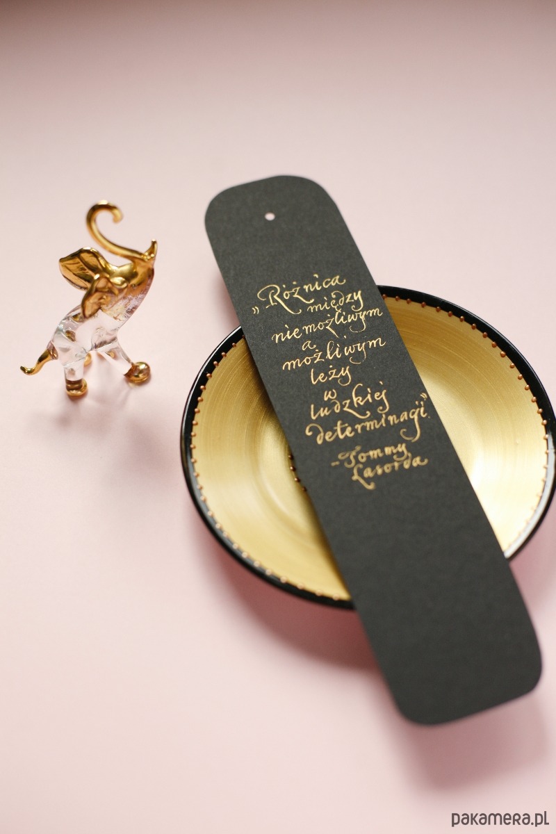 Ręcznie wykonana zakładka do książki z motywacyjnym cytatem napisanym złotym atramentem na czarnym papierze:
