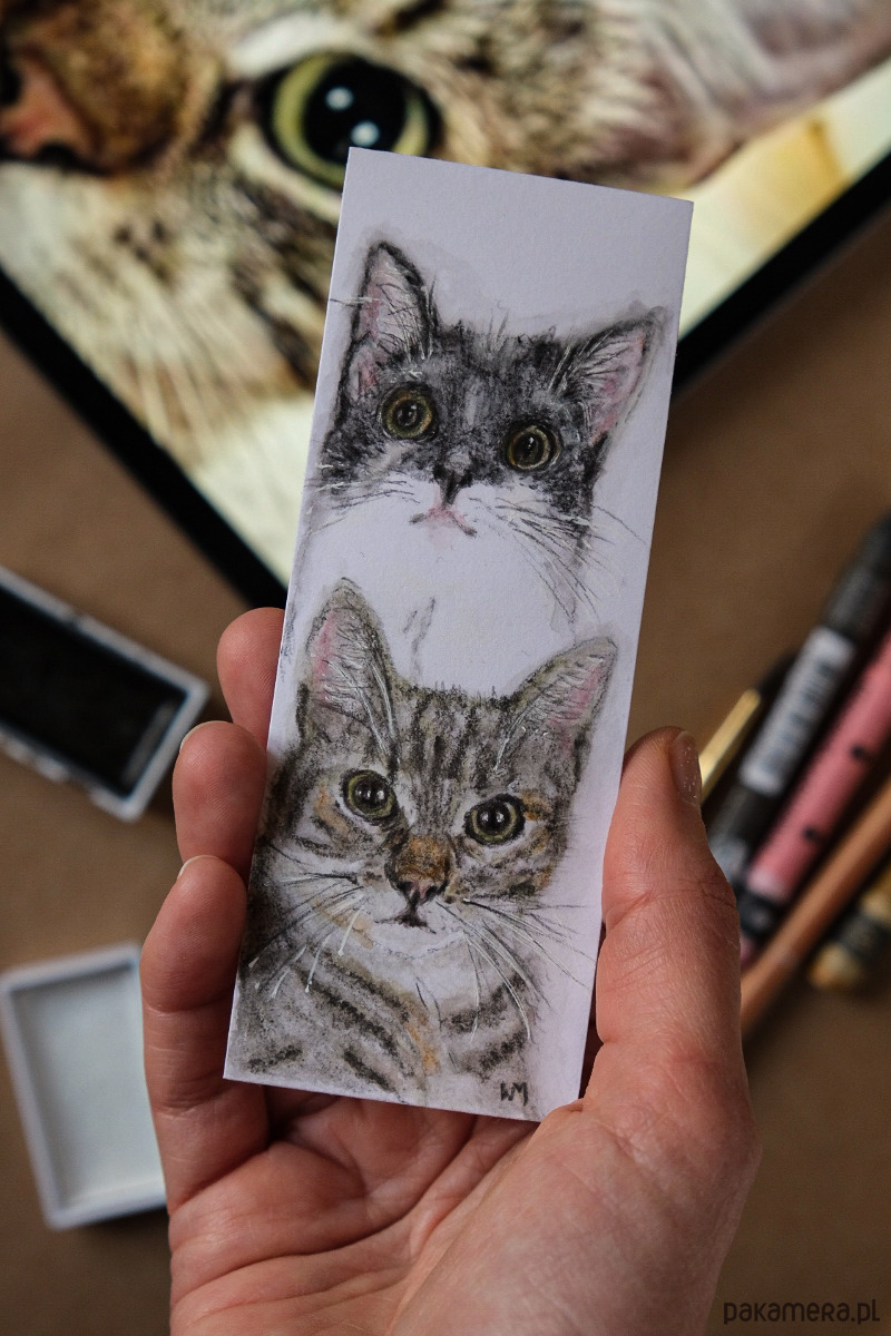 Zakładka w całości ręcznie wykonana. Rysowana ołówkiem, kredkami, akwarelą. Laminowana dwustronnie. Papier sztywny akwarelowy 250g.