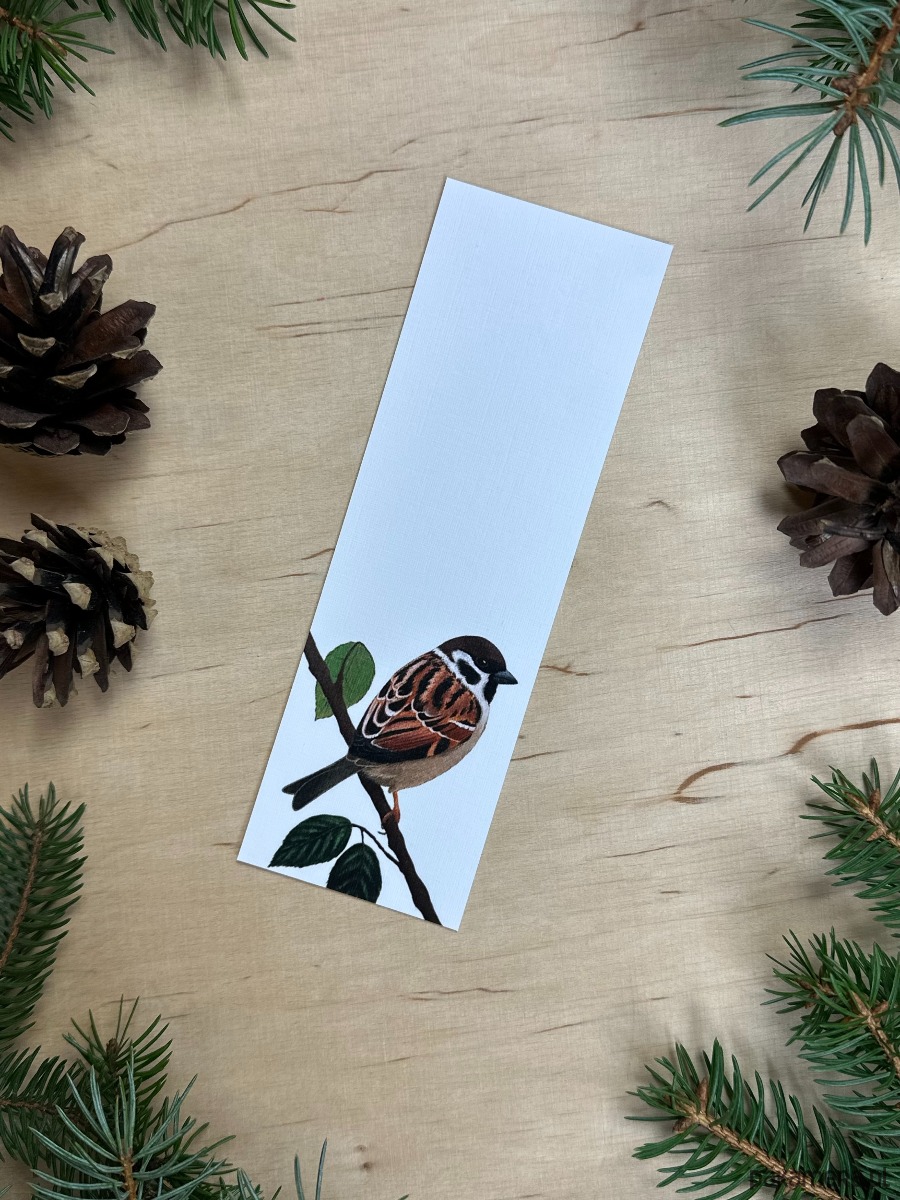 Zakładka z wydrukiem autorskiego malunku wróbelka.