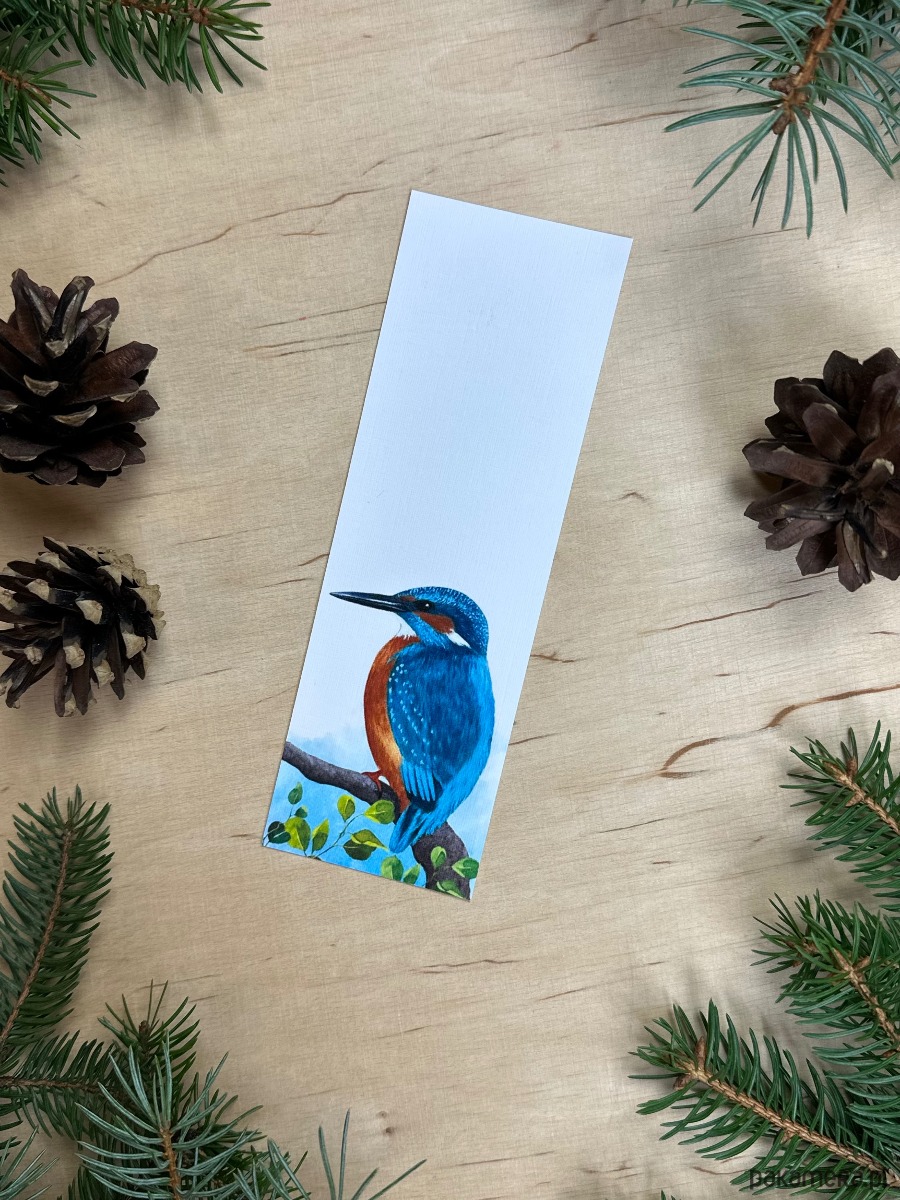 Zakładka z wydrukiem autorskiego malunku zimorodka na gałązce.