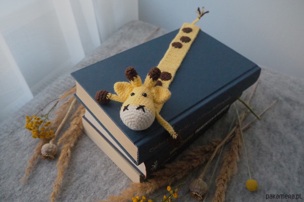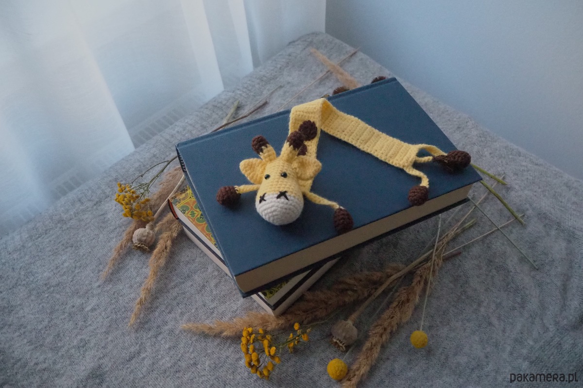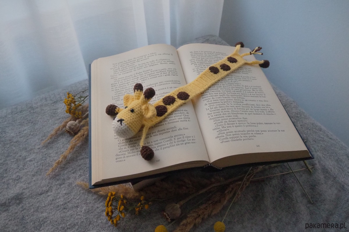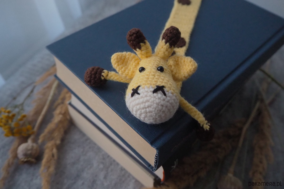 Zakładka do książki z sympatyczną żyrafą wykonana z włóczki na szydełku.